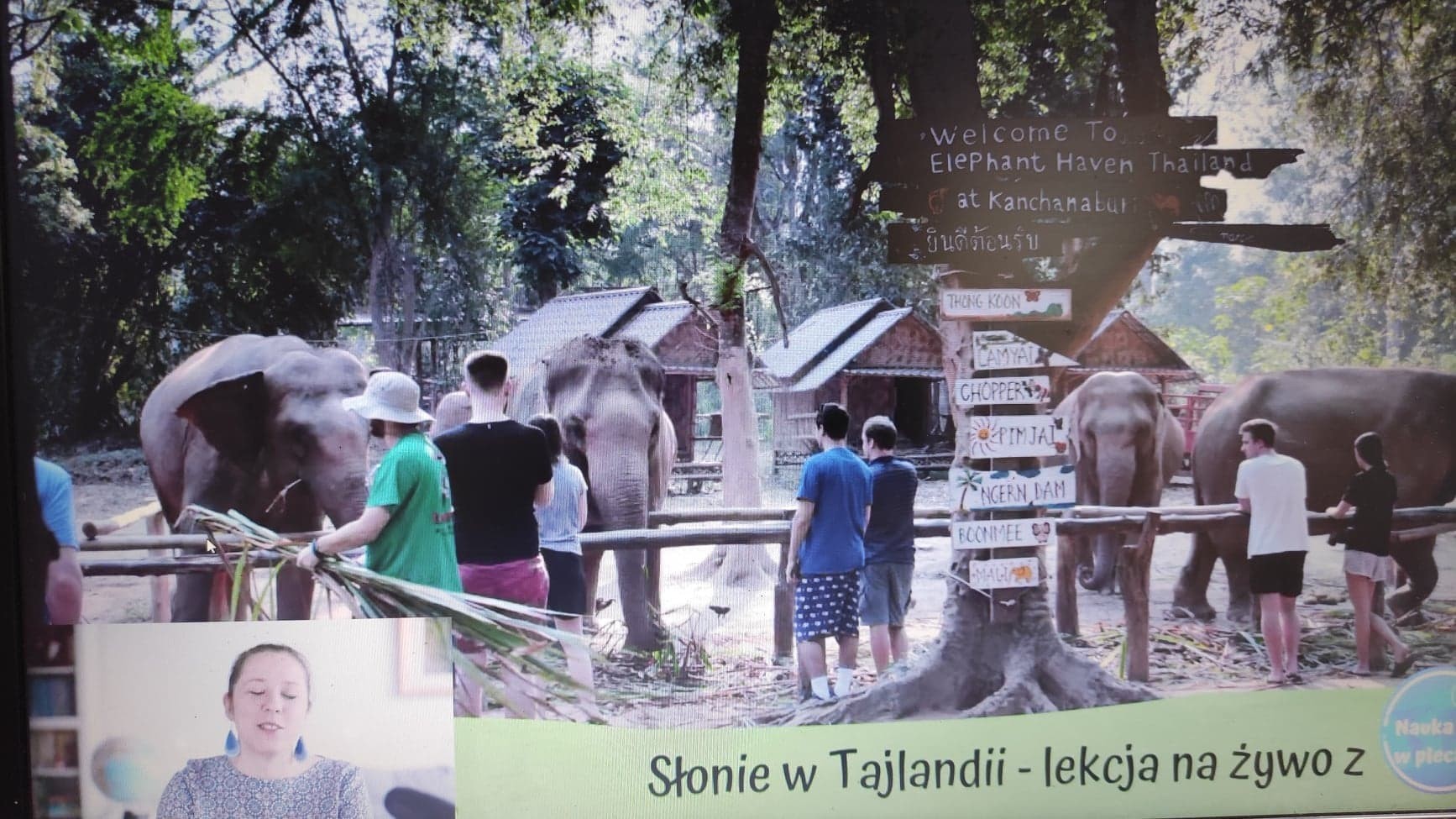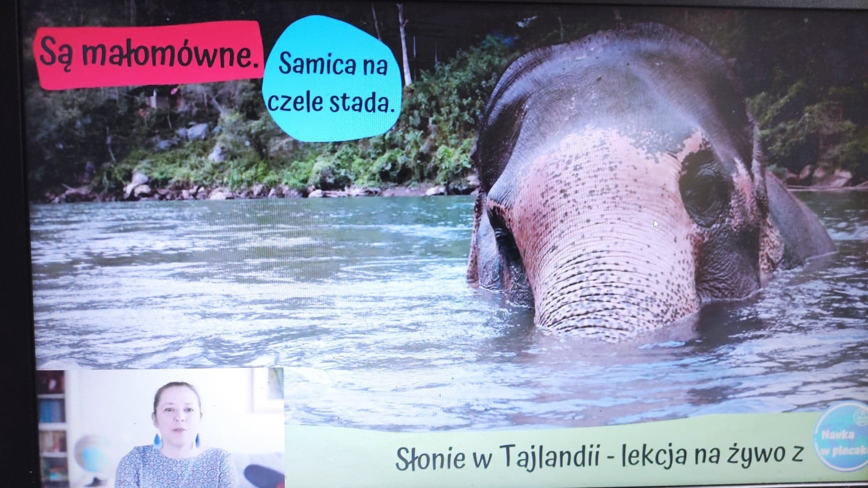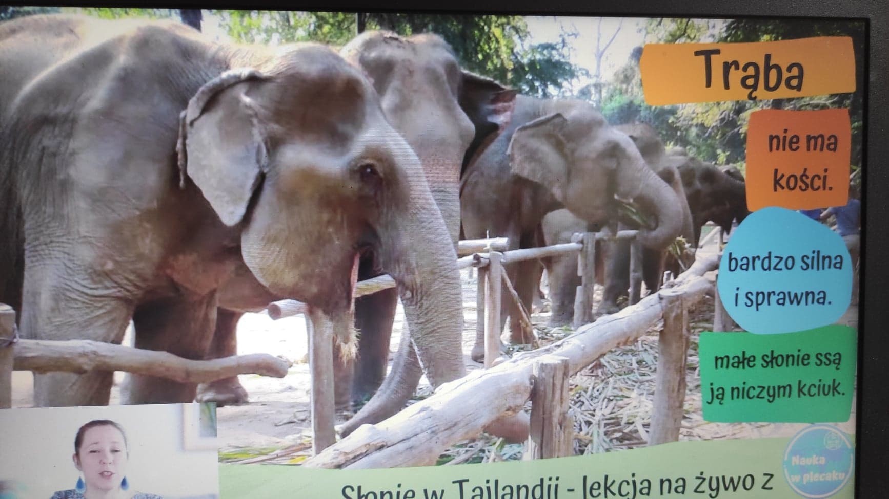 Klasy 5a, 4b i 3b brały udział w lekcji na żywo prowadzonej przez panią Sabinę Piłat, która prowadzi kanał pt. "Nauka w plecaku" z filmami edukacyjnymi nagrywanymi w podróży. Dzisiaj świętowaliśmy DZIEŃ OCHRONY SŁONI. Wybraliśmy się wspólnie do Tajlandii i zdobyliśmy sporo wiedzy o słoniach.