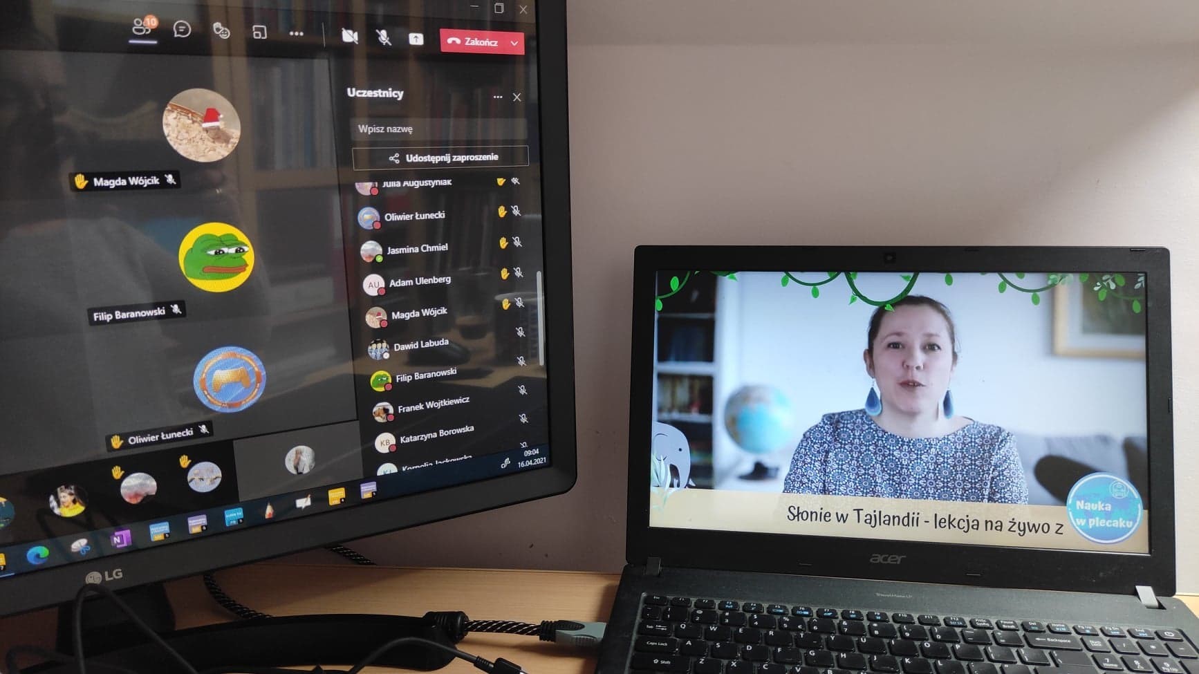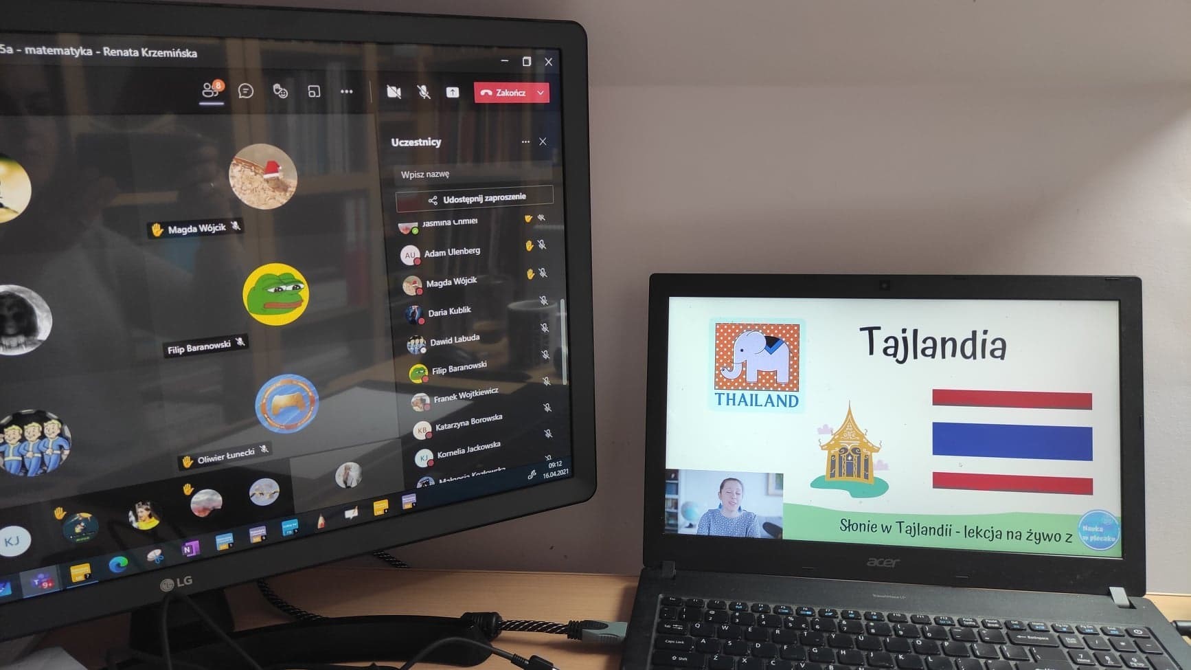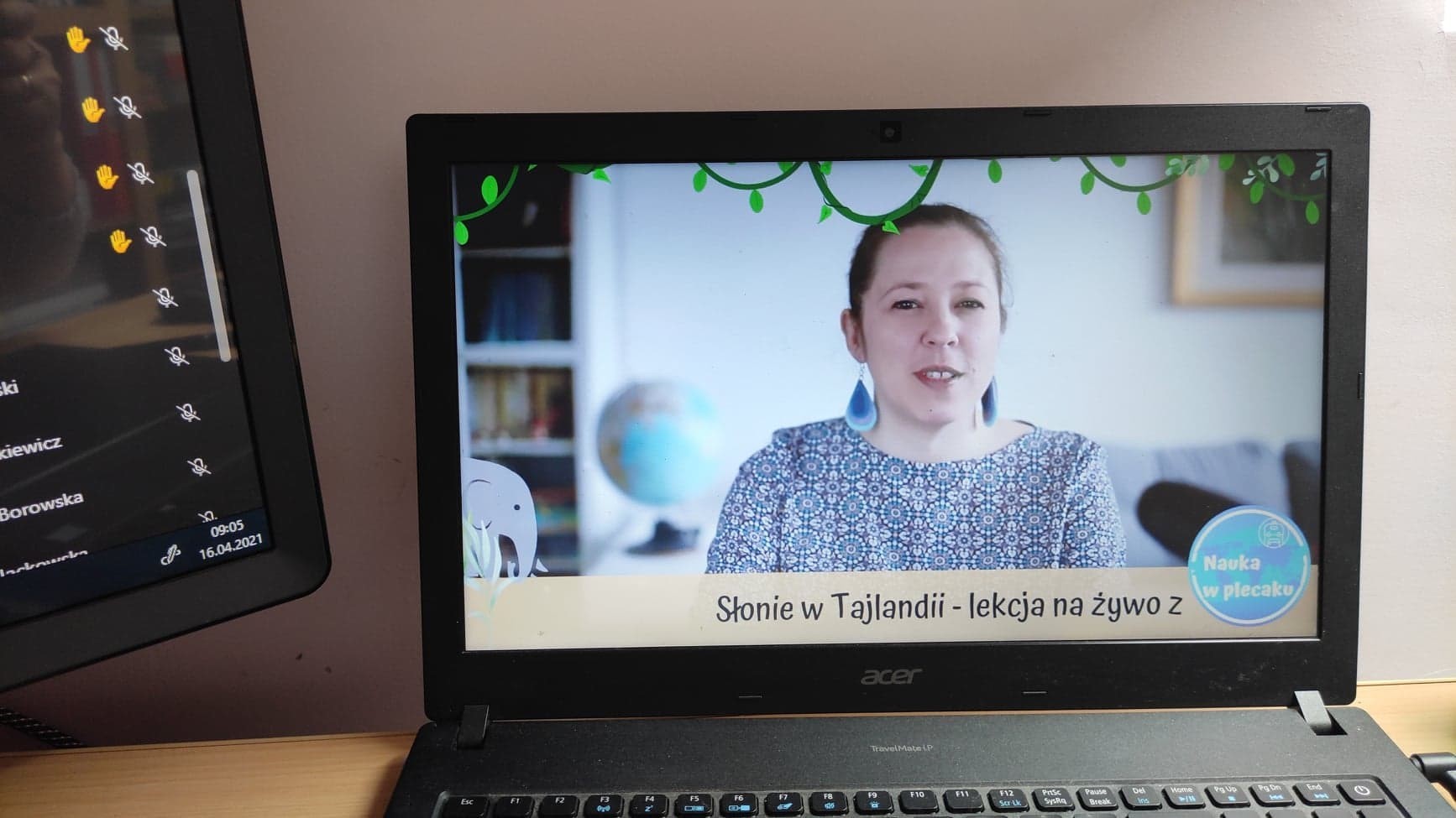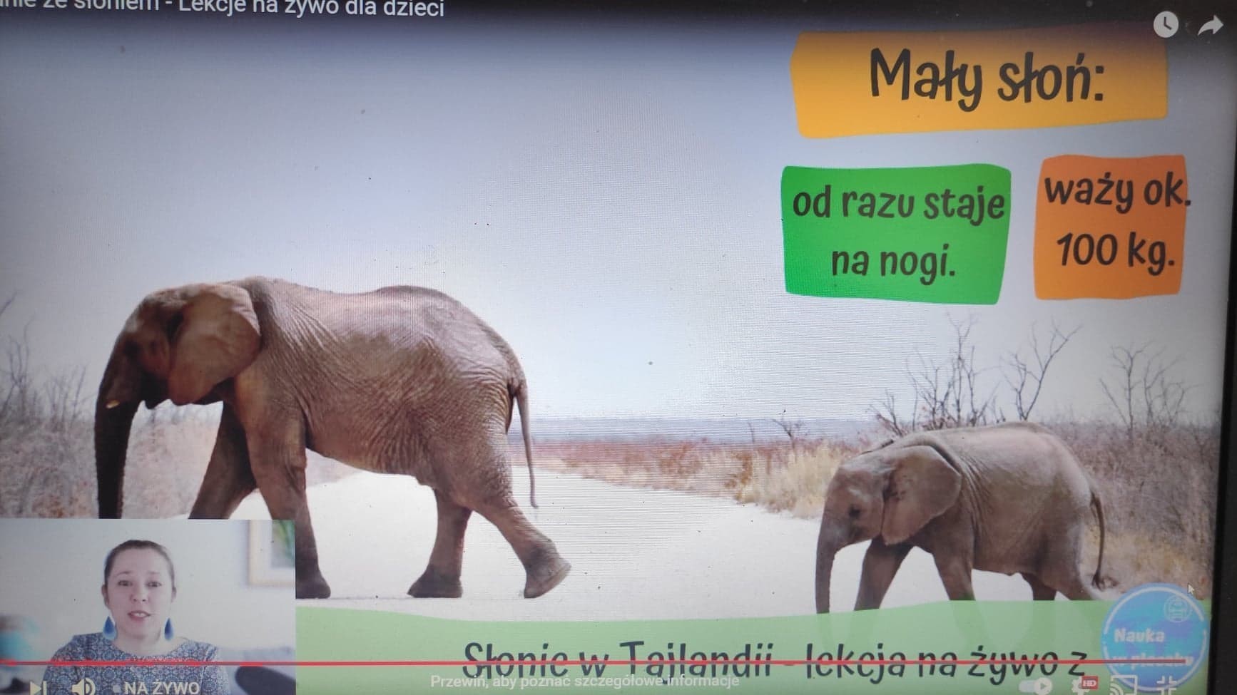 Klasy 5a, 4b i 3b brały udział w lekcji na żywo prowadzonej przez panią Sabinę Piłat, która prowadzi kanał pt. "Nauka w plecaku" z filmami edukacyjnymi nagrywanymi w podróży. Dzisiaj świętowaliśmy DZIEŃ OCHRONY SŁONI. Wybraliśmy się wspólnie do Tajlandii i zdobyliśmy sporo wiedzy o słoniach.