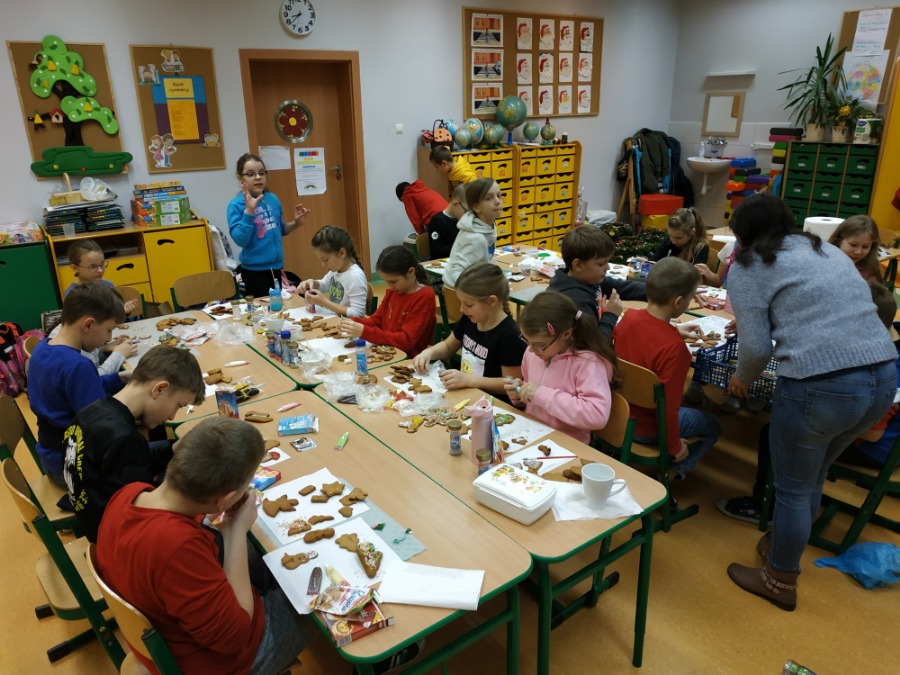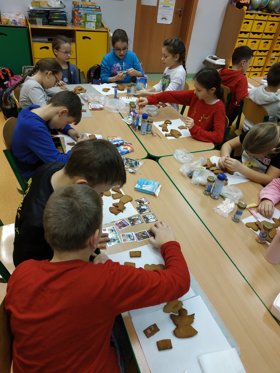 Uczniowie klasy 3 A wraz z rodzicami przygotowywali pierniki. Każde dziecko zaopatrzone było w akcesoria potrzebne do pracy, a więc wałek, foremki, fartuszki, podkładki. Dzięki pomocy rodziców wszystko sprawnie przebiegło. Każdy z uśmiechem na twarzy rozgniatał ciasto, wałkował, a następnie wykrawał przeróżne kształty pierników. Efekty naszej pracy były widoczne już po kilku minutach od upieczenia. Po paru dniach przyszedł czas na ich ozdabianie, przy pomocy licznych pisaków cukrowych, posypek, lukru wyszły Nam przepiękne pierniczki. Podczas pracy gościła wzajemna współpraca pomiędzy kolegami i koleżankami. Teraz czekamy już tylko na ich zjedzenie.