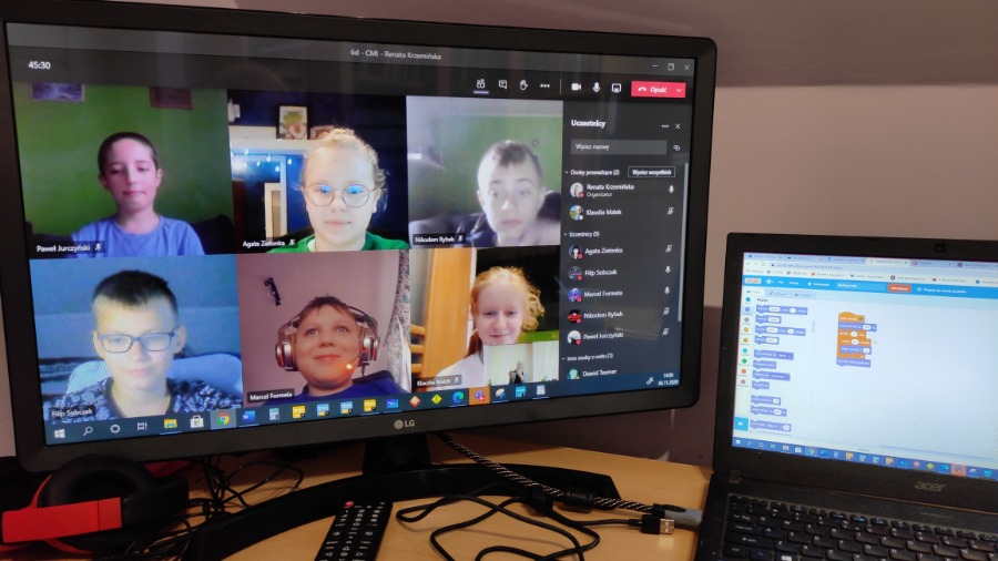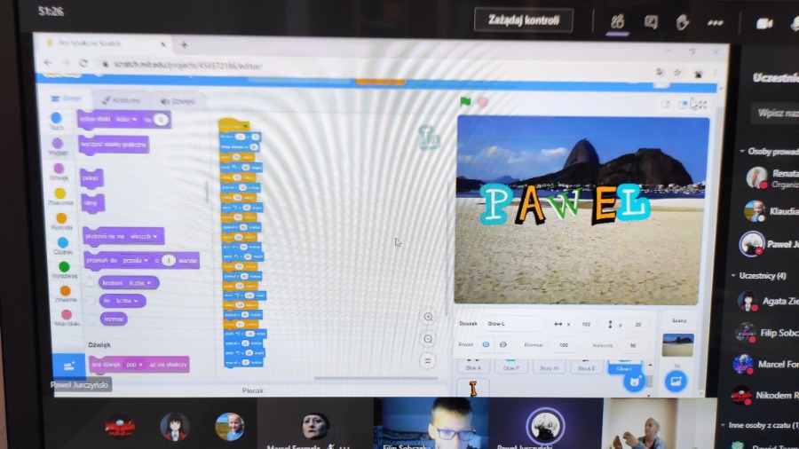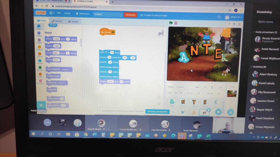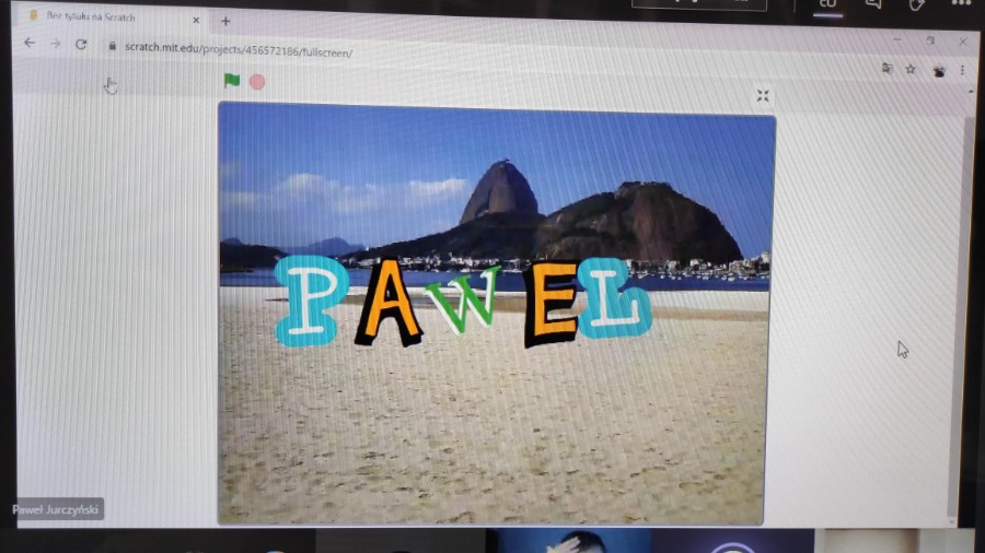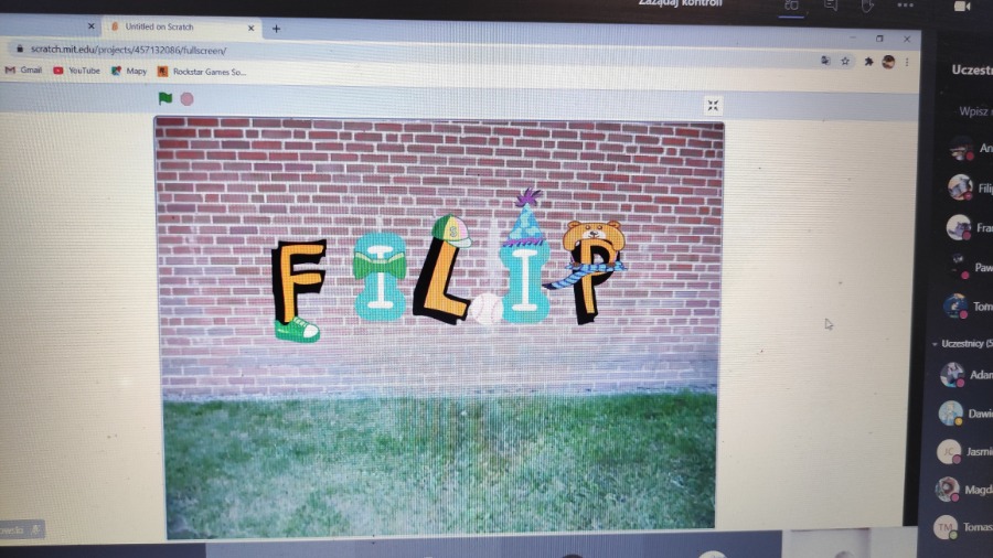 Na zdalnych zajęciach koła informatycznego tworzyliśmy projekt pt. Animuj swoje imię. Nasze litery podskakiwały, zmieniały wielkość, szybowały, wydawały dźwięki i pięknie były przyozdobione.