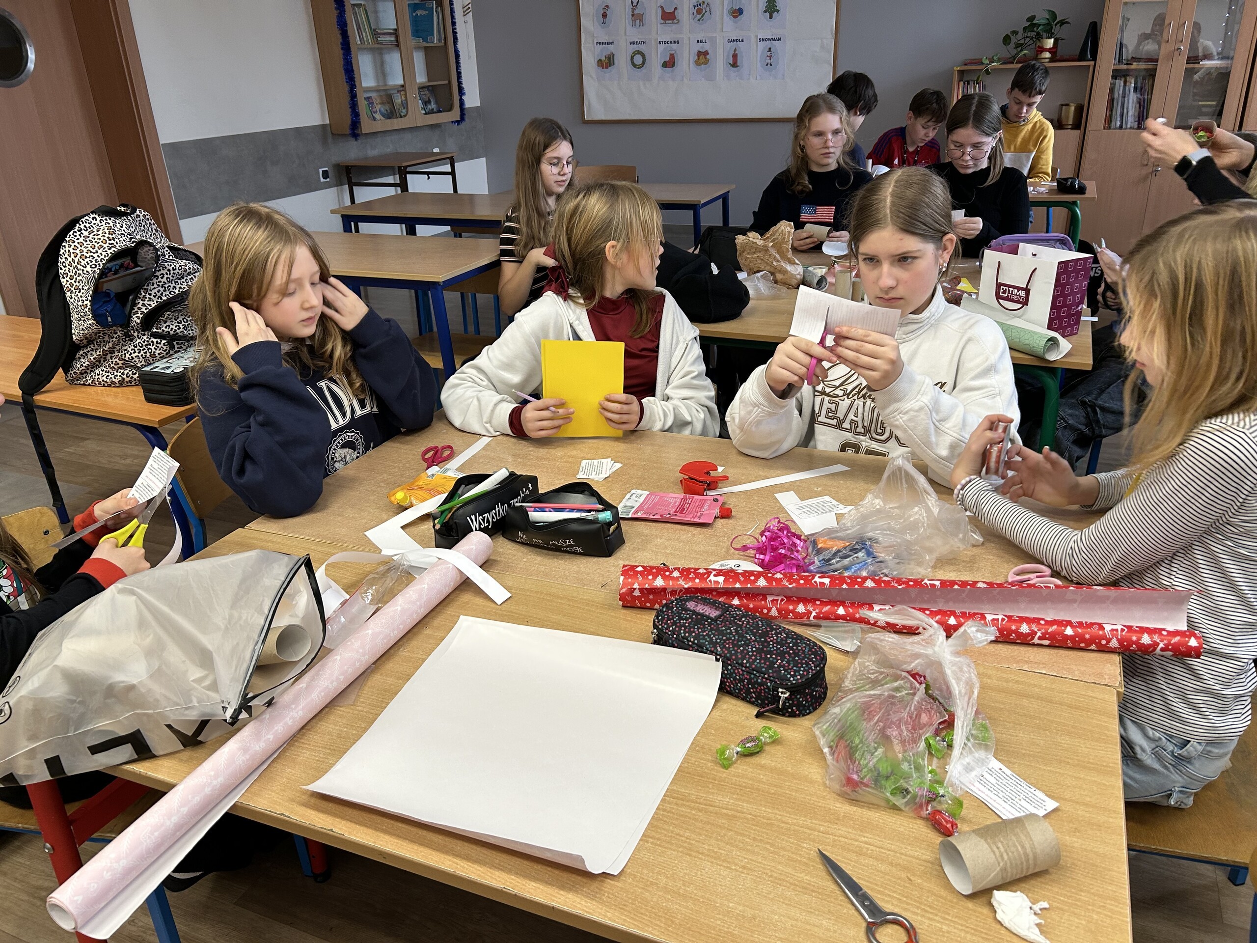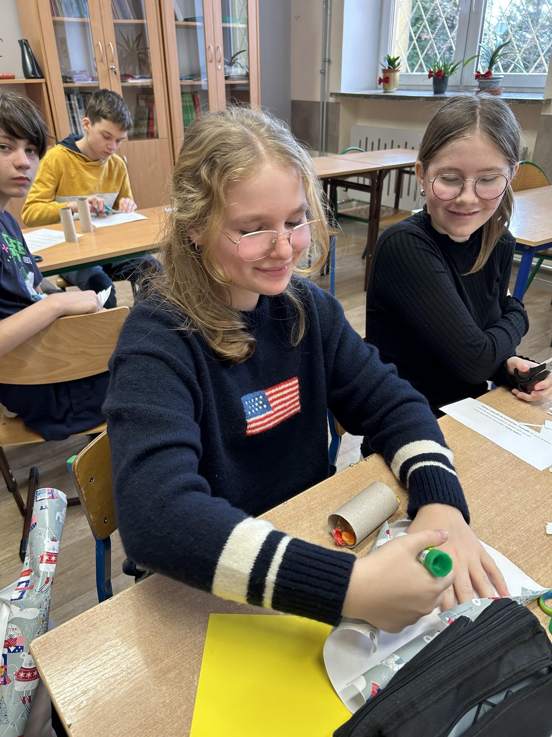 W poniedziałek, 12 grudnia, uczniowie uczęszczający na kółka zainteresowań z języka angielskiego "English Corner" oraz "Let's do it better" przygotowywali Christmas Crackers czyli ozdobne tubki przypominające wielkie cukierki, popularne w Wielkiej Brytanii i innych krajach anglojęzycznych. W środku kryją się drobne upominki, motto i papierowa korona. Prezenty zostały rozdane nauczycielom uczącym w naszej szkole.