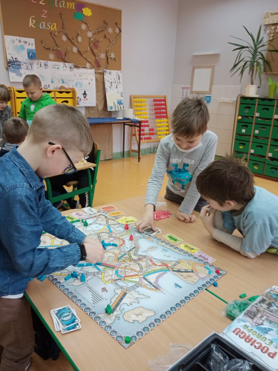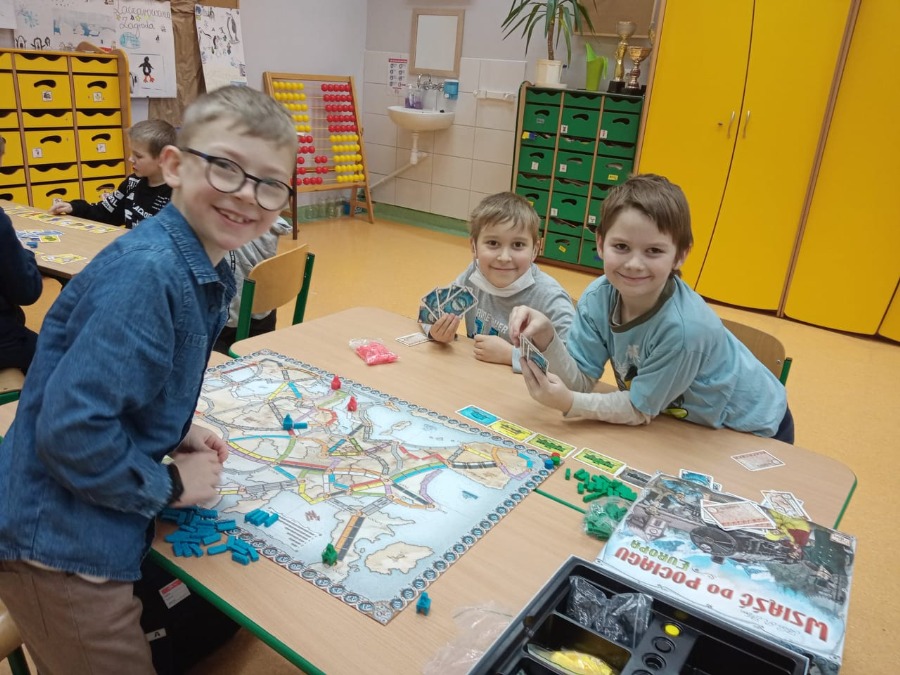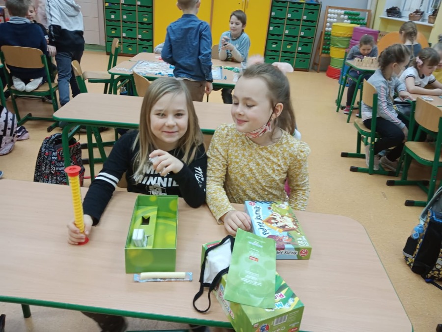 Na ostatnie zajęcia dzieci z klasy I a przyniosły swoje ulubione gry planszowe. Poznaliśmy zasady obowiązujące w grach. Wszyscy mieli okazję zgodnie współpracować w zespole, ćwiczyć koncentrację, logiczne myślenie i wyobraźnię, czasem też uczyć się radzić z porażką. Było ciekawie.