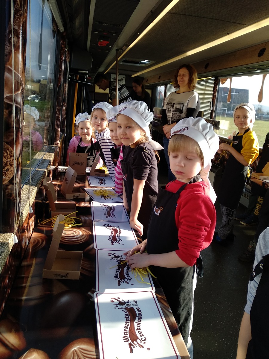 Grupa O a uczestniczyła w słodkich warsztatach w czekoladowym autobusie. Dzieci miały okazję dowiedzieć się z czego tak naprawdę zrobiony jest ten słodki przysmak , zrobiły też własne czekoladki i brały udział w konkursie z nagrodami. Było słodko i sympatycznie