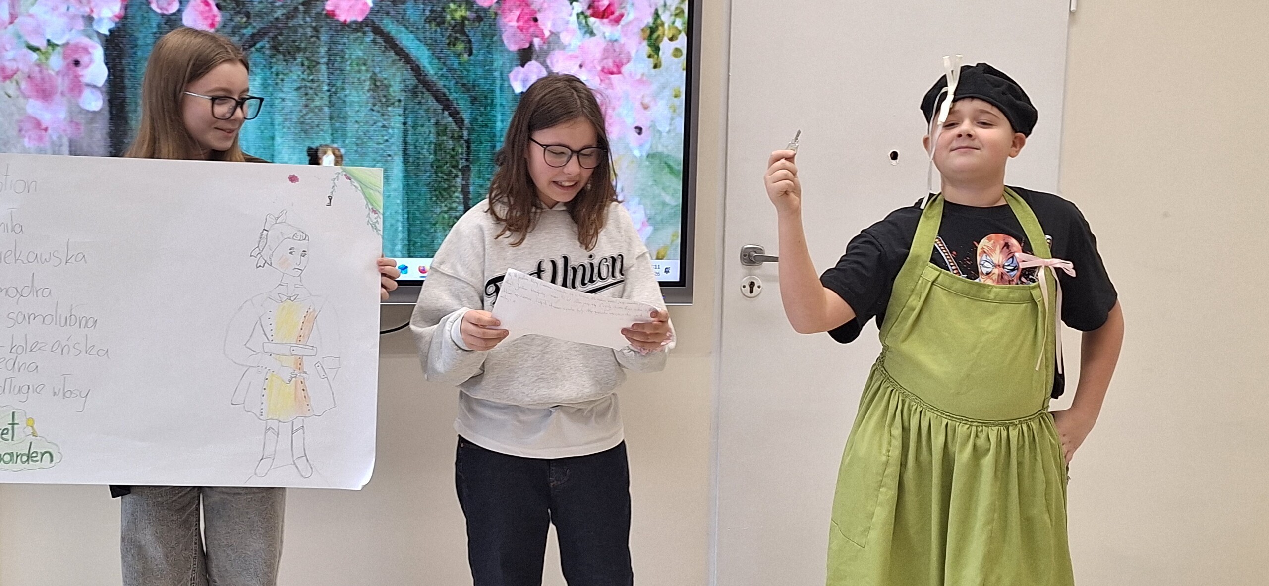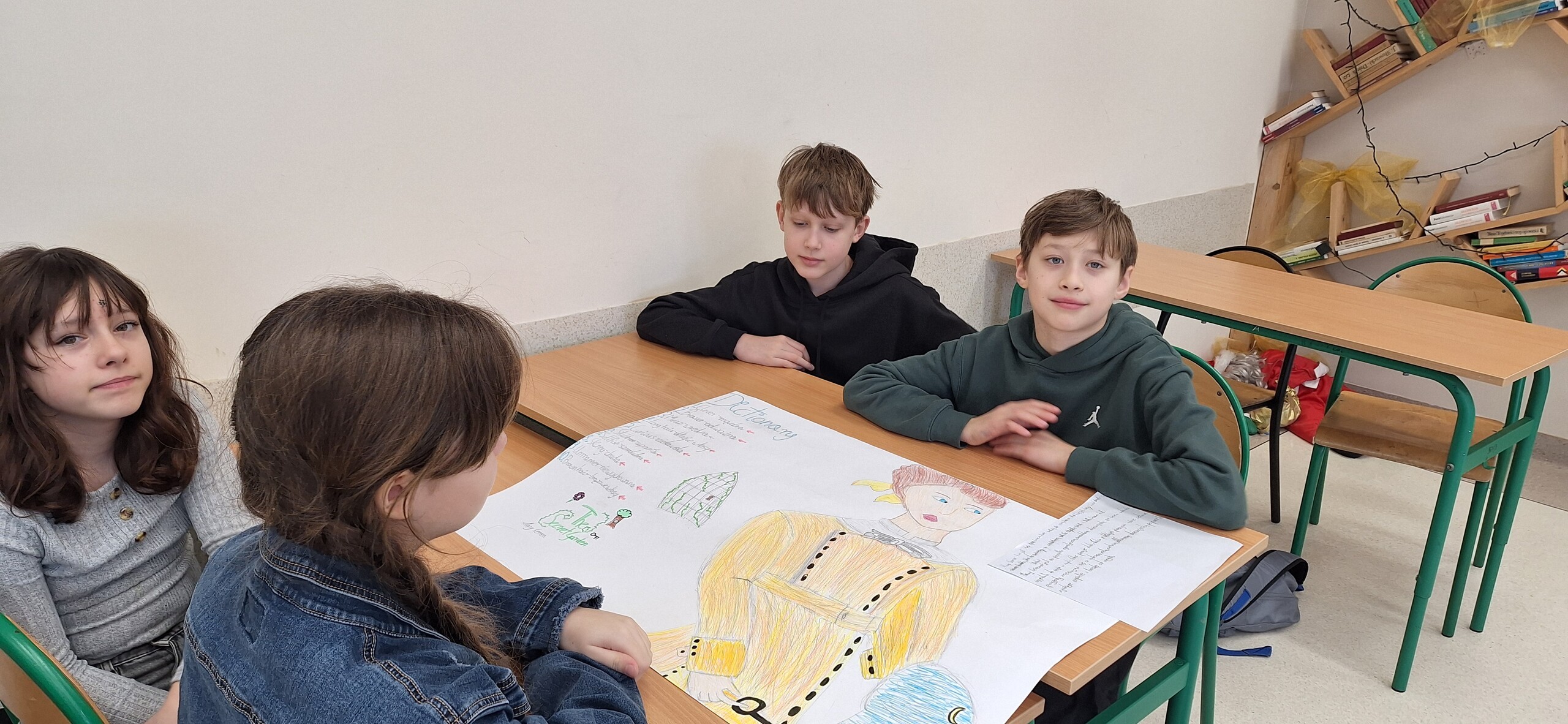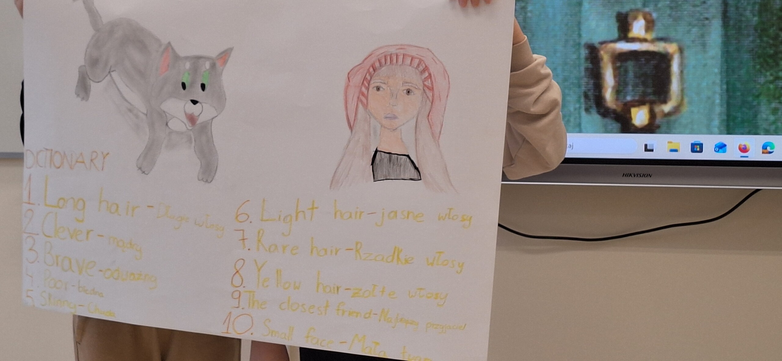 Uczniowie klasy 5a uczestniczyli w międzyprzedmiotowym projekcie łączącym treści z języka polskiego i angielskiego. Tematem przewodnim zajęć było tworzenie wizerunku bohaterów literackich wybranych lektur. Uczniowie pracując w grupach, zajmowali się charakterystyką postaci w obu językach, opisywali wygląd zewnętrzny i cechy charakteru, redagowali słowniki, wykorzystując najciekawsze wyrażenia i zwroty dotyczące opisu.