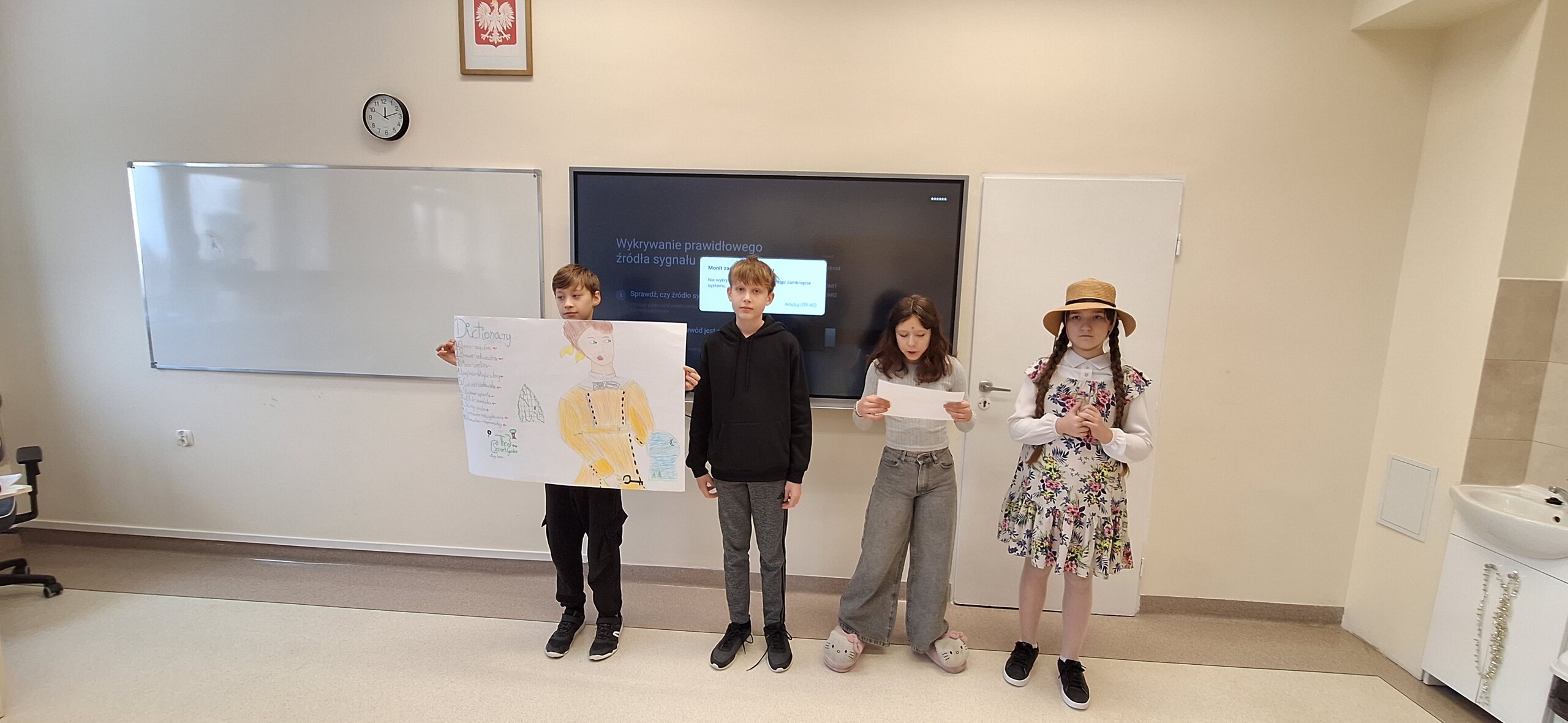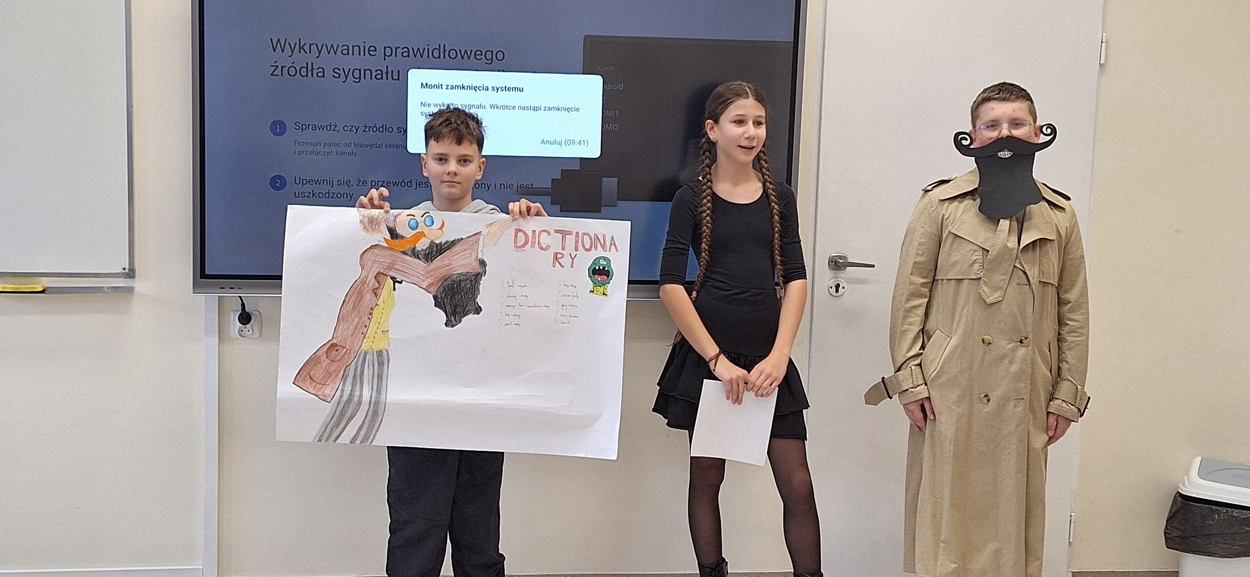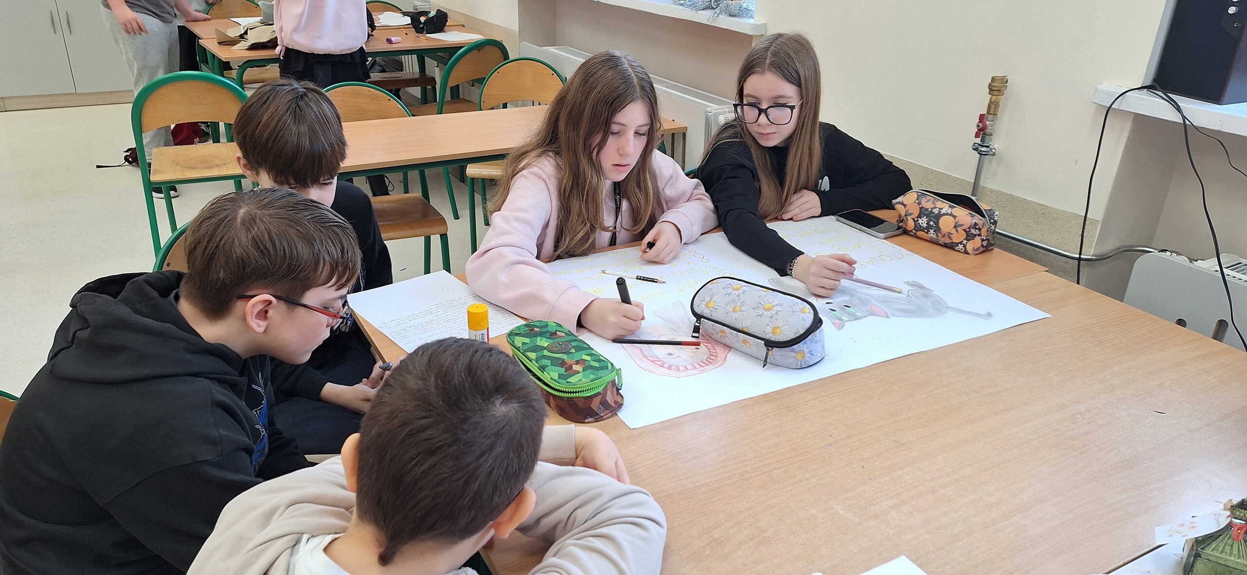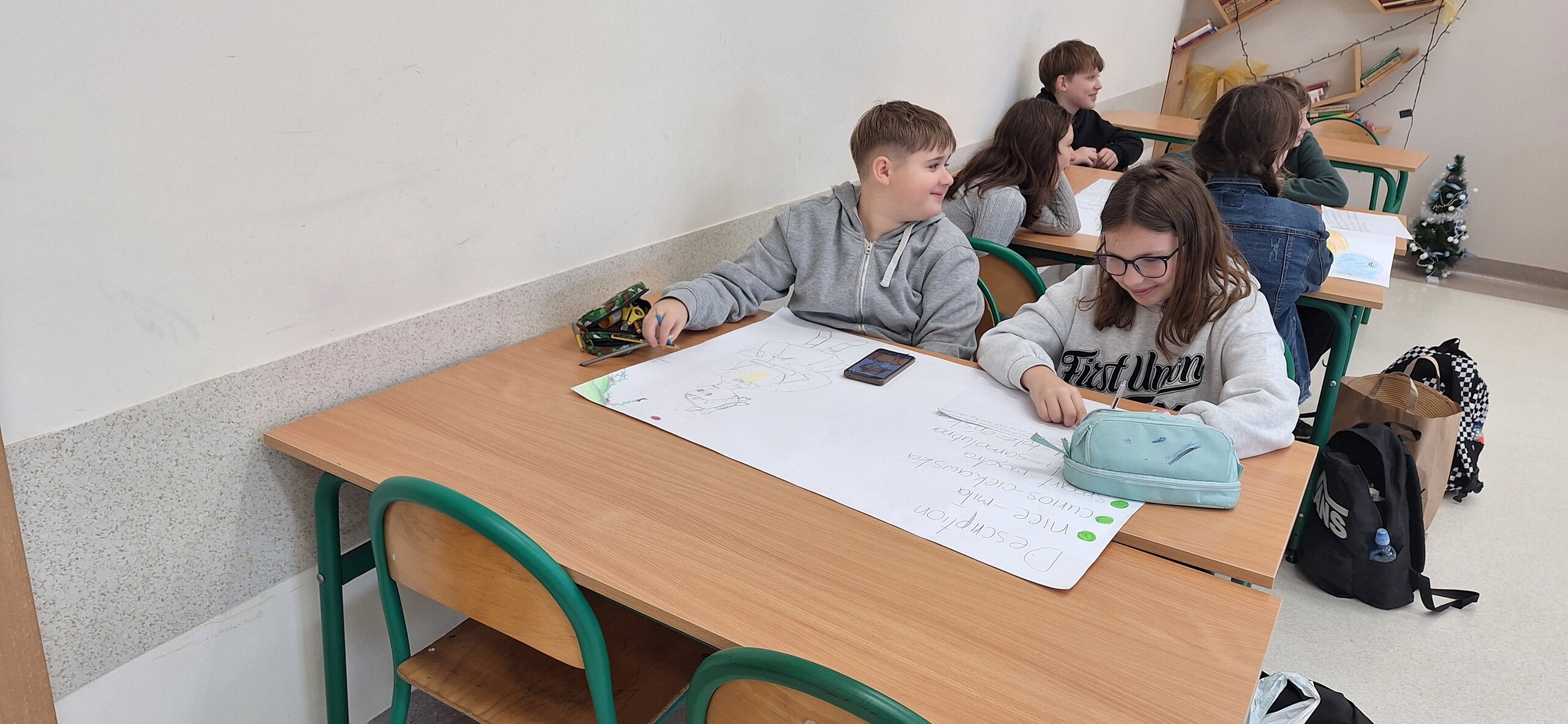 Uczniowie klasy 5a uczestniczyli w międzyprzedmiotowym projekcie łączącym treści z języka polskiego i angielskiego. Tematem przewodnim zajęć było tworzenie wizerunku bohaterów literackich wybranych lektur. Uczniowie pracując w grupach, zajmowali się charakterystyką postaci w obu językach, opisywali wygląd zewnętrzny i cechy charakteru, redagowali słowniki, wykorzystując najciekawsze wyrażenia i zwroty dotyczące opisu.