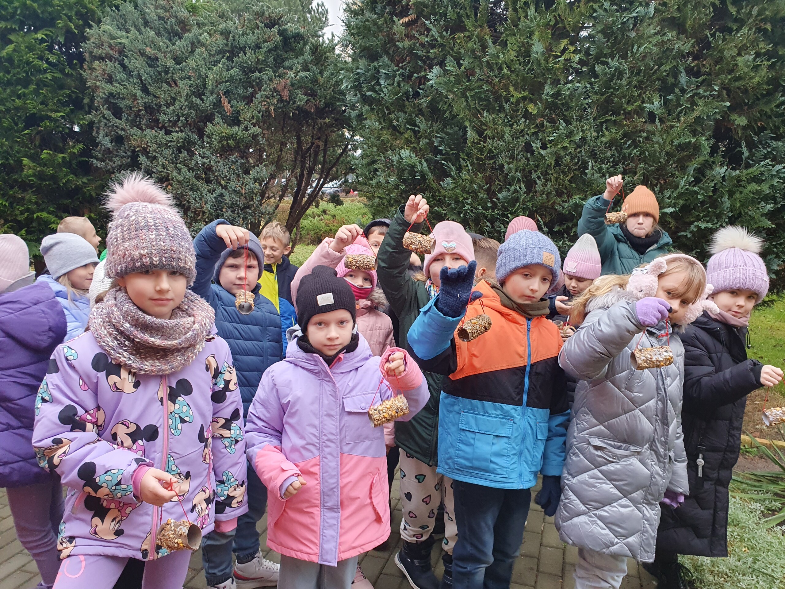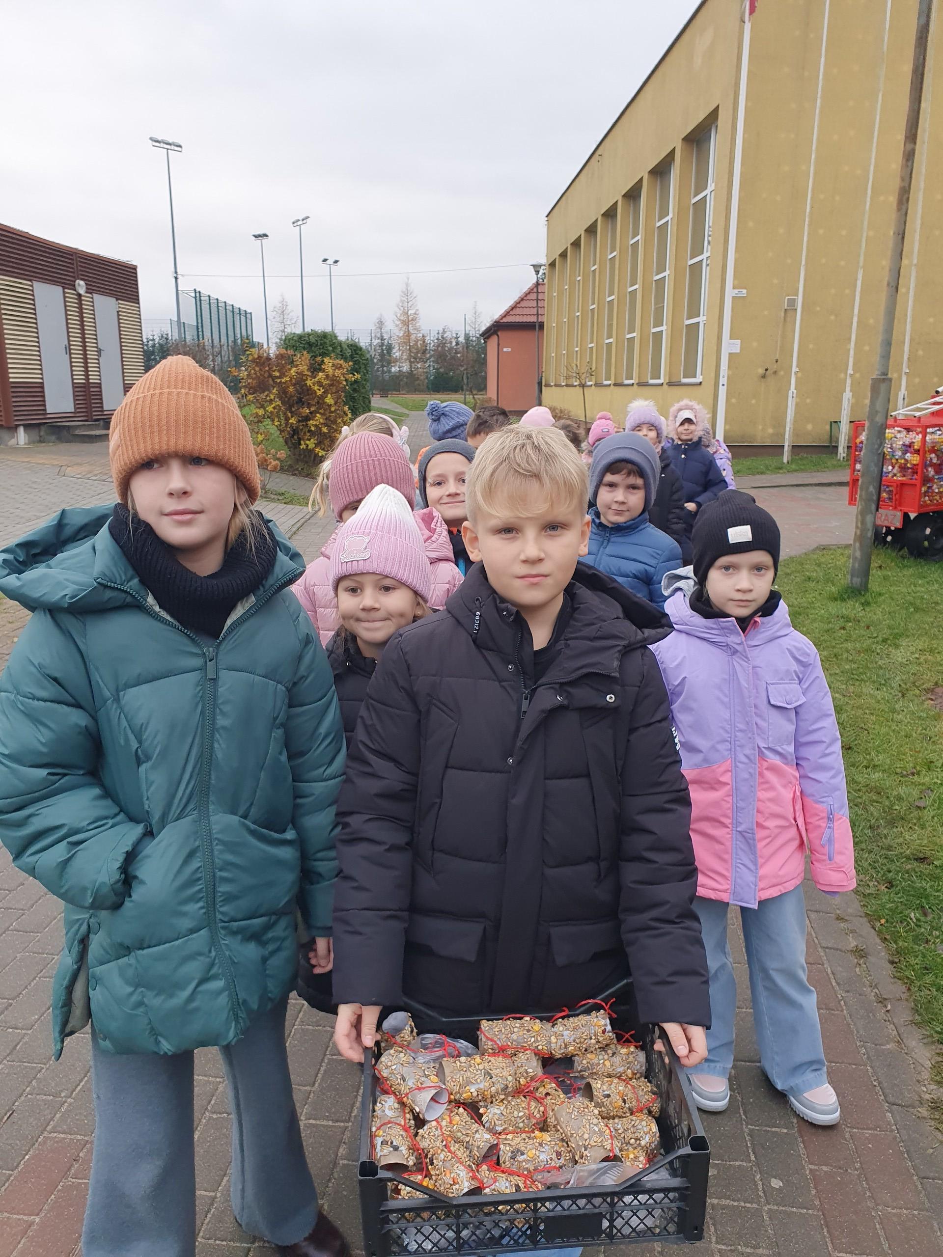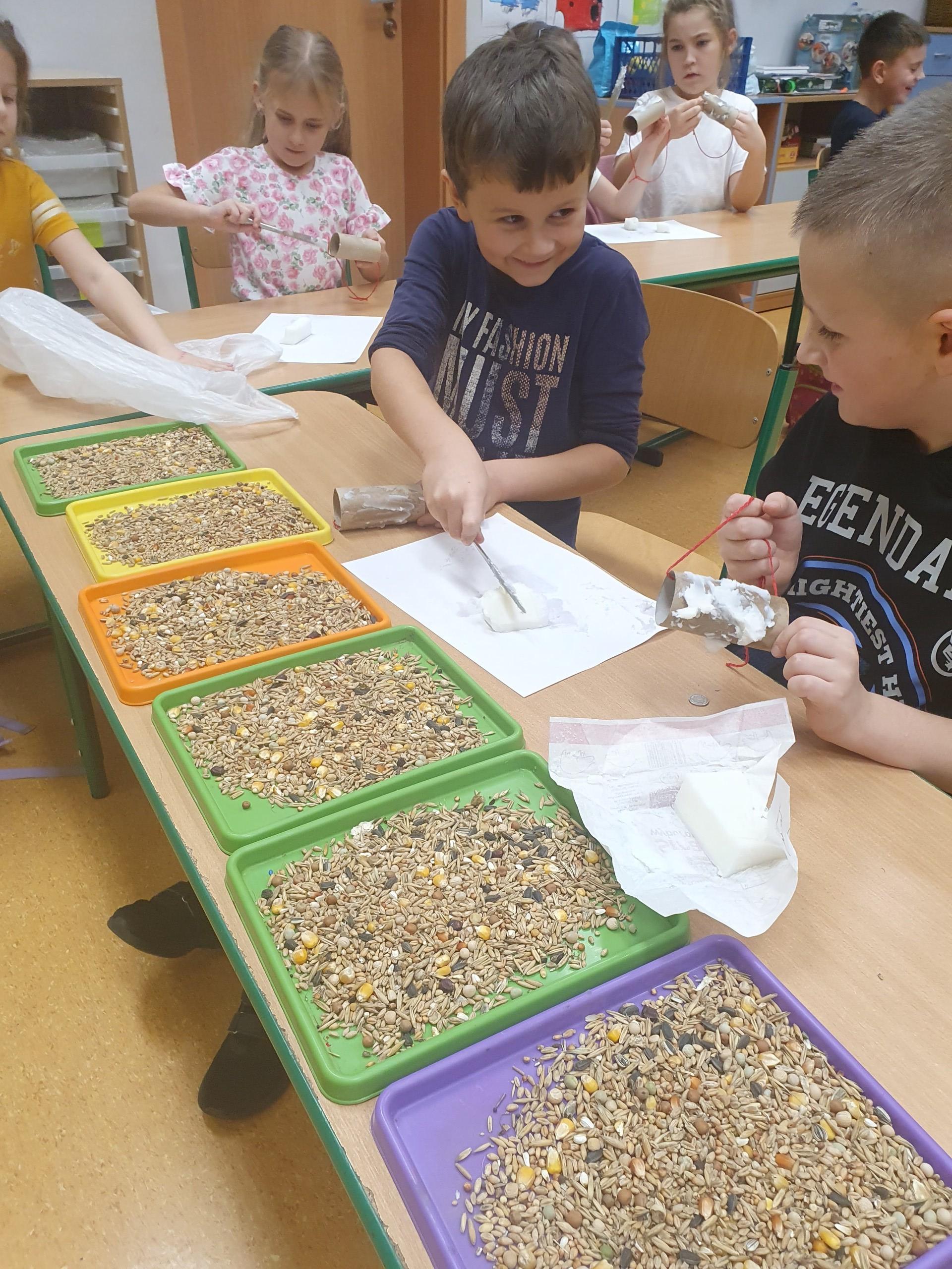 Na zajęciach z edukacji przyrodniczej uczniowie uczyli się, jak można pomagać zwierzętom w zimowym okresie, które pokarmy można im podać, a które mogą im zaszkodzić. Drugoklasiści wykonali ekologiczne karmniki zawierające różne gatunki nasion, które rozwiesili na drzewach w okolicy szkoły.