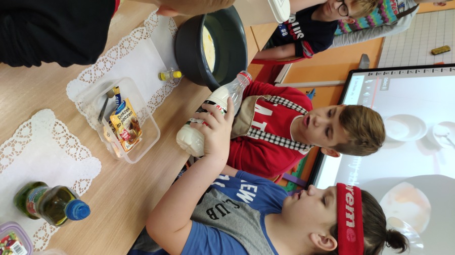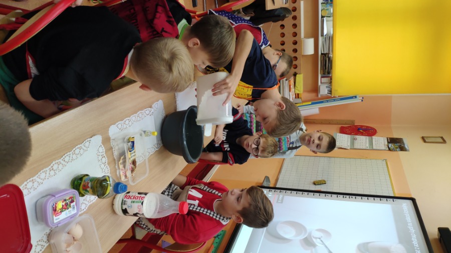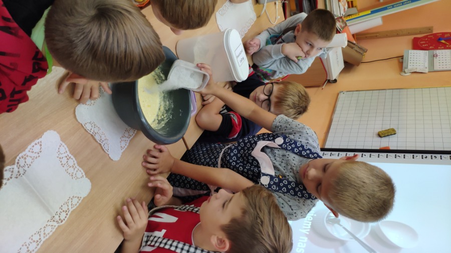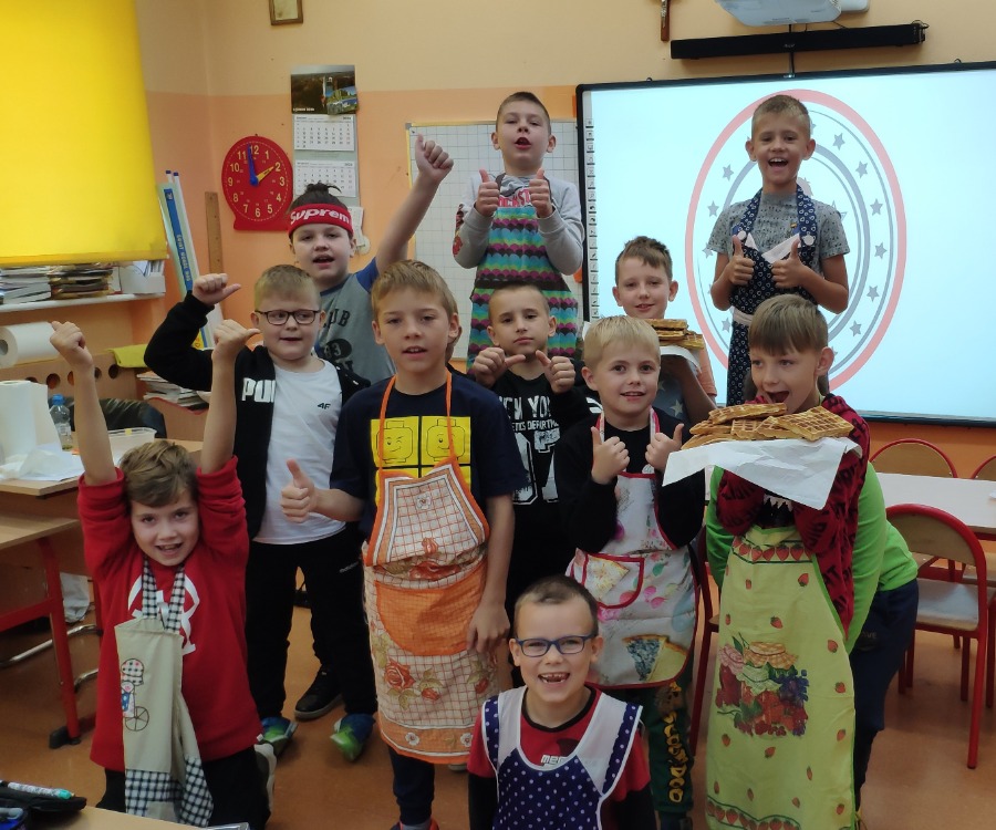 W dniu 30 września chłopcy z klasy 3 „B” mogli poczuć się wyjątkowo. Zwykle ciężko wraca się po weekendzie do szkoły, tym razem mali mężczyźni od samego rana czuli, że to będzie ich dzień. Chłopcy przeżyli prawdziwie kulinarną podróż, pod okiem ekspertów - dziewczynek. Pierwsze zadanie polegało na wykonaniu gofrów dla całej klasy z otrzymanego wcześniej przepisu i składników. Każdy chłopak starał się wypaść jak najlepiej pod okiem małych szefów kuchni. Następnie dziewczynki uważnie słuchały odpowiedzi na pytania pochodzące z quizu na temat przedmiotów dobrze znanych płci żeńskiej. Chłopcy wykazali się bardzo dobrą wiedzą w tym temacie! Po zaliczonych zadaniach wszyscy ze smakiem spałaszowali gofry, a chłopcy otrzymali małe upominki od swych koleżanek. Wszystkim chłopcom tego dnia życzymy jeszcze raz wszystkiego dobrego!