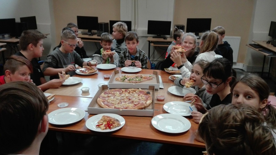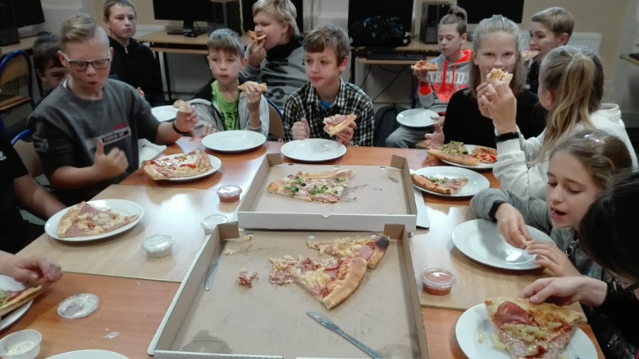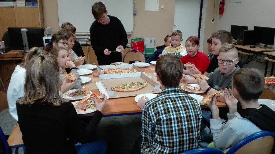 Klasa VI B świętowała Dzień Chłopaka pałaszując pyszną pizzę. Po zjedzeniu pizzy chłopcy wzięli udział w zabawie, mieli do wykonania wiele zabawnych zadań, między innymi: zrobienie warkocza, zaśpiewanie piosenki, przytulenie dziewczynek,... Na koniec każdego zadania chłopcy zostali obdarowani słodkim upominkiem. Wszyscy świetnie się spisali i bawili. Chłopakom dużym i małym życzymy jeszcze raz wszystkiego najlepszego!!!