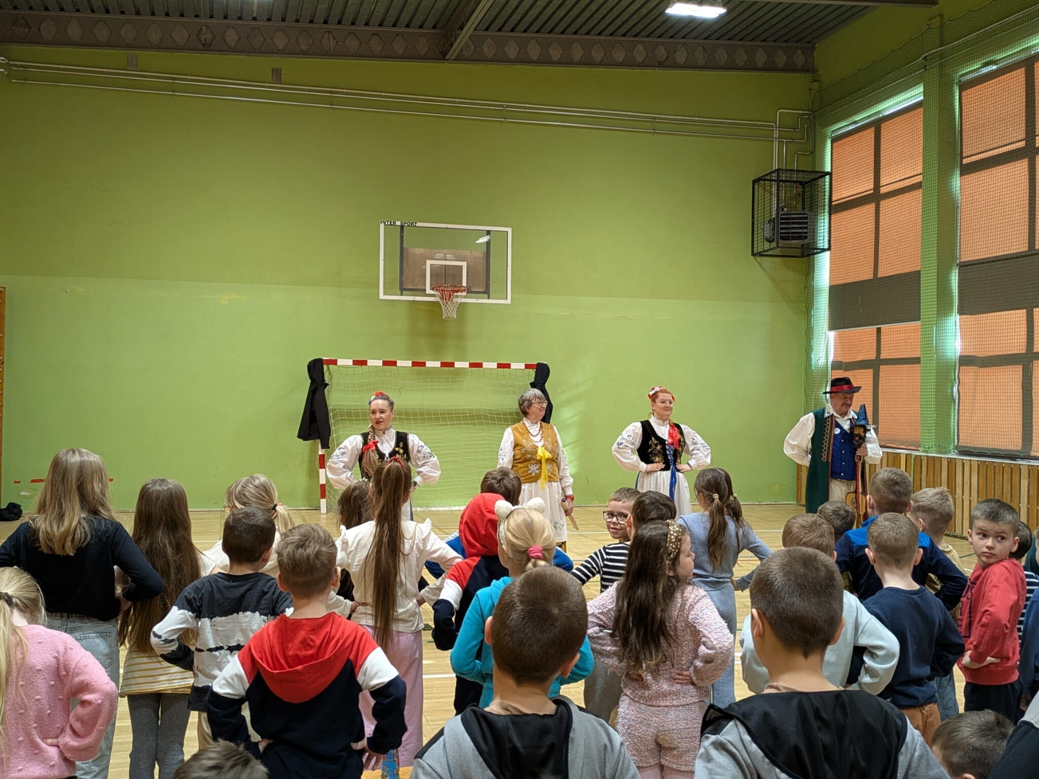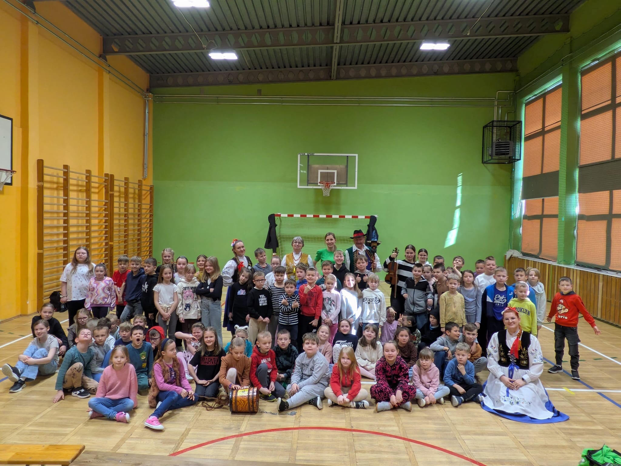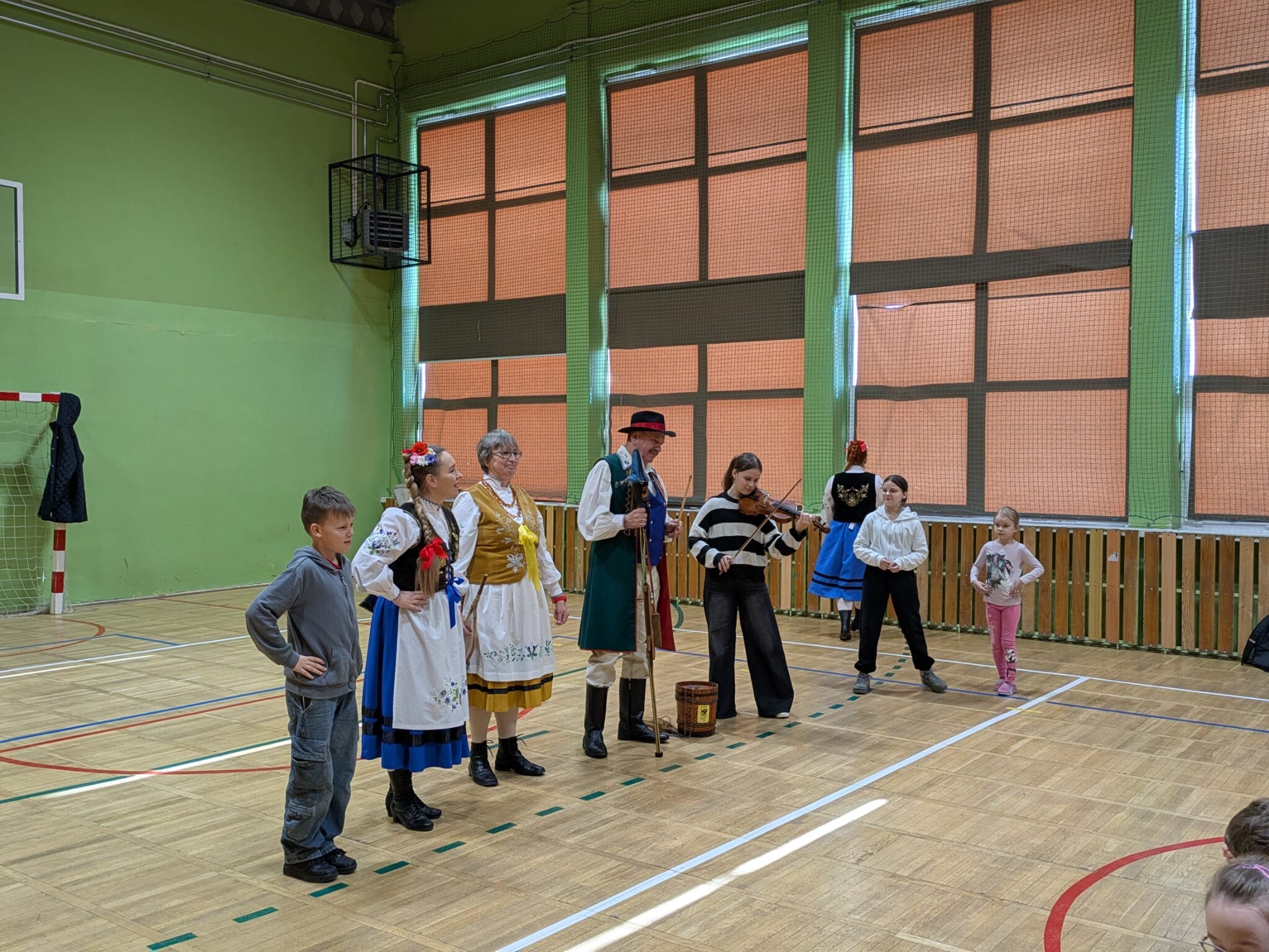 W ramach obchodów Dnia Jedności Kaszubów w naszej szkole zagościł Zespół Pieśni i Tańca ,,Levino'', ten czteroosobowy zespół zaprezentował uczniom najciekawsze instrumenty kaszubskie tj: burczybas, diabelskie skrzypce i inne. Każdy miał możliwość podejść i zagrać na wybranym instrumencie. Pani Ula w bardzo ciekawy sposób opowiedziała o folklorze kaszubskim, kulturze. Zaśpiewaliśmy wspólnie ,,Kaszubskie nuty'', a na koniec zatańczyliśmy taniec kaszubski w parach. Dziękujemy za owocne spotkanie.