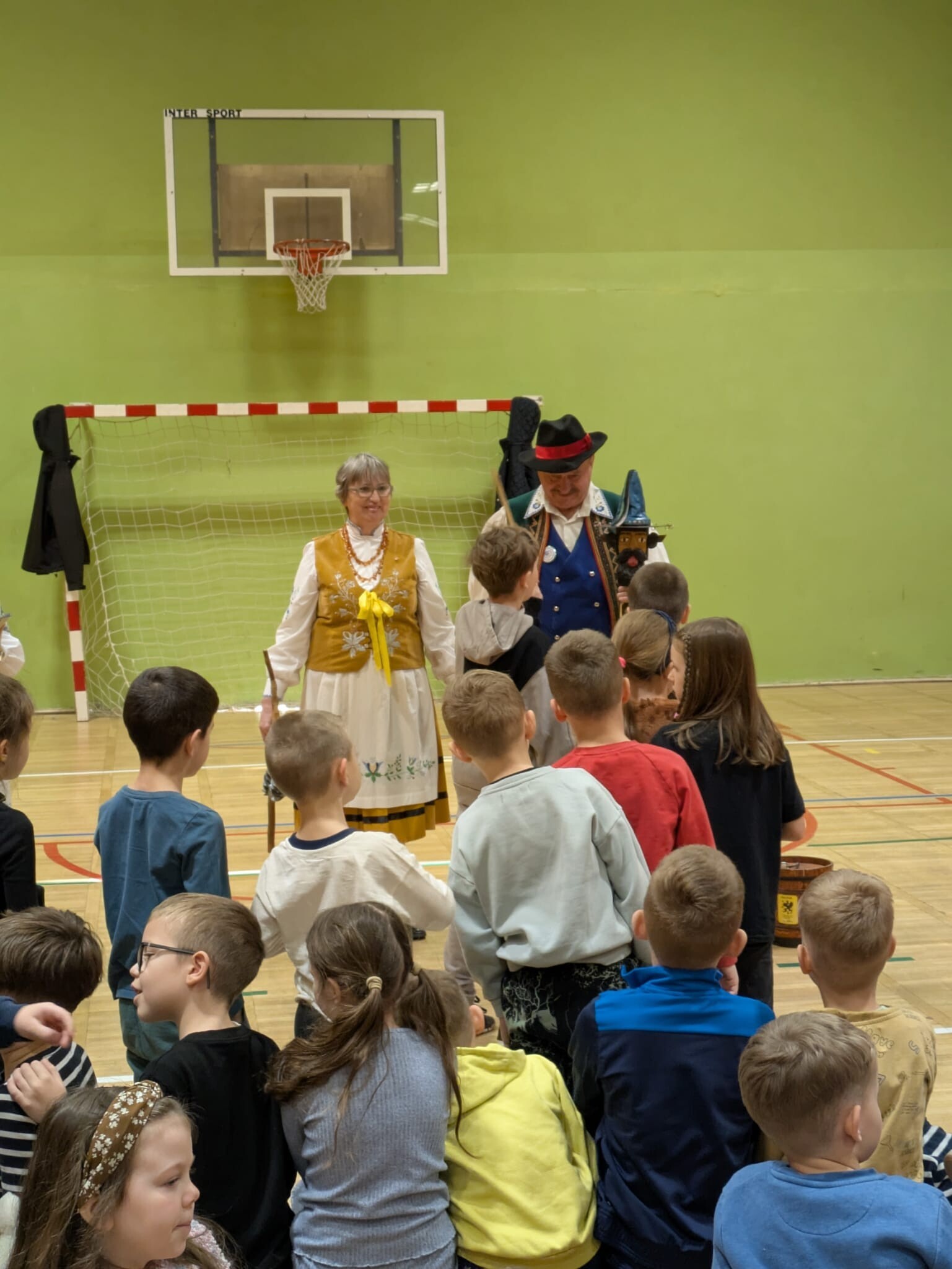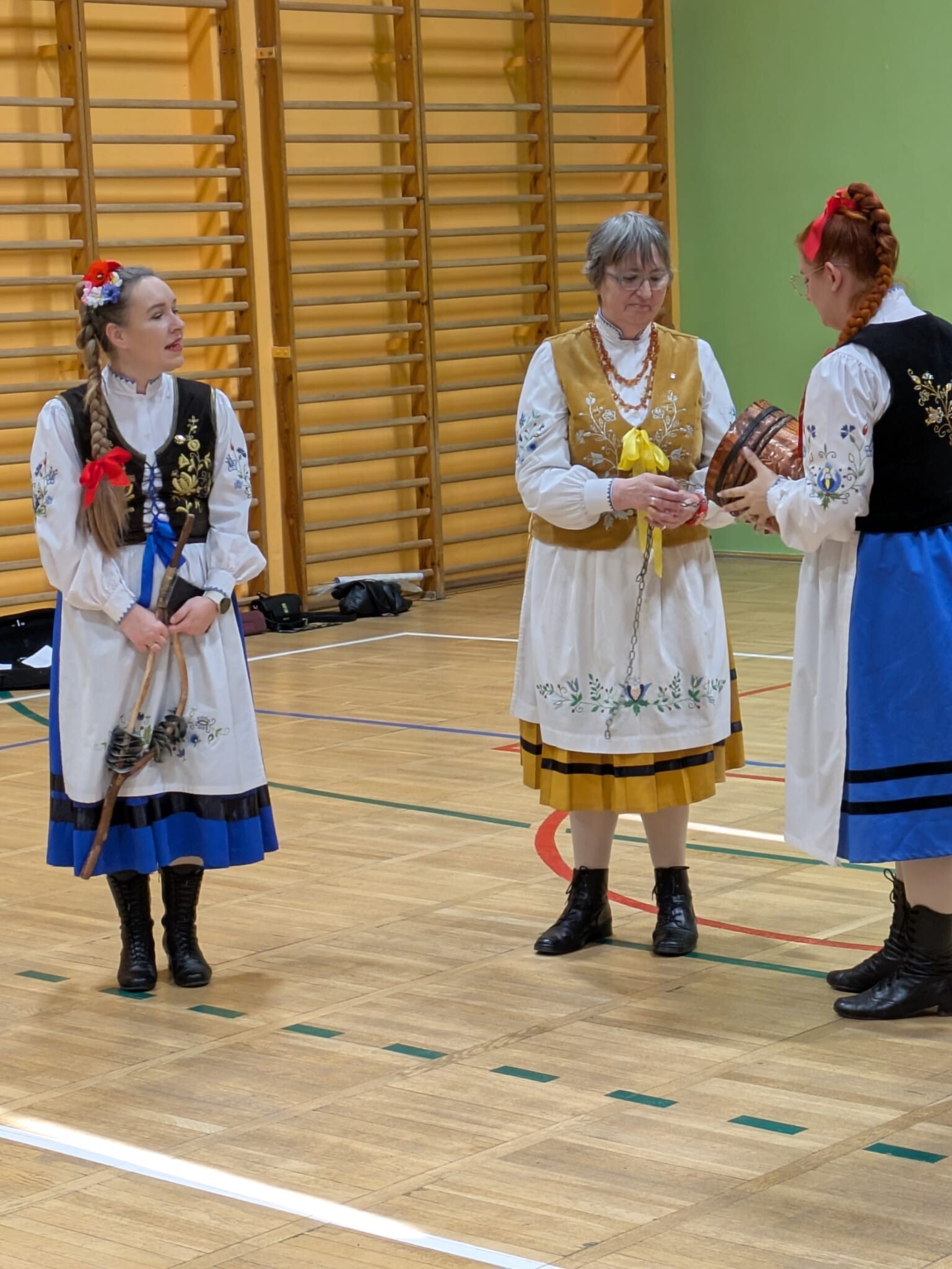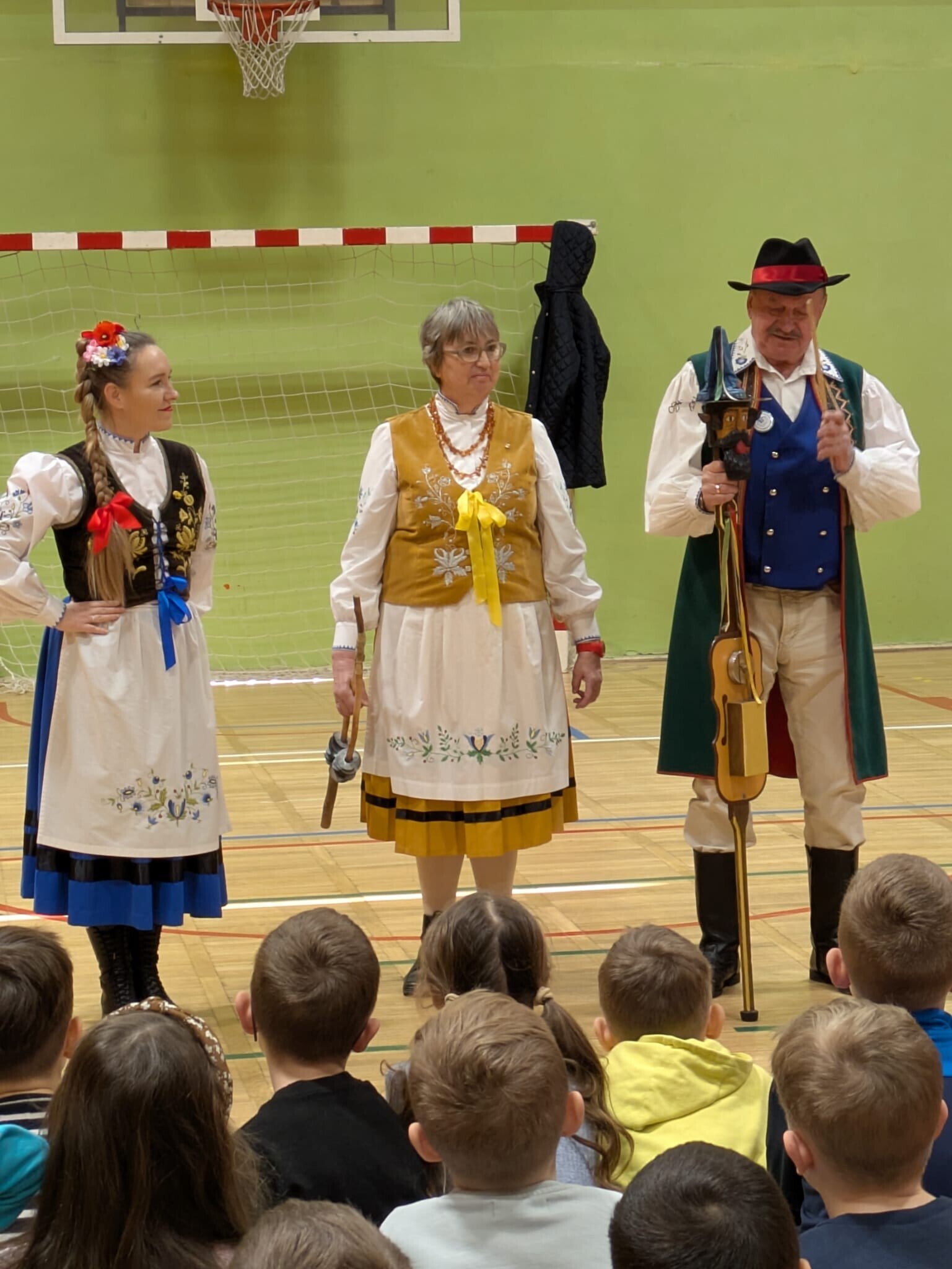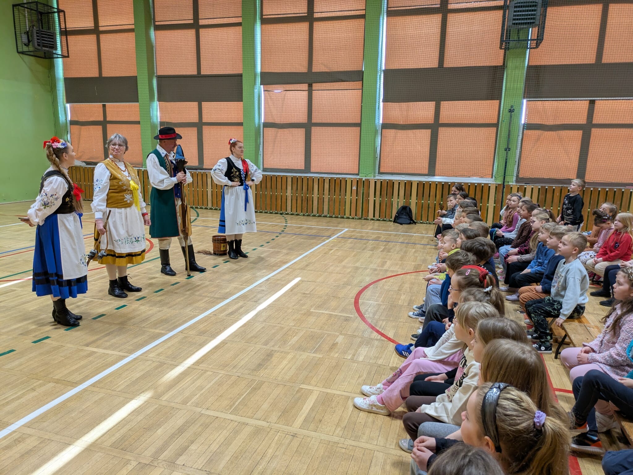 W ramach obchodów Dnia Jedności Kaszubów w naszej szkole zagościł Zespół Pieśni i Tańca ,,Levino'', ten czteroosobowy zespół zaprezentował uczniom najciekawsze instrumenty kaszubskie tj: burczybas, diabelskie skrzypce i inne. Każdy miał możliwość podejść i zagrać na wybranym instrumencie. Pani Ula w bardzo ciekawy sposób opowiedziała o folklorze kaszubskim, kulturze. Zaśpiewaliśmy wspólnie ,,Kaszubskie nuty'', a na koniec zatańczyliśmy taniec kaszubski w parach. Dziękujemy za owocne spotkanie.