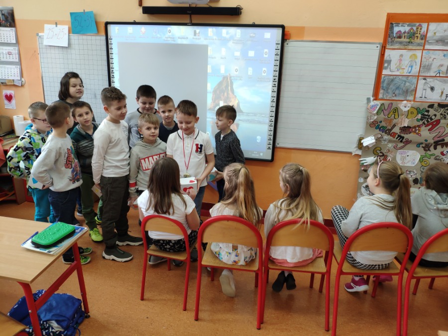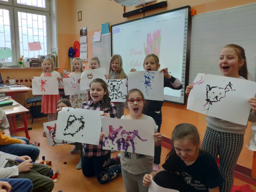 Każda okazja jest dobra do świętowania, a zwłaszcza Dzień Kobiet. Klasa 2b świętowała go w poniedziałek. Chłopcy zaproponowali swoim koleżankom kobiece zadanie. Malowanie. W ramach zadania plastycznego, dziewczynki musiały wykonać portret głównego bohatera lektury „Cukierku, ty Łobuzie” trzymając pędzelek jedynie za pomocą zębów. Zabawa przy malowaniu była wyśmienita. Drobne prezenty od chłopców na zakończenie świętowania, to zawsze duża przyjemność dla dziewczynek.
