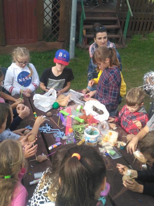 Dnia 01 października uczniowie uczący się języka kaszubskiego klas IV c , VII a, VII b świętowali Dzień Pieczonego Ziemniaka w Obliwicach. Pan Krzysztof Pruszak przywitał nas serwując przepyszne upieczone ziemniaczki, za co raz jeszcze dziękujemy. Podczas pobytu uczniowie mieli okazję przyozdobić ziemniaki w dowolny sposób wykorzystując różnego rodzaju materiały. Dzieci wzięły również udział w zabawach integracyjnych, nie zabrakło również rzutu kaloszem do opony, co dało nam nie lada śmiechu. Koledzy i koleżanki z klas VII wykonali portrety nauczycieli z wykorzystaniem różnych elementów. Na koniec udaliśmy się na poniemiecki cmentarz, gdzie zapaliliśmy znicze. Zabawa była udana. Mamy nadzieję, że będzie jeszcze nie jedna okazja odwiedzić to miejsce:)