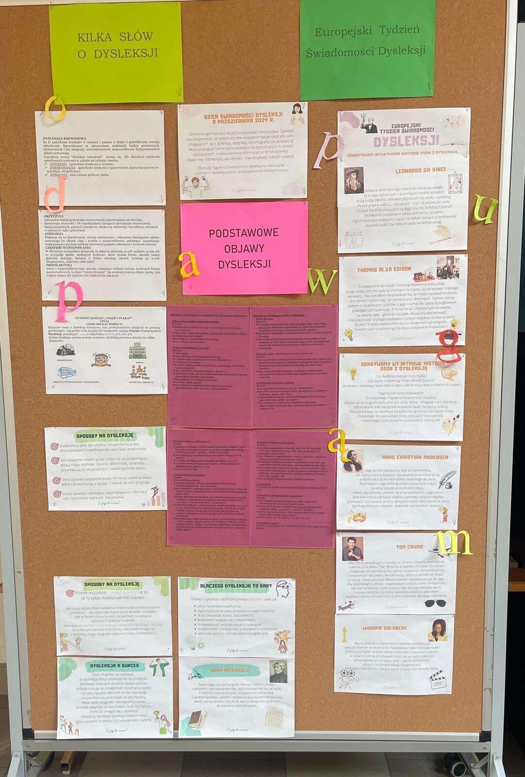 Tegoroczny Europejski Tydzień Świadomości Dysleksji odbywał się pod hasłem "Odkrywamy wyjątkowe historie osób z dysleksją". Na patio pojawiła się gazetka z informacjami o specyficznych trudnościach w uczeniu się - dysleksji rozwojowej. W związku z obchodami uczniowie mieli okazję poznać historie sławnych osób, które mają dysleksję. W ramach aktywnych przerw mogli wziąć udział w zabawach ćwiczących koncentrację, pamięć, logiczne myślenie, percepcję wzrokową, koordynację wzrokowo - ruchową, czy sprawność manualną.