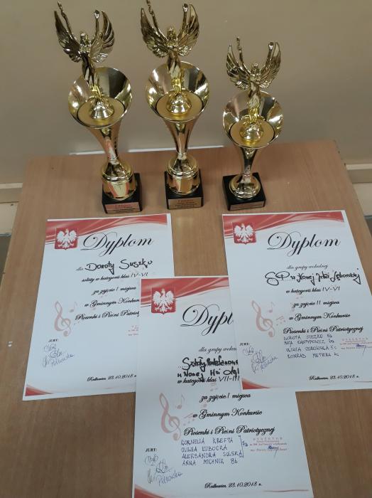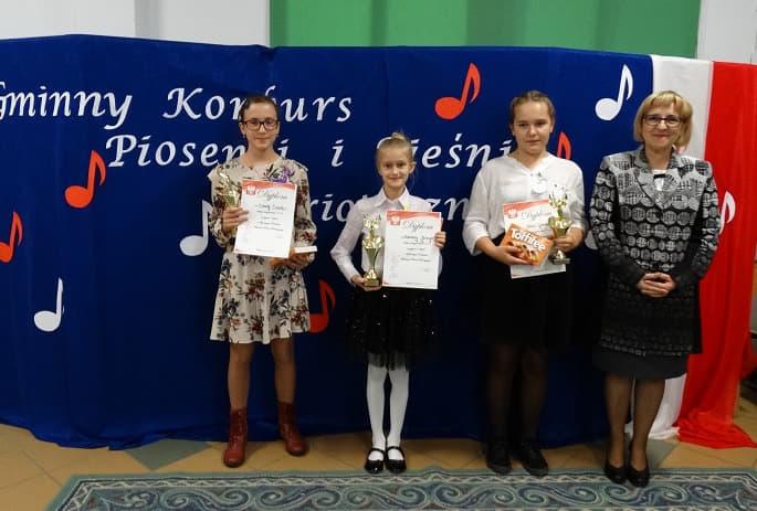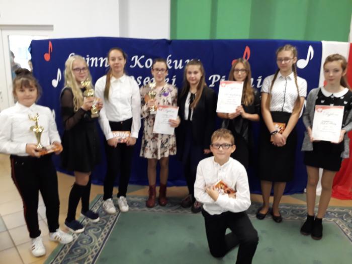 23 października 2018r. odbył się Gminny Konkurs Pieśni Patriotycznych. I miejsce wyśpiewała Dorota Suszko z klasy 5a. I miejsce zdobył również zespół w składzie Kornelia Krefta, Ola Solska i Oliwia Lubocka z klasy 7a oraz Anna Michnik z 8b. II miejsce zajął zespół: Dorota Suszko 5a, Maja Kantypowicz 6a, Oliwia Osikowska 5c i Konrad Metera 4c. Udział wzięła również Agnieszka Leszczyńska 8a. Wspaniałe. Wśród naszych instrumentów pojawiła się nowość - ukulele! Były również gitary i bongos.