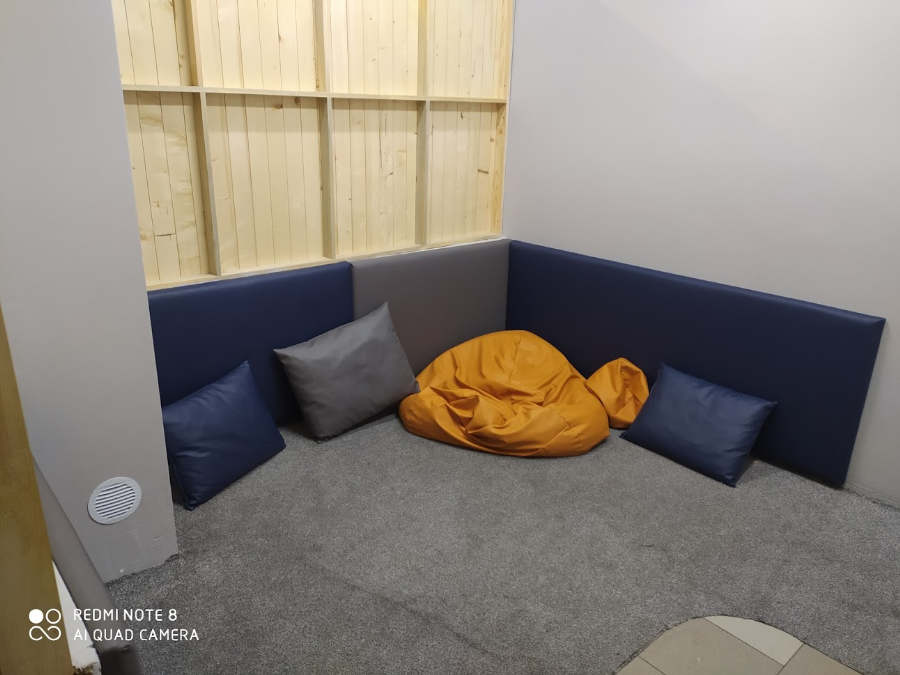 W trosce o zdrowie psychiczne naszych uczniów, którzy, jak się okazało, chcą spędzać przerwy bez hałasu, postanowiliśmy utworzyć kąciki ciszy. Są to miejsca służące do wyciszenia się, zrelaksowania. Brać szkolna może tam porozmawiać, poczytać, nawiązywać i podtrzymywać kontakty interpersonalne tak ważne w życiu. Wygodne poduchy, pufy i miękka wykładzina sprzyjają odpoczynkowi.