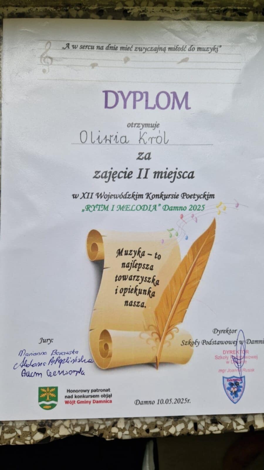 Uczennica naszej szkoły - Oliwia Król z kl.6a zdobyła zaszczytne II miejsce w XII Wojewódzkim Konkursie Poetyckim ,,Rytm i melodia” - Damno 2025.