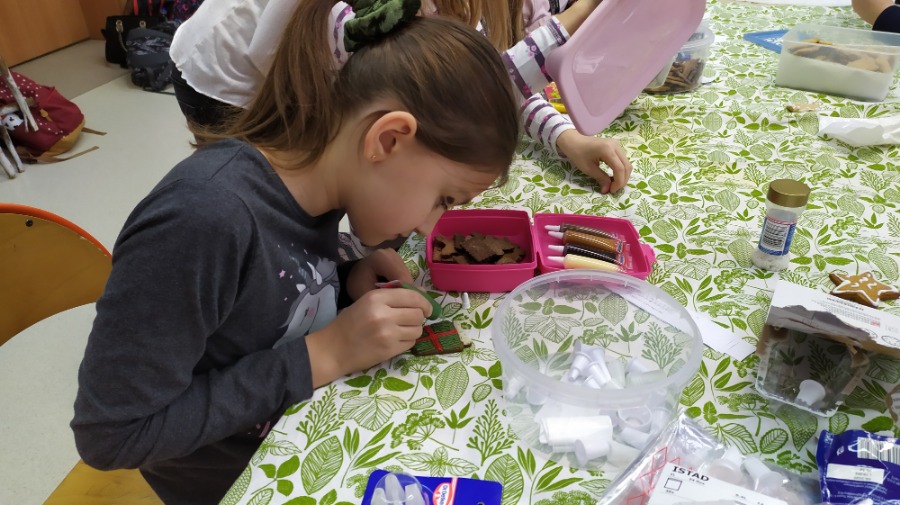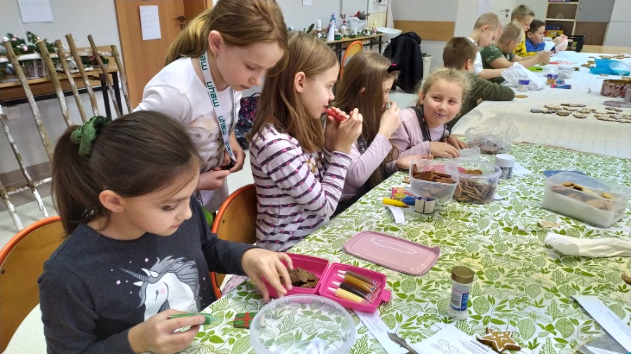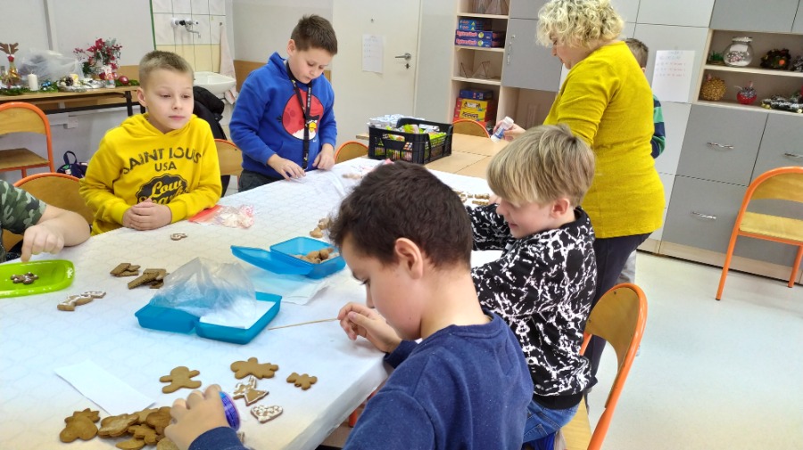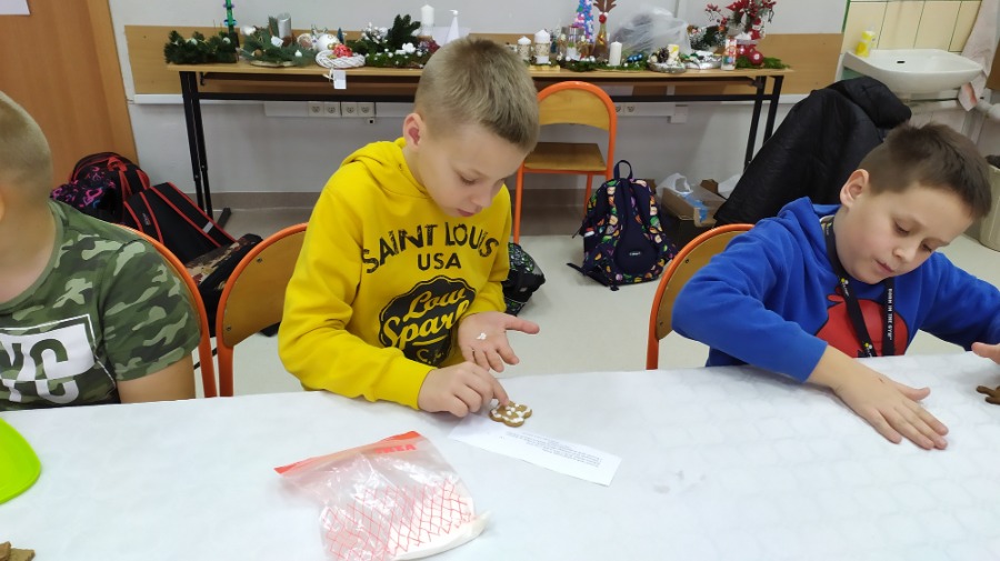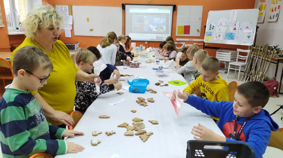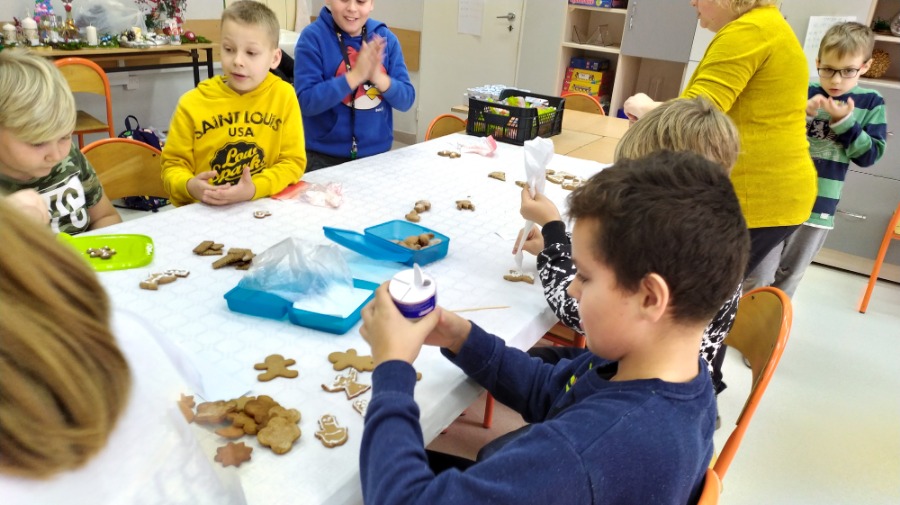 Uczniowie klasy czwartej na godzinie z wychowawcą ozdabiali pięknie pierniki w różnych kształtach, które przeznaczone zostaną na Biały Koncert. Dzieci bardzo się starały, były bardzo dokładne i włożyły w swoją pracę dużo serca. Oczywiście nie obyło się bez degustacji ;) Pierniki są naprawdę smaczne, czwartaki polecają.
