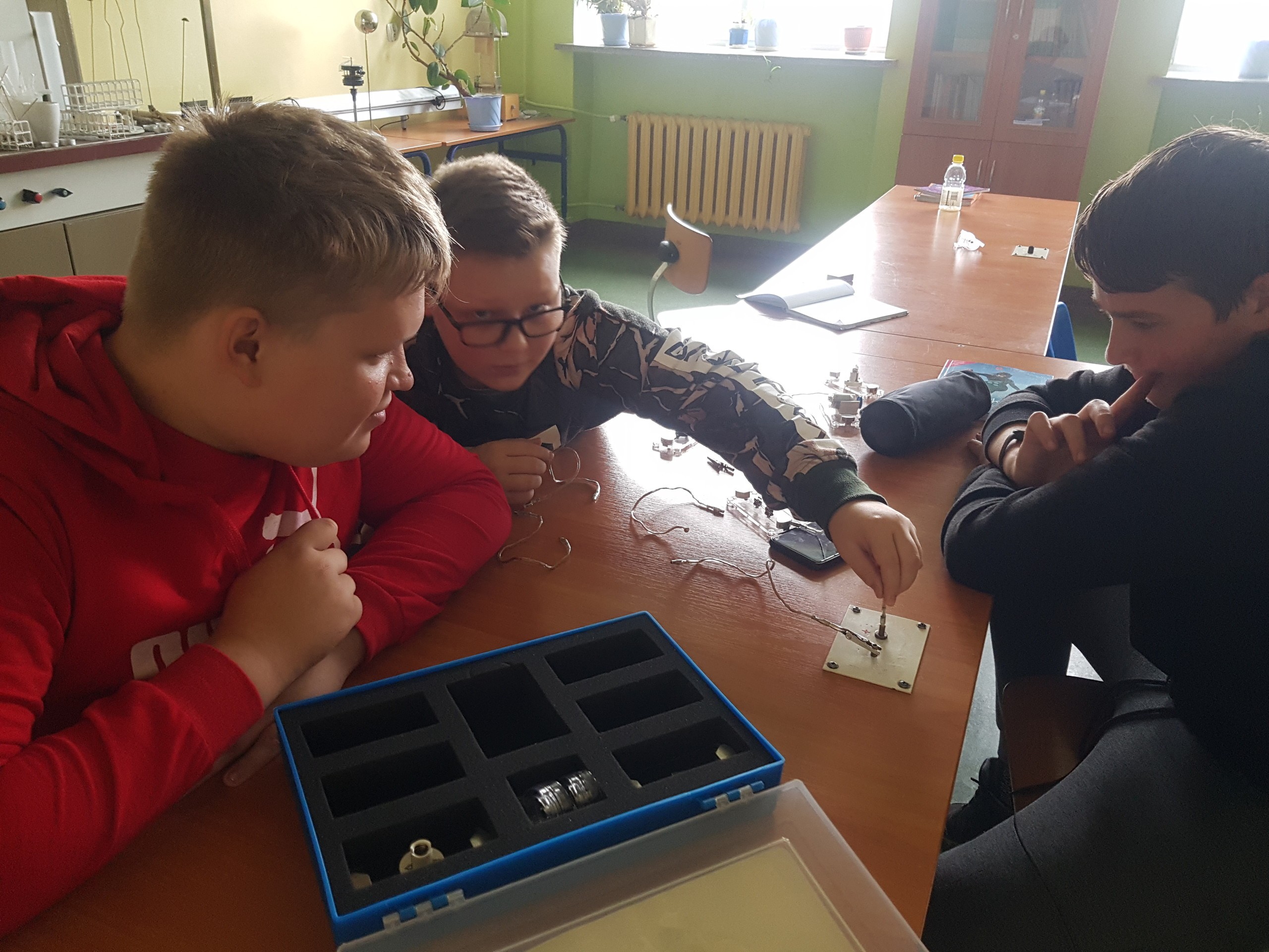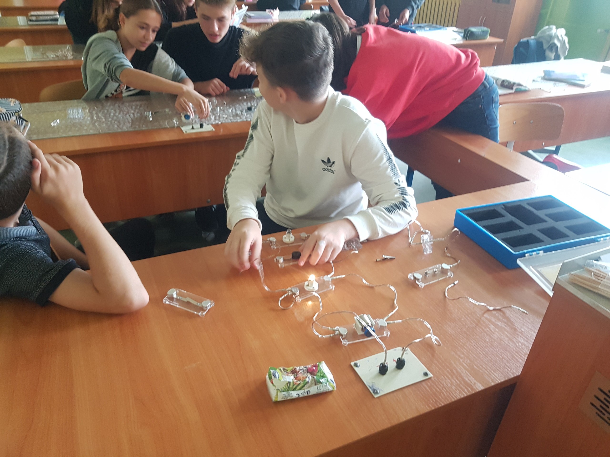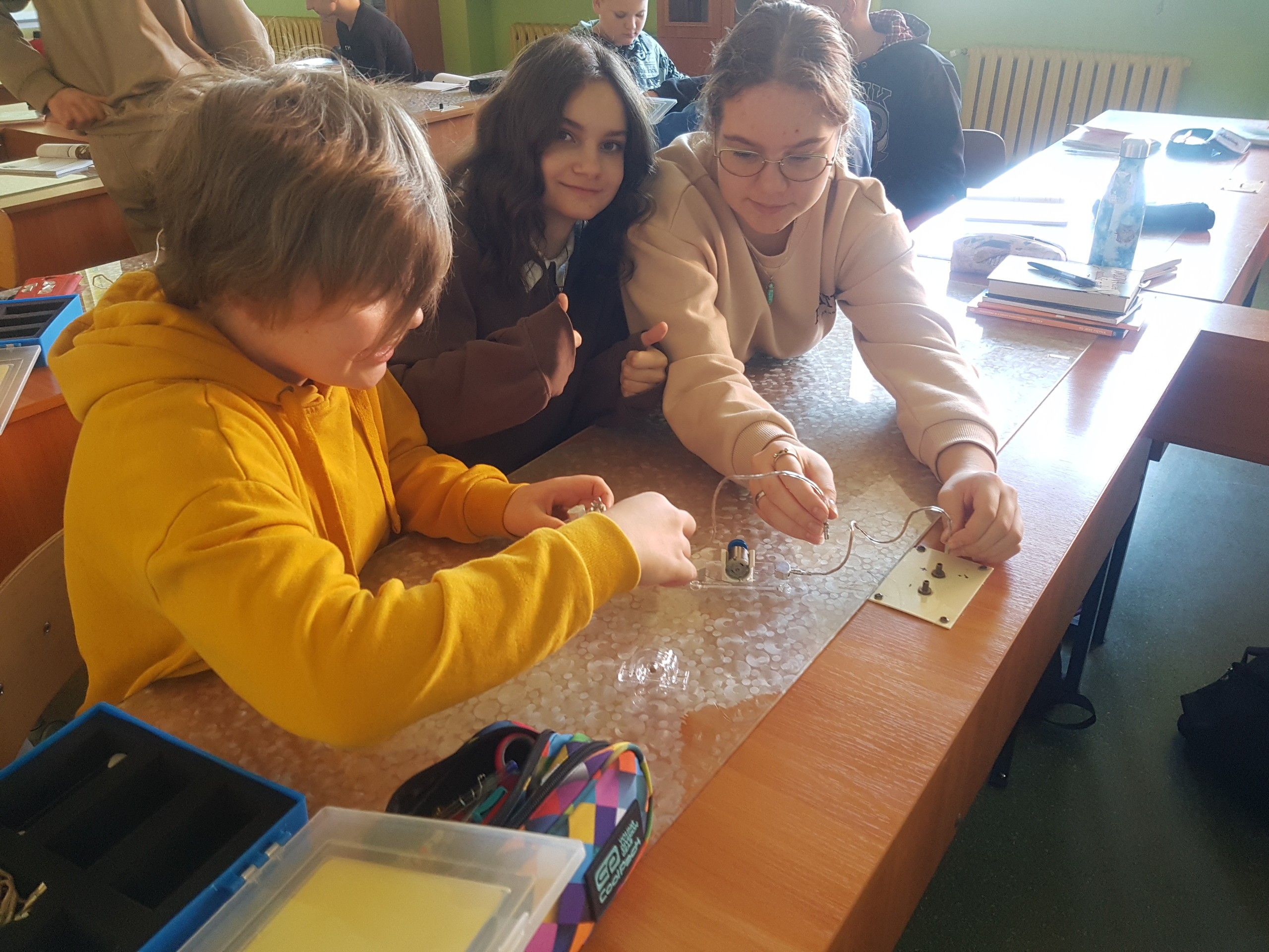 W klasach 8 na lekcjach fizyki uczniowie zdobywają wiadomości na temat elektrostatyki i prądu elektrycznego. W ostatnim czasie poznawali obwody elektryczne w praktyce. Zadania polegały m.in. na podłączeniu jak największej ilości działających elementów do jednego źródła napięcia, wbudowania działającego włącznika do obwodu itp.