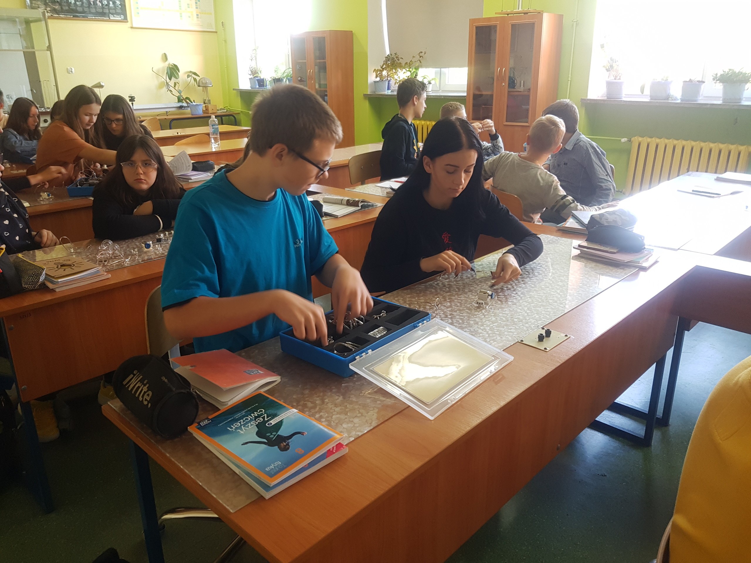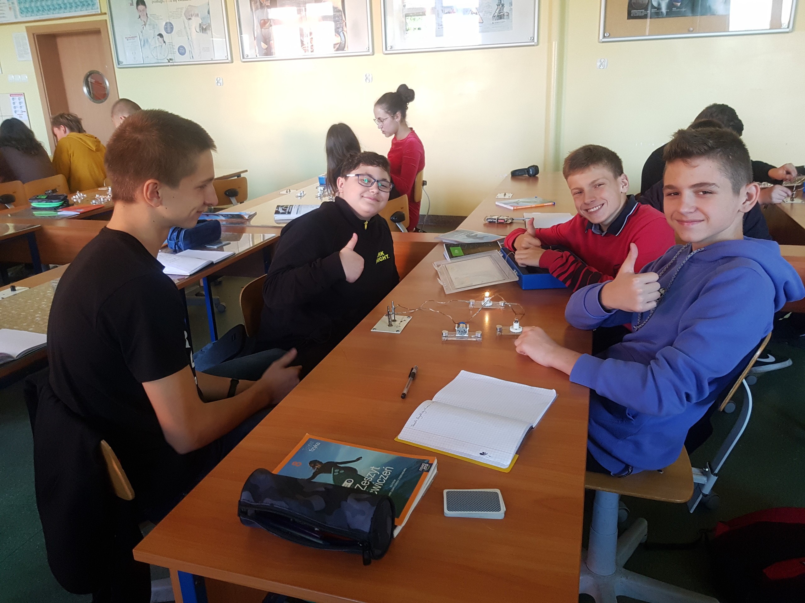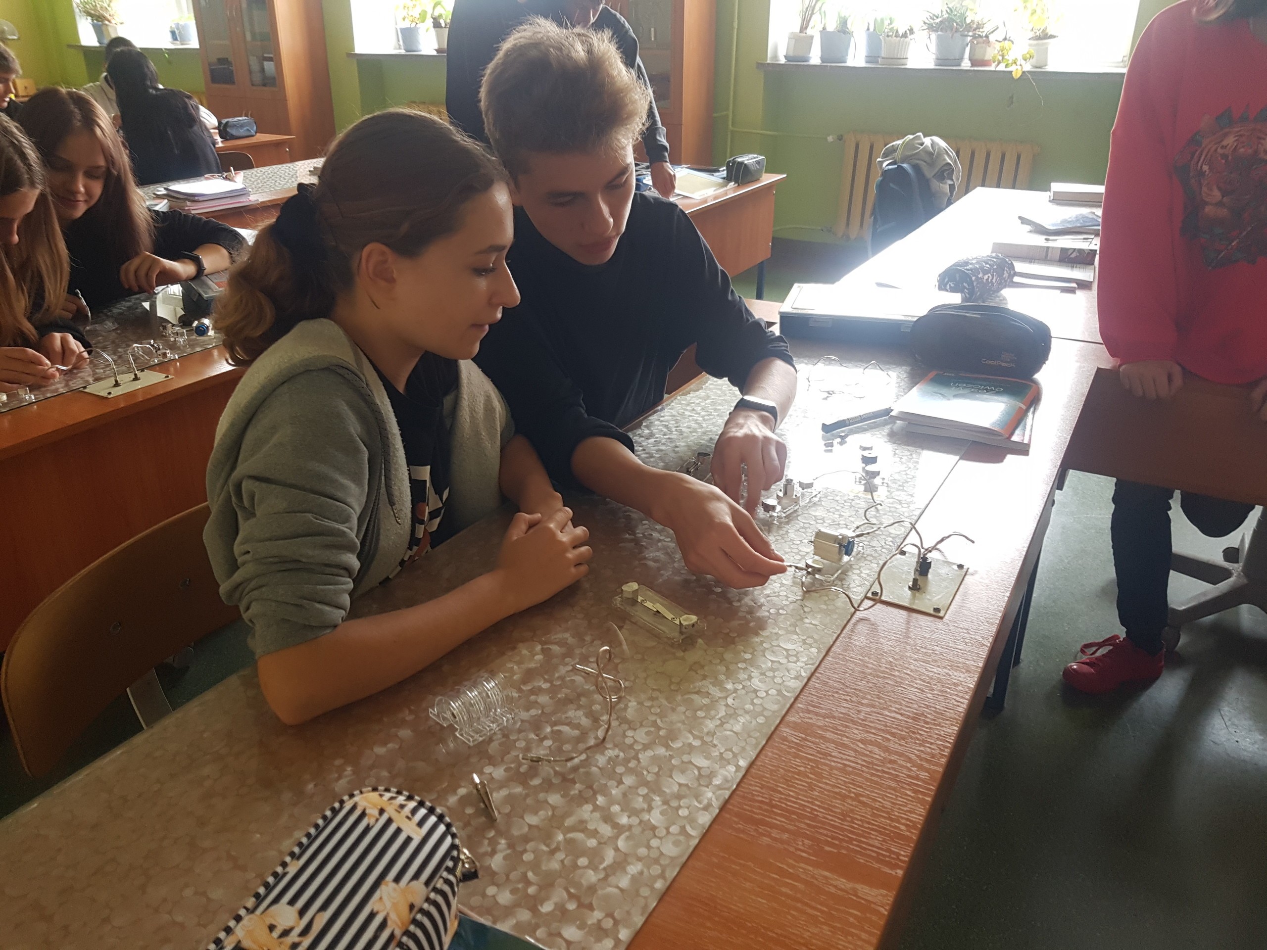 W klasach 8 na lekcjach fizyki uczniowie zdobywają wiadomości na temat elektrostatyki i prądu elektrycznego. W ostatnim czasie poznawali obwody elektryczne w praktyce. Zadania polegały m.in. na podłączeniu jak największej ilości działających elementów do jednego źródła napięcia, wbudowania działającego włącznika do obwodu itp.
