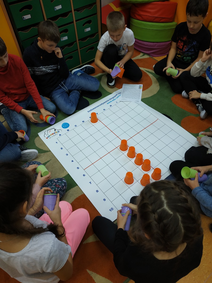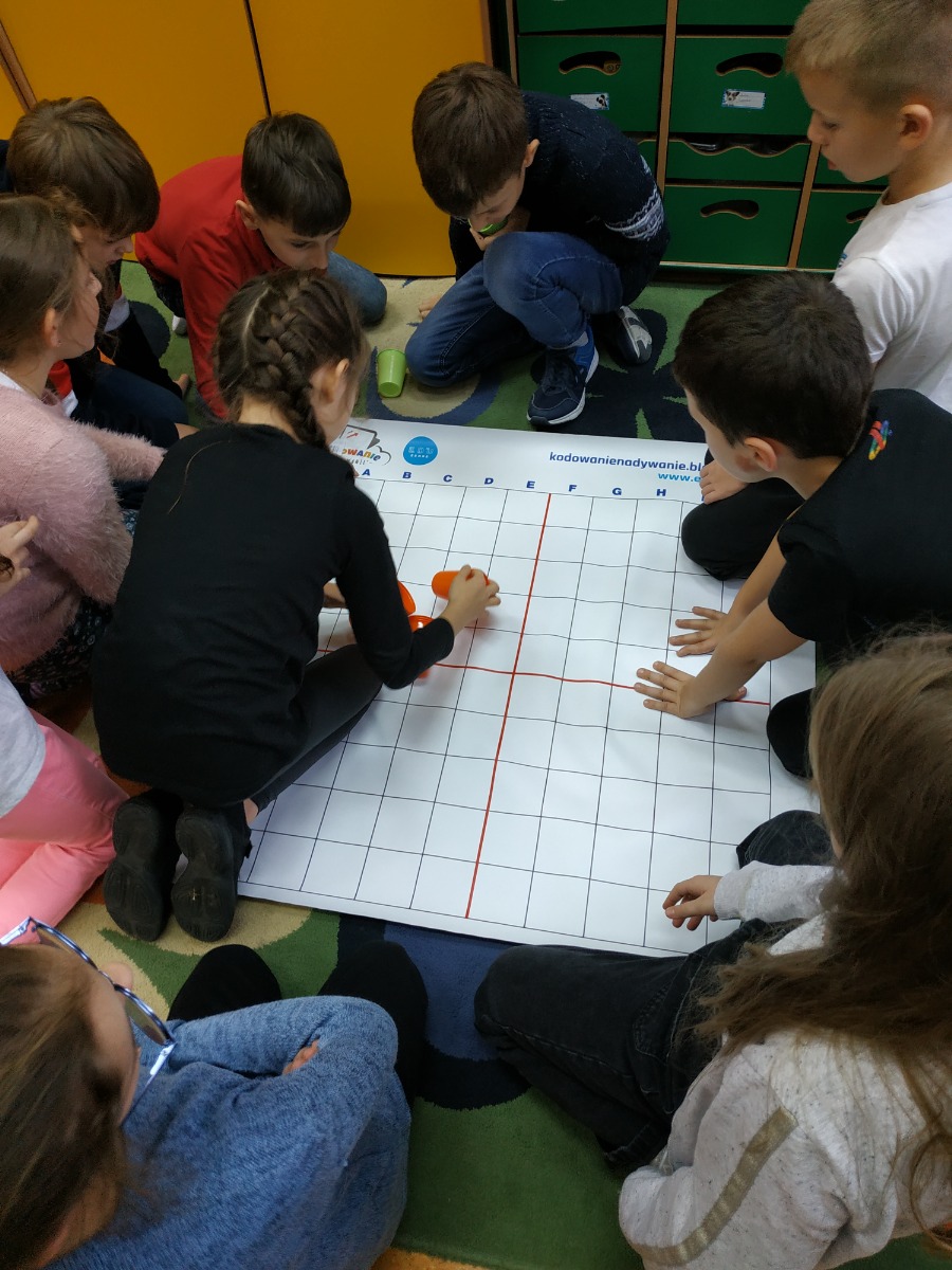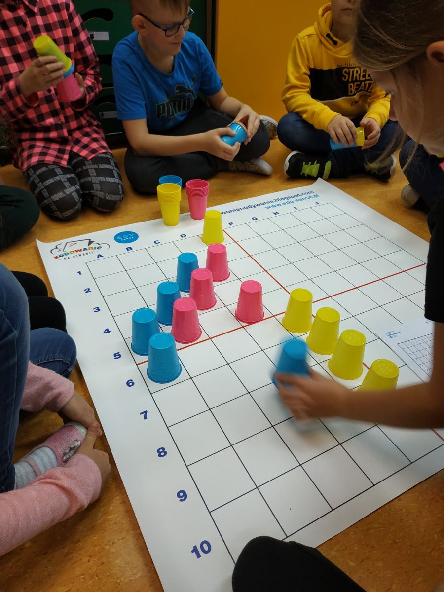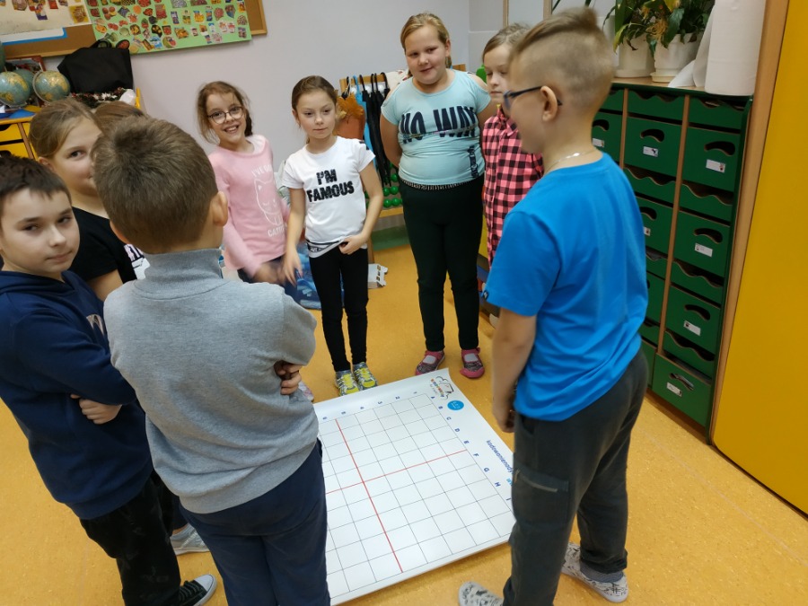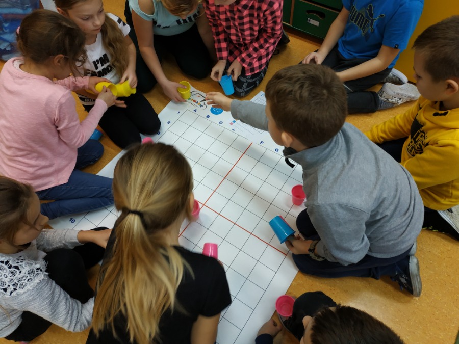 Uczniowie klasy 3A mieli okazję pobawić się w kodowanie na planszach. Rozpoczęliśmy od omawiania obecnej pory roku poprzez zadawanie pytań: Jaka jest pora roku? Jaka pogoda jej towarzyszy? Jak należy się ubrać, co należy ze sobą zabierać, gdy pada deszcz?. Klasa została podzielona na dwie grupy, każda z nich miała do wykonania zadania przy pomocy specjalnych wskazówek. Za pomocą kodów dzieci układały różne kolory kubków, w efekcie ułożyły parasol. Kolejne zadanie polegało na tym, aby za pomocą strzałek przejść określoną drogę poprzez układanie odpowiednich elementów. Dzieci uczyły się nie tylko współpracy w grupach, ale również przypominali sobie kierunki: prawo, lewo, prosto itd., przy czym świetnie się bawiły.
