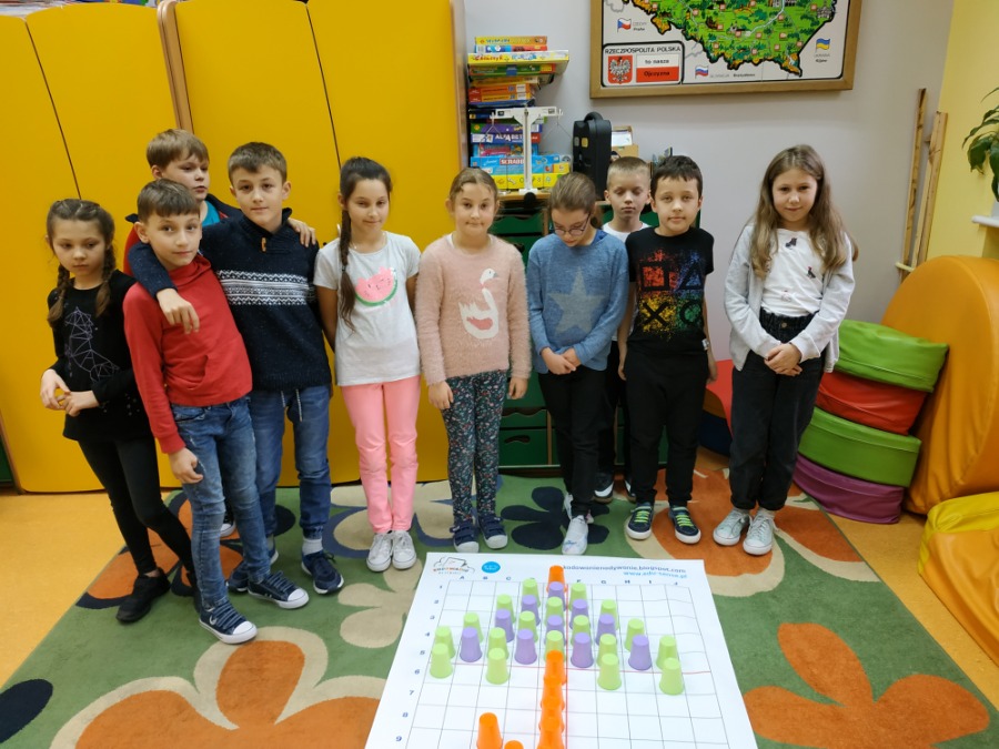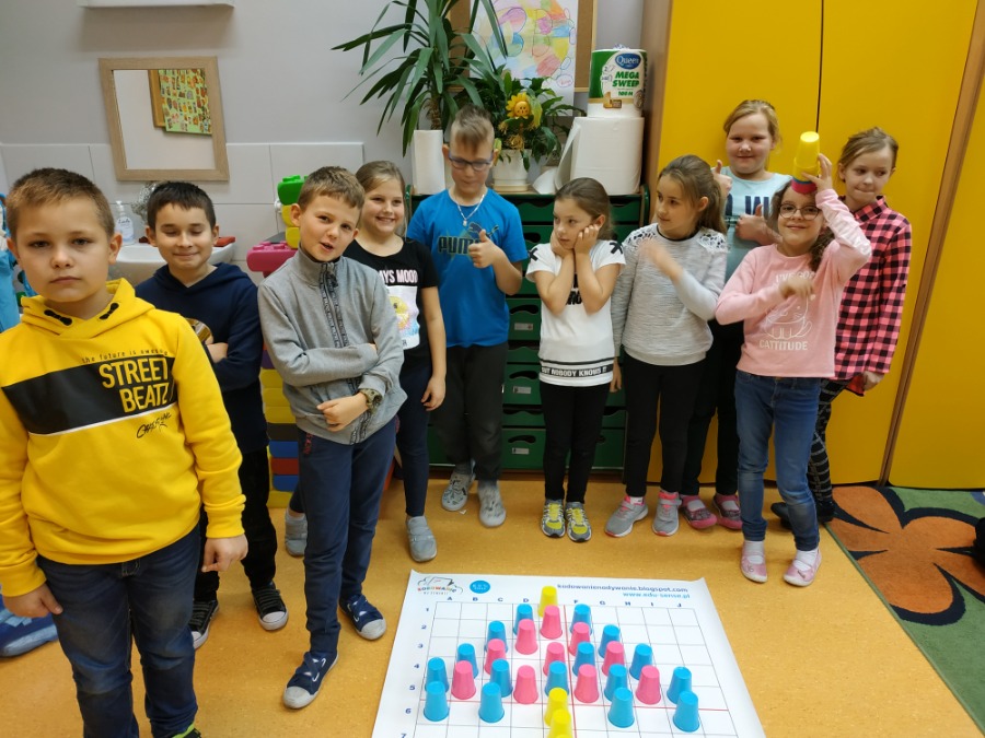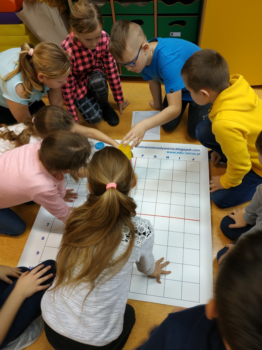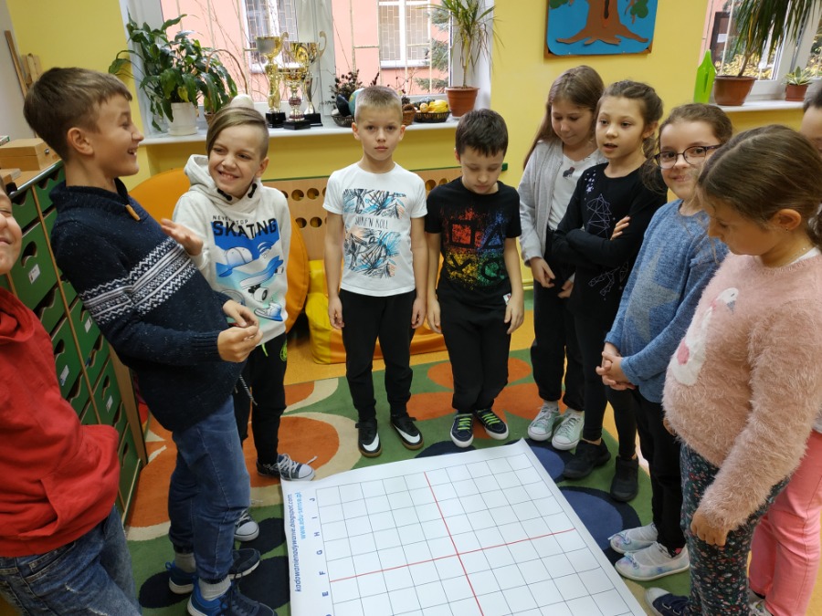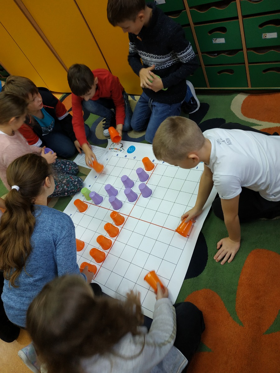 Uczniowie klasy 3A mieli okazję pobawić się w kodowanie na planszach. Rozpoczęliśmy od omawiania obecnej pory roku poprzez zadawanie pytań: Jaka jest pora roku? Jaka pogoda jej towarzyszy? Jak należy się ubrać, co należy ze sobą zabierać, gdy pada deszcz?. Klasa została podzielona na dwie grupy, każda z nich miała do wykonania zadania przy pomocy specjalnych wskazówek. Za pomocą kodów dzieci układały różne kolory kubków, w efekcie ułożyły parasol. Kolejne zadanie polegało na tym, aby za pomocą strzałek przejść określoną drogę poprzez układanie odpowiednich elementów. Dzieci uczyły się nie tylko współpracy w grupach, ale również przypominali sobie kierunki: prawo, lewo, prosto itd., przy czym świetnie się bawiły.