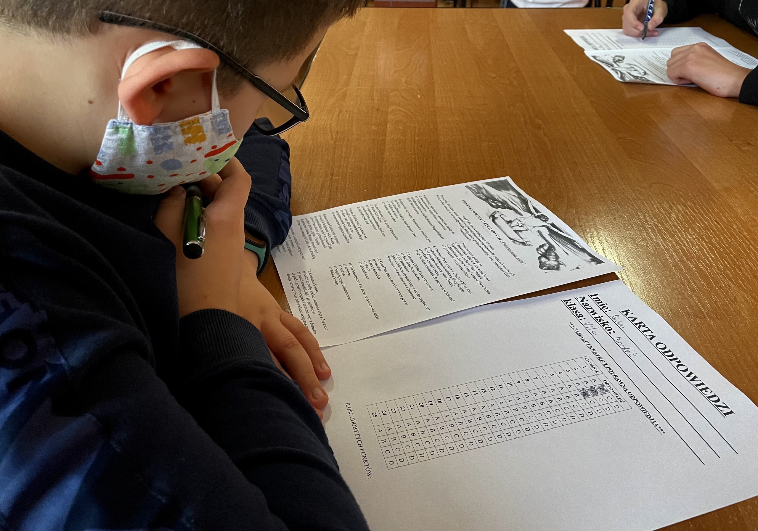 W środowe popołudnie, 01 grudnia 2021 roku, o godz. 13.45, w naszej szkole odbył się etap szkolny konkursu wiedzy o Eucharystii. Wzięło w nim udział aż 34! uczniów z klas 6 - 8. Uczestnicy konkursu przez tygodniowe przygotowania zgłębiali wiedzę i tajniki dotyczące Mszy Świętej, której źródłem jest Jezus Chrystus przychodzący w postaciach eucharystycznych chleba i wina - dając nam jako pokarm swoje Ciało i Krew. Każdy z biorących udział w konkursie musiał zmierzyć się z 25 zadaniowym testem, wybierając jedną z czterech możliwych odpowiedzi. Zwycięzcami etapu szkolnego są: Z klasy 6: 1) Magdalena Wójcik; 2) Antoni Narewski; Z klas 7: 1) Filip Borlik; 2) Zofia Grabowska; Z klas 8: (poniżsi uczestnicy zdobyli maksymalną ilość punktów!) 1) Julia Żurawska; 2) Stanisław Wojtkiewicz; 3) Kacper Kulasiewicz. Dziękuje za udział wszystkim uczestnikom konkursu! Zwycięzcom etapu szkolnego serdecznie gratuluję! Będą oni reprezentować naszą szkołę w finale, który odbędzie się w naszej szkole przed Świętami Bożego Narodzenia, na który przybędą najlepsi z najlepszych z pozostałych szkół, które zgłosiły chęć udziału w konkursie. Ks. Aleksander Lipkowski