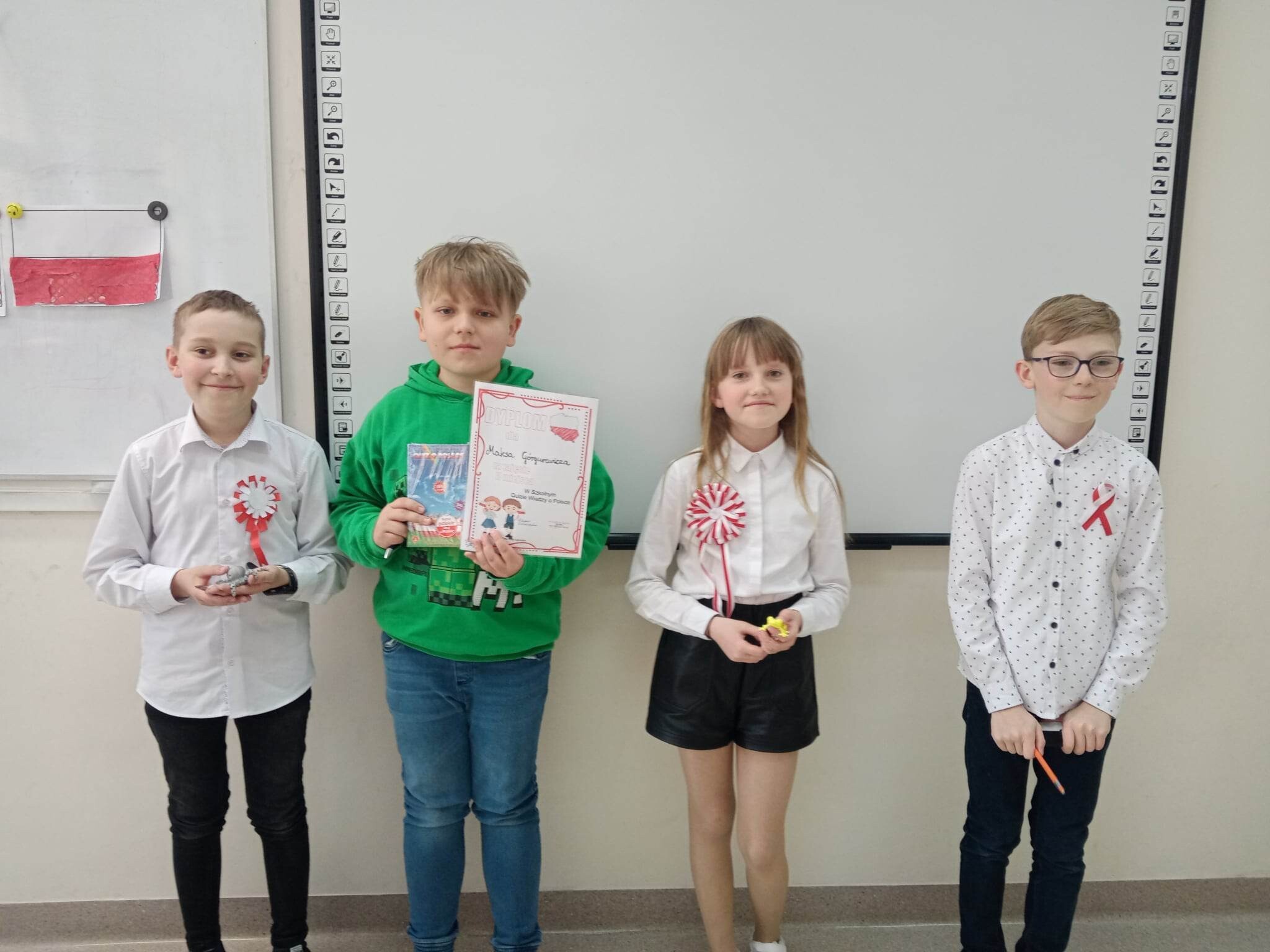 W czwartek 27 kwietnia uczniowie klas 3 wzięli udział w międzyklasowym konkursie wiedzy o Polsce "Polska - moja Ojczyzna". Celem konkursu było wzbogacanie wiedzy na temat historii, symboli narodowych, dziedzictwa kulturowego oraz rozbudzanie uczuć patriotycznych i poczucia dumy narodowej. Laureaci wykazali się bardzo dużą wiedzą o naszym kraju.