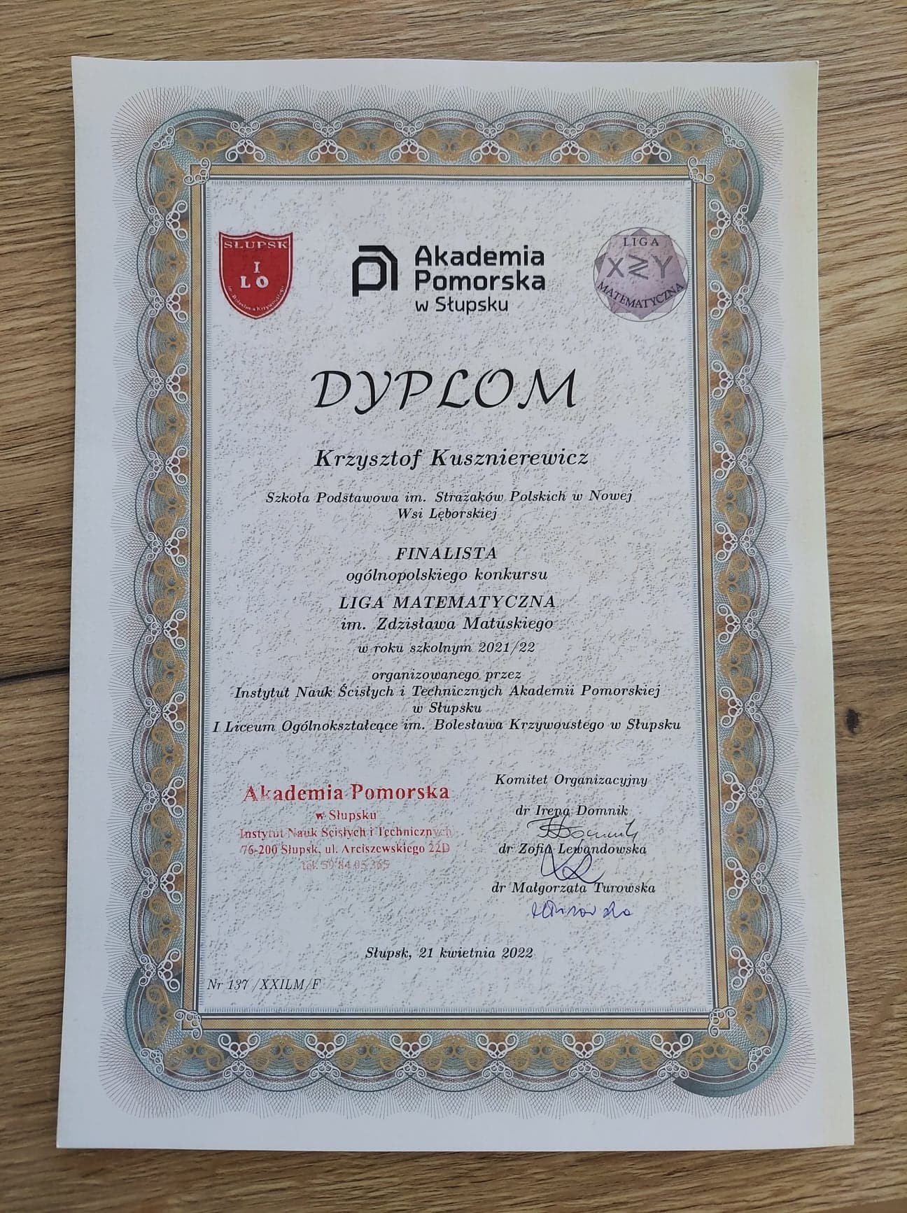 Uczeń klasy 4a Krzysztof Kusznierewicz, został finalistą Ligi Matematycznej. Jest to ogólnopolski konkurs matematyczny organizowany od kilkunastu już lat przez Akademię Pomorską w Słupsku. Zmagania przeznaczone są dla wyjątkowo wytrwałych uczniów, ponieważ trwają od października do kwietnia danego roku szkolnego. Krzysztof przeszedł przez eliminacje korespondencyjne oraz półfinał i 21 kwietnia 2022 roku wziął udział w XXI finale Ligi Matematycznej.