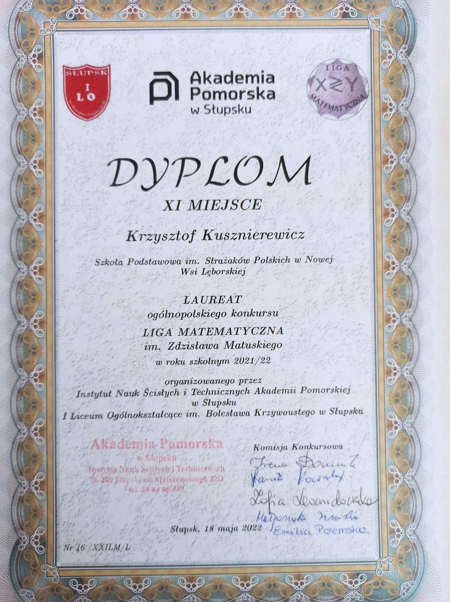 19 maja 2022 odbyła się uroczystość rozdania nagród Laureatom XXI edycji Ligi Matematycznej im. Zdzisława Matuskiego organizowanej przez Instytut Nauk Ścisłych i Technicznych Akademii Pomorskiej w Słupsku oraz I Liceum Ogólnokształcące im. Bolesława Krzywoustego w Słupsku.