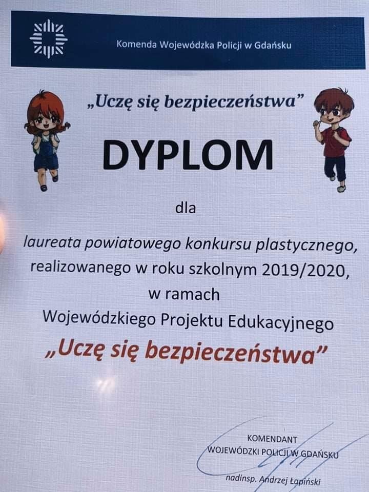 Dziś w Gdańsku odbyła się uroczysta gala finałowa działań w ramach Wojewódzkiego Projektu Edukacyjnego "Uczę się bezpieczeństwa". Jest nam miło poinformować, że wśród nagrodzonych znaleźli się uczniowie naszej szkoły- Agata Pilarska oraz Jakub Brzeski, którzy otrzymali tytuł laureata w powiatowym konkursie plastycznym organizowanym w ramach działań projektowych. Gratulujemy serdecznie.