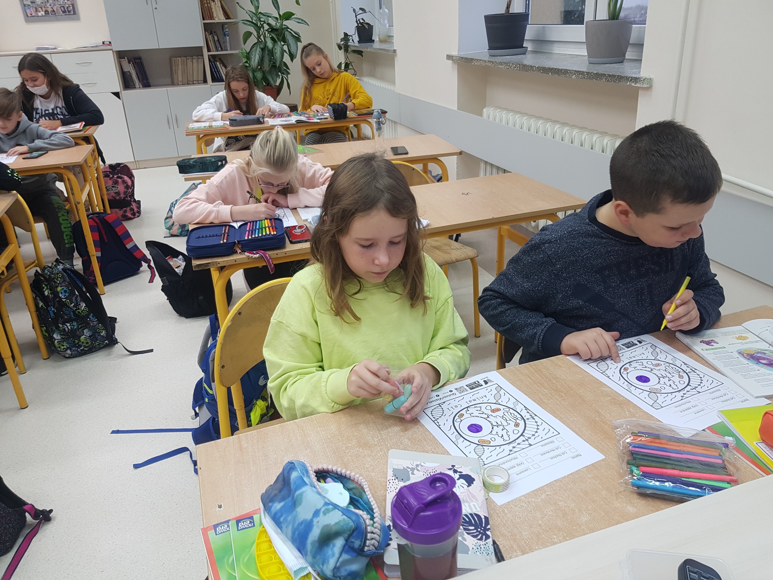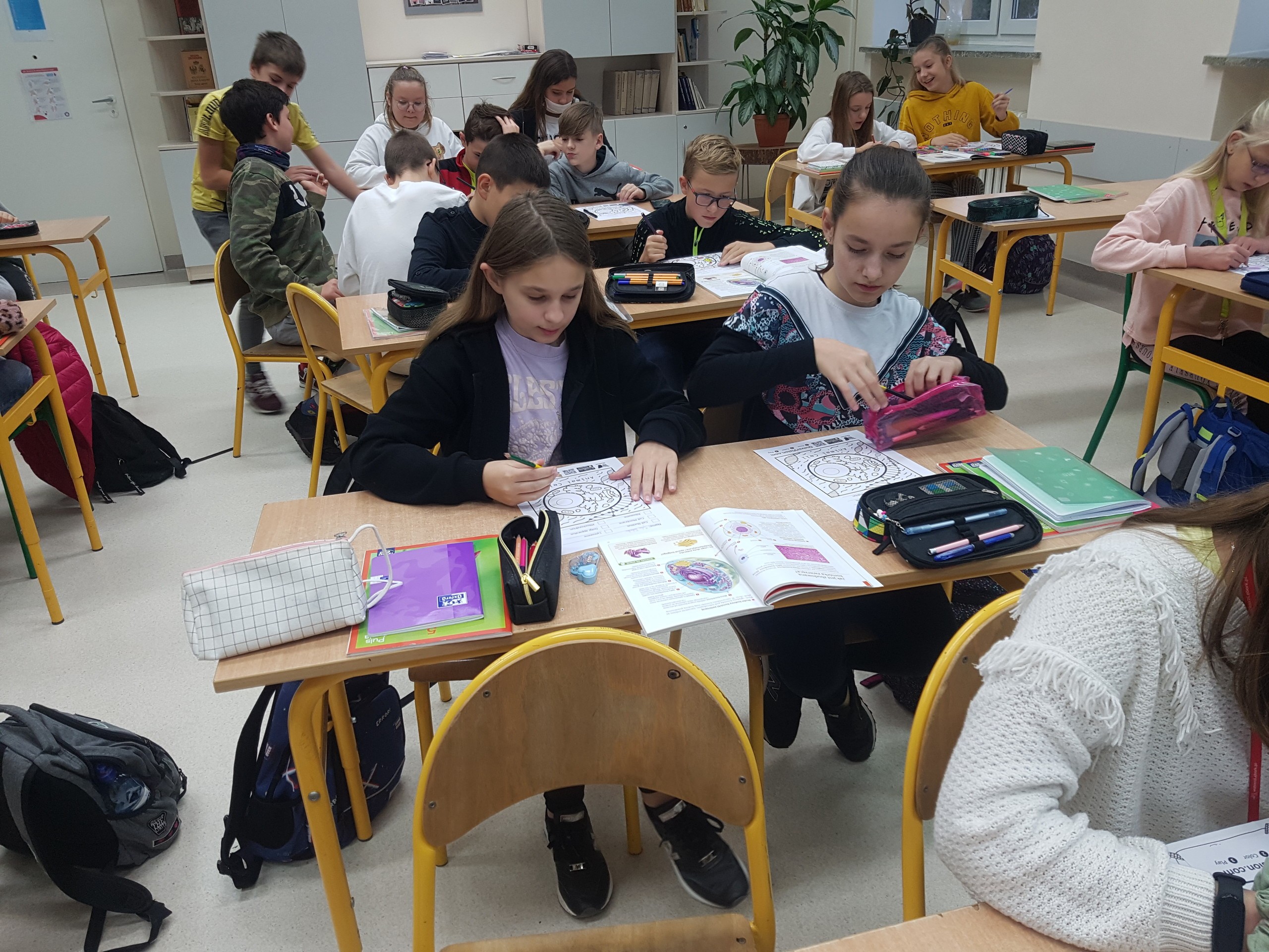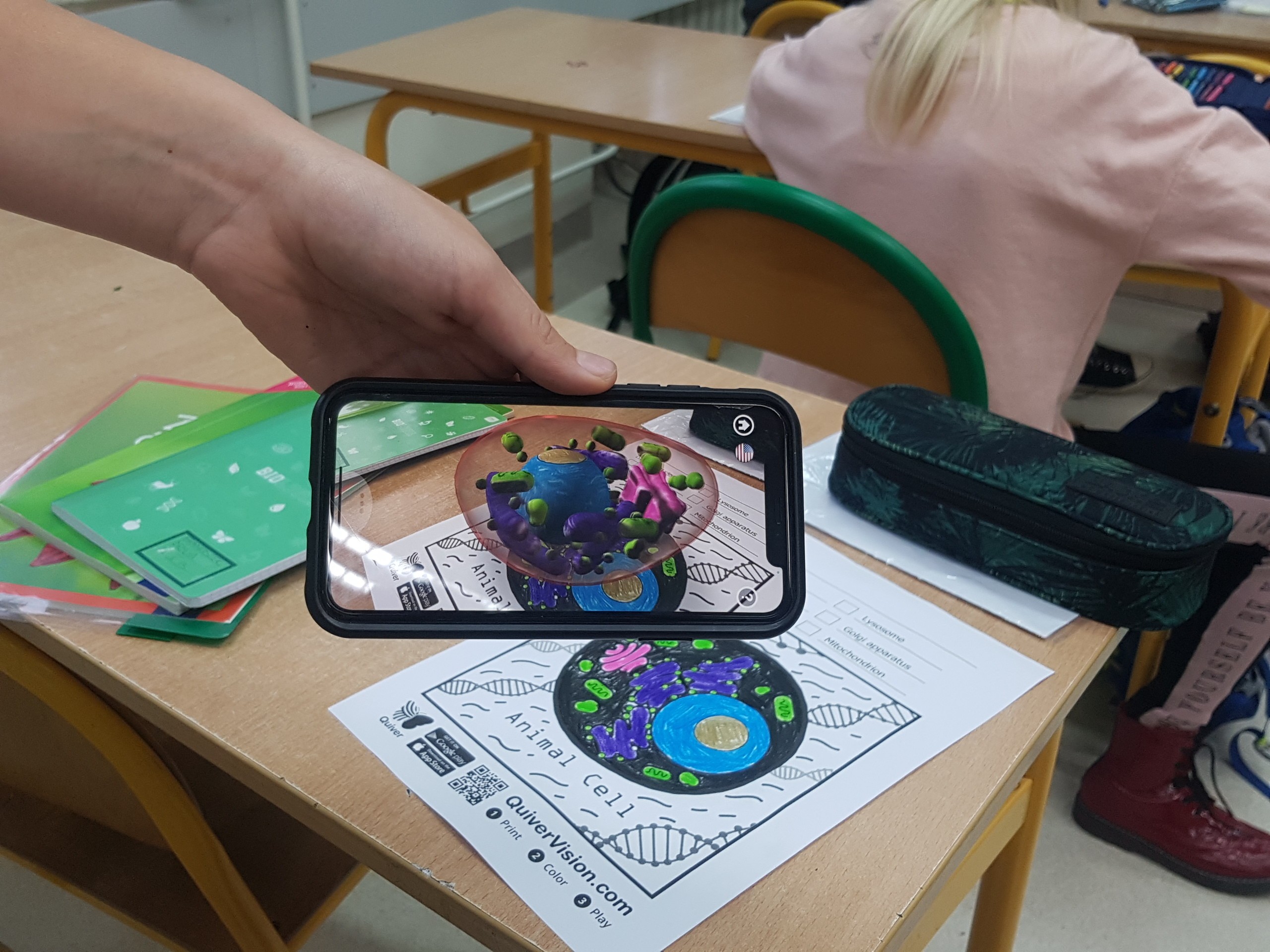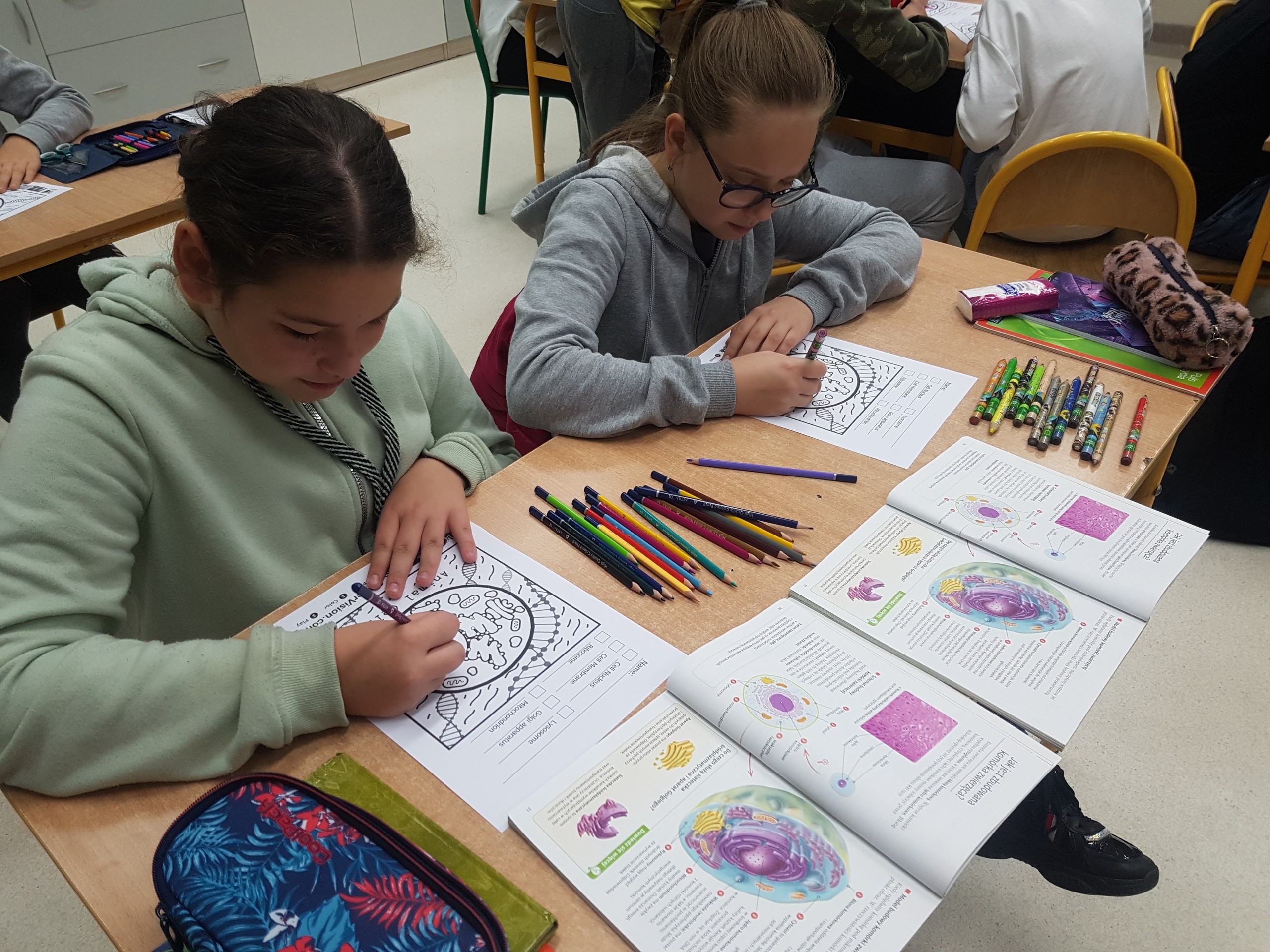 Na biologii uczniowie poznawali budowę komórki zwierzęcej. Podczas lekcji korzystano z rozszerzonej rzeczywistości. Dzięki aplikacji Quiver dzieci mogły obejrzeć wnętrze komórki w 3D. Wszyscy pracowali z dużym zaangażowaniem.