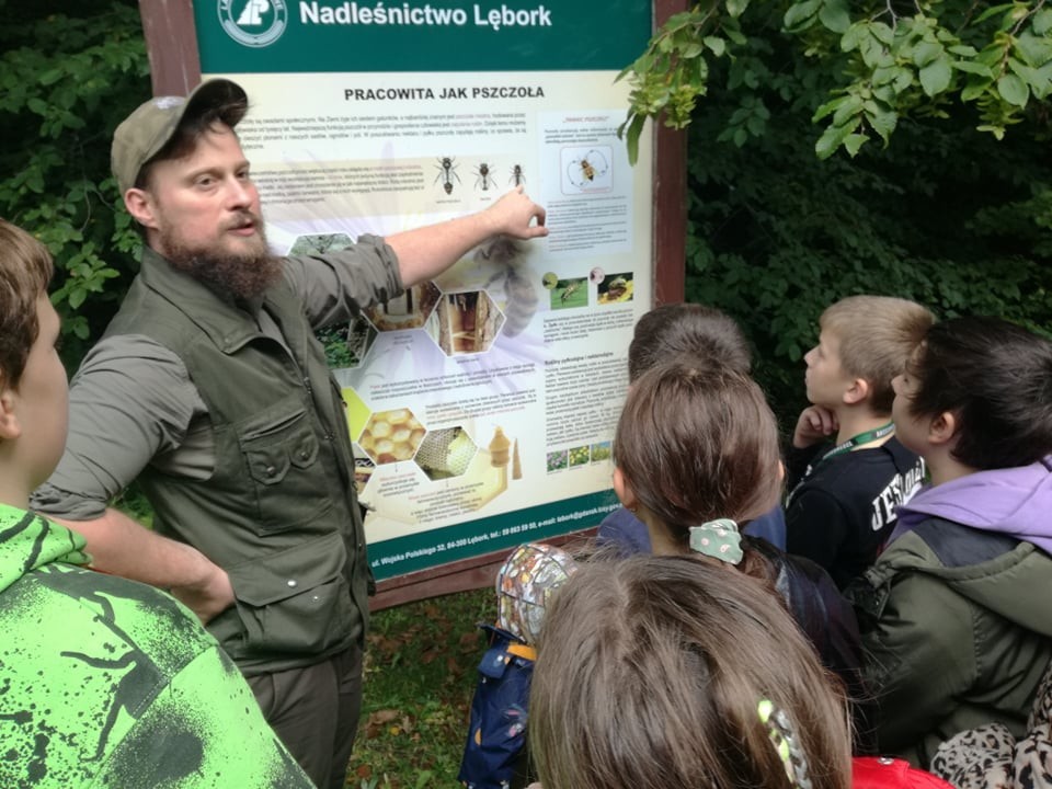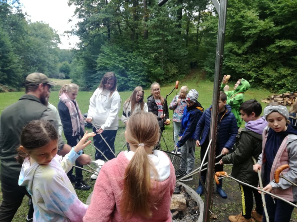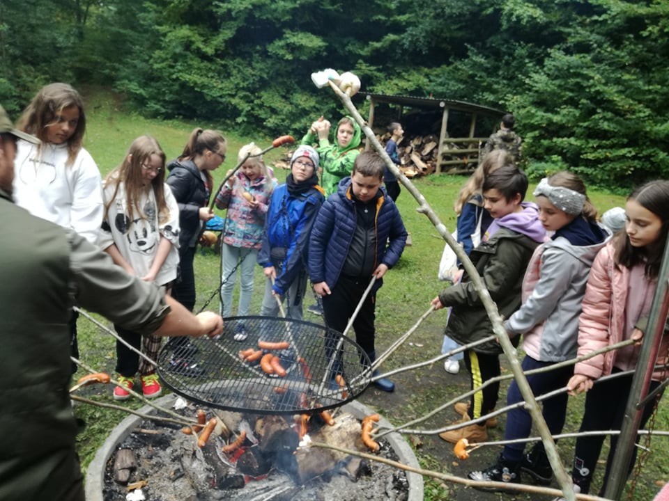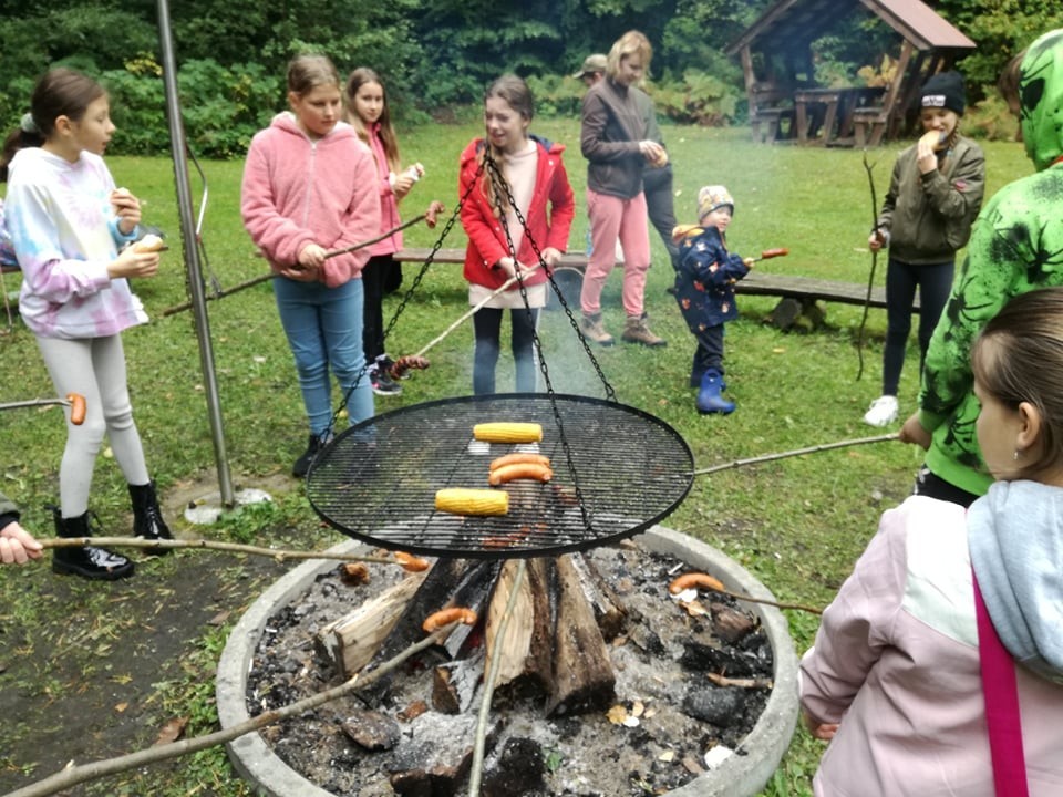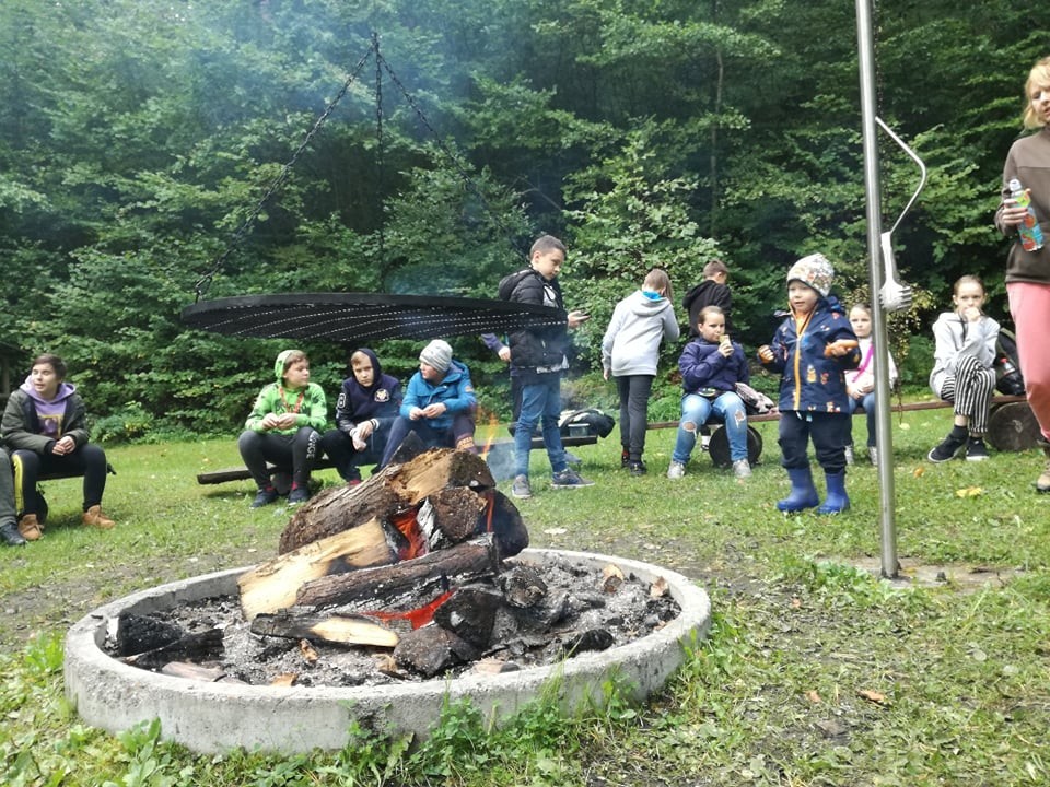 Uczniowie klas piątych ostatni piątek spędzili w lesie! Pogoda i humory dopisały. Przeszliśmy trasę ścieżką przyrodniczą oraz miło spędziliśmy czas w sali edukacyjnej. Rozmawialiśmy o zasadach zachowania się w lesie, wykorzystaniu drewna przez człowieka, rozpoznawaliśmy gatunki drzew, poznaliśmy sekrety z życia pszczół i ich znaczenie w przyrodzie … Działo się ! Na pewno tutaj wrócimy. Dzień zakończyliśmy ogniskiem i pieczonymi kiełbaskami.