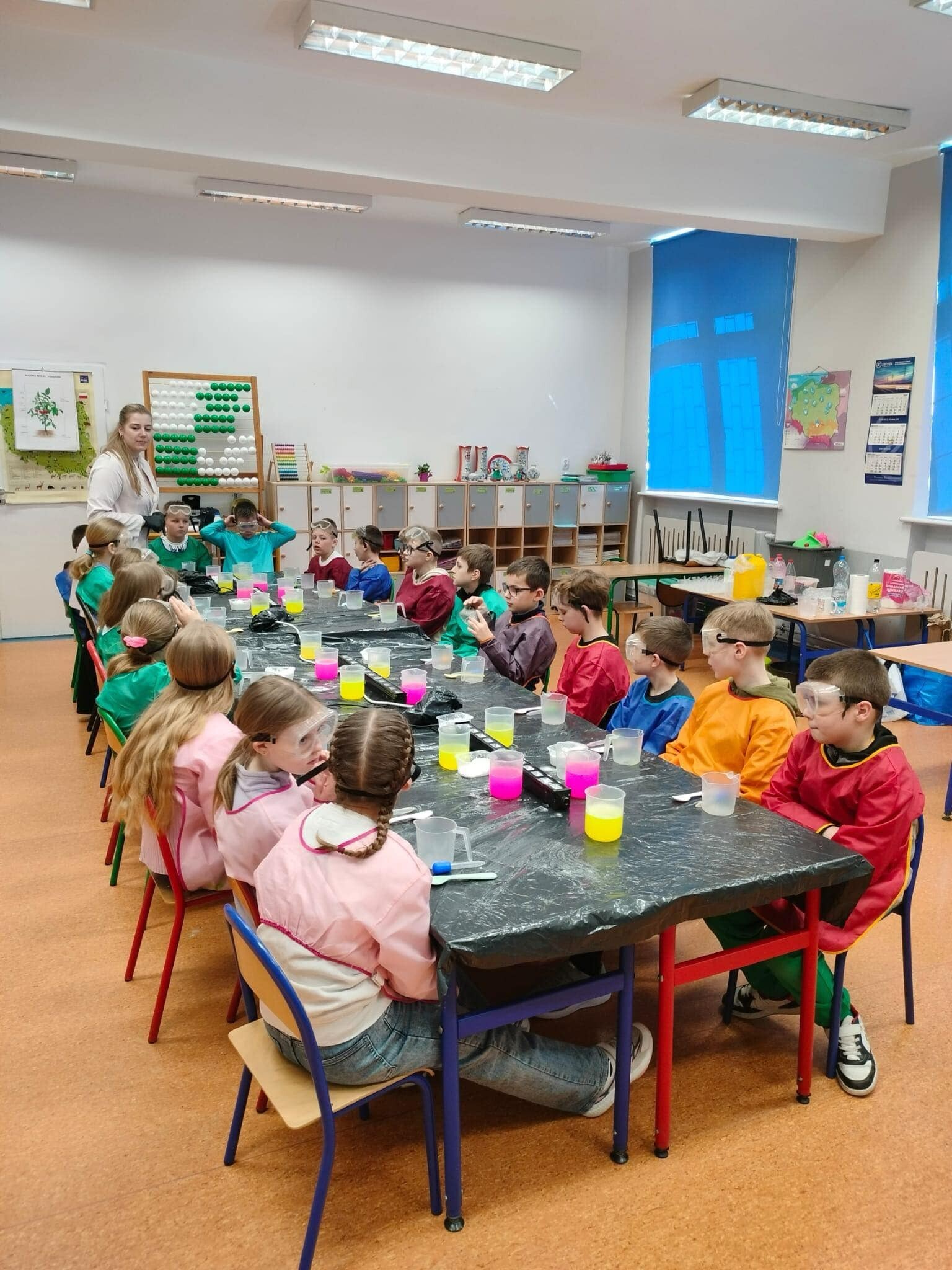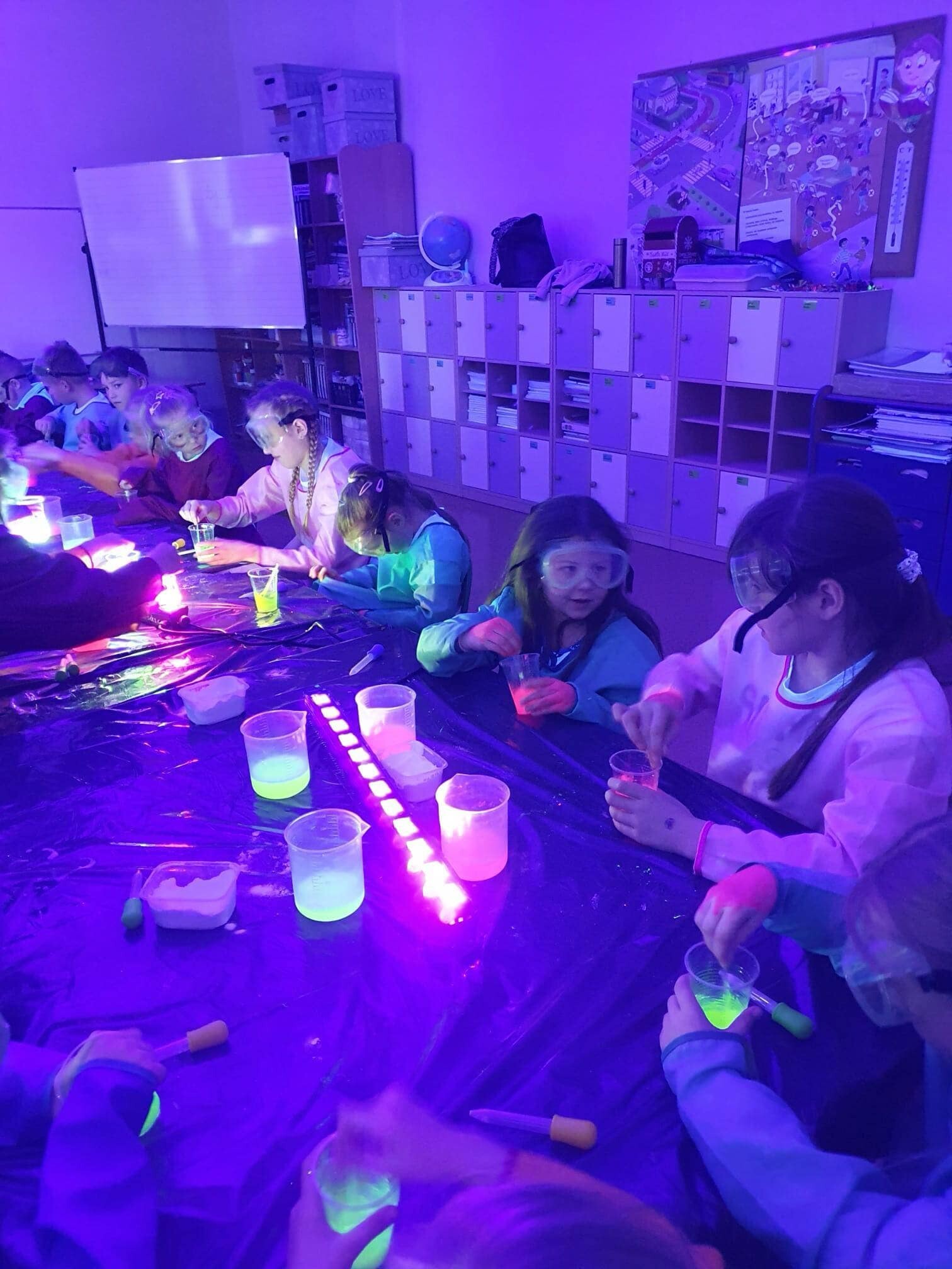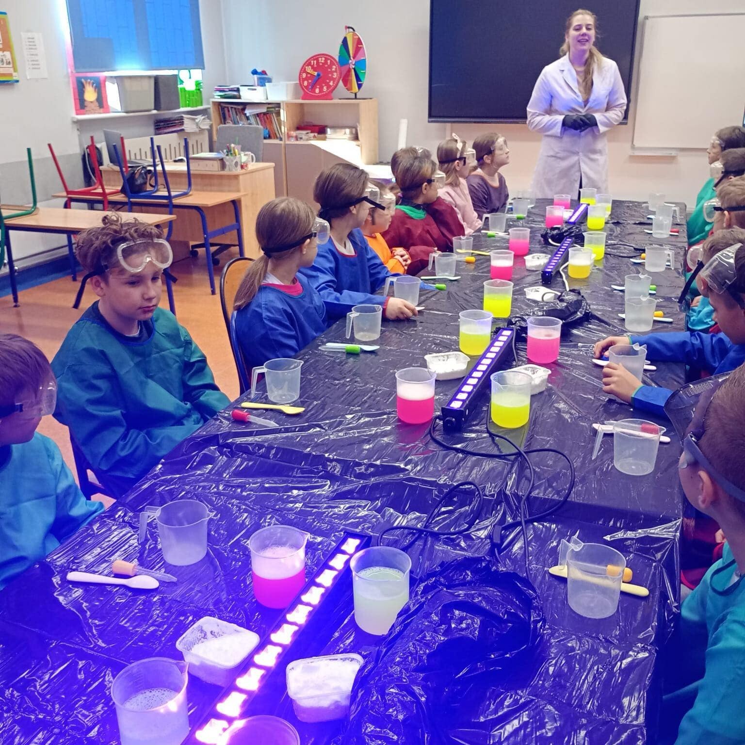 Podczas zajęć dzieci mogły samodzielnie eksperymentować, poznając właściwości różnych substancji oraz sposób ich łączenia. Największą atrakcją okazało się tworzenie fluorescencyjnych żelków – barwnych, świecących struktur, które nie tylko cieszyły oko, ale i pobudzały wyobraźnię. Uczniowie z ogromnym entuzjazmem obserwowali reakcje chemiczne i poznawali tajniki laboratoryjnych przyrządów.