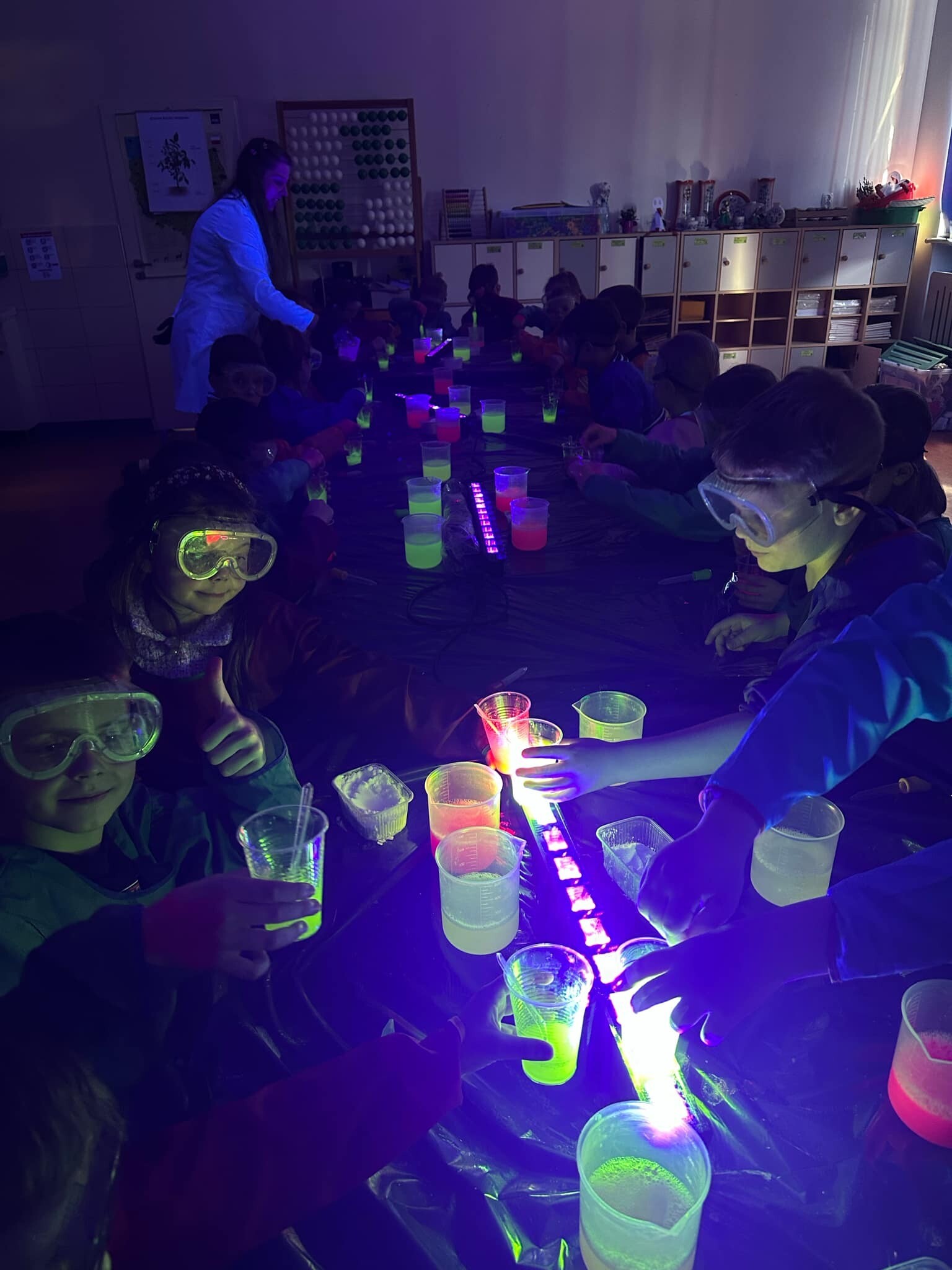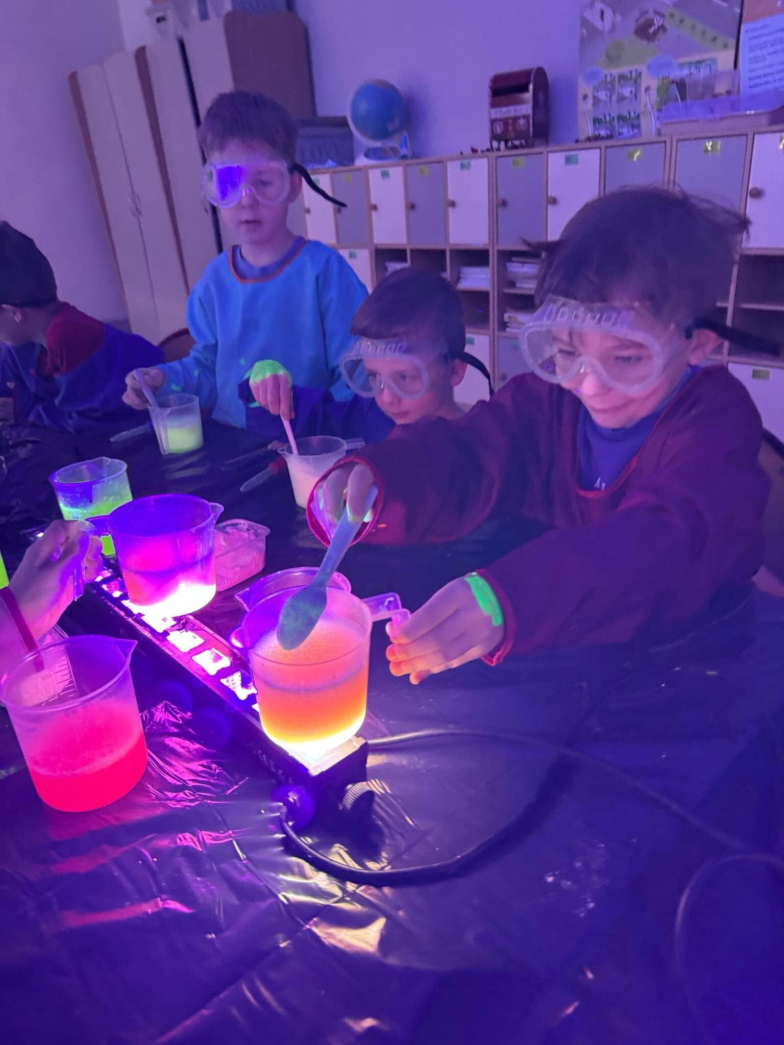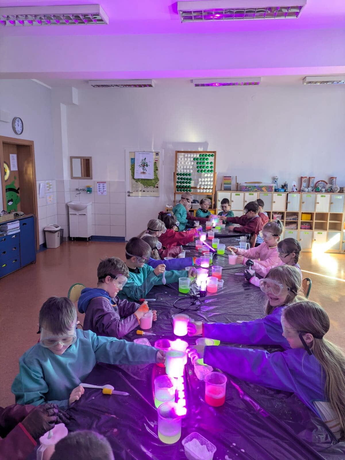 Podczas zajęć dzieci mogły samodzielnie eksperymentować, poznając właściwości różnych substancji oraz sposób ich łączenia. Największą atrakcją okazało się tworzenie fluorescencyjnych żelków – barwnych, świecących struktur, które nie tylko cieszyły oko, ale i pobudzały wyobraźnię. Uczniowie z ogromnym entuzjazmem obserwowali reakcje chemiczne i poznawali tajniki laboratoryjnych przyrządów.