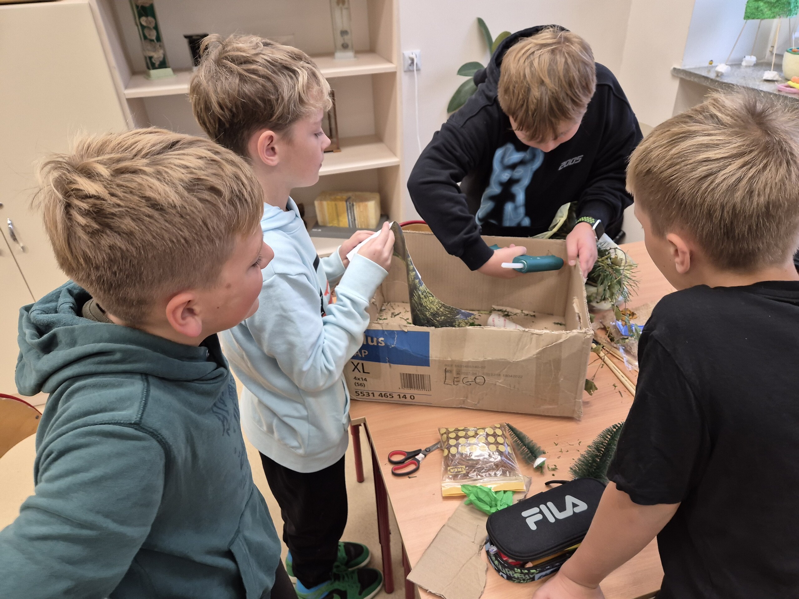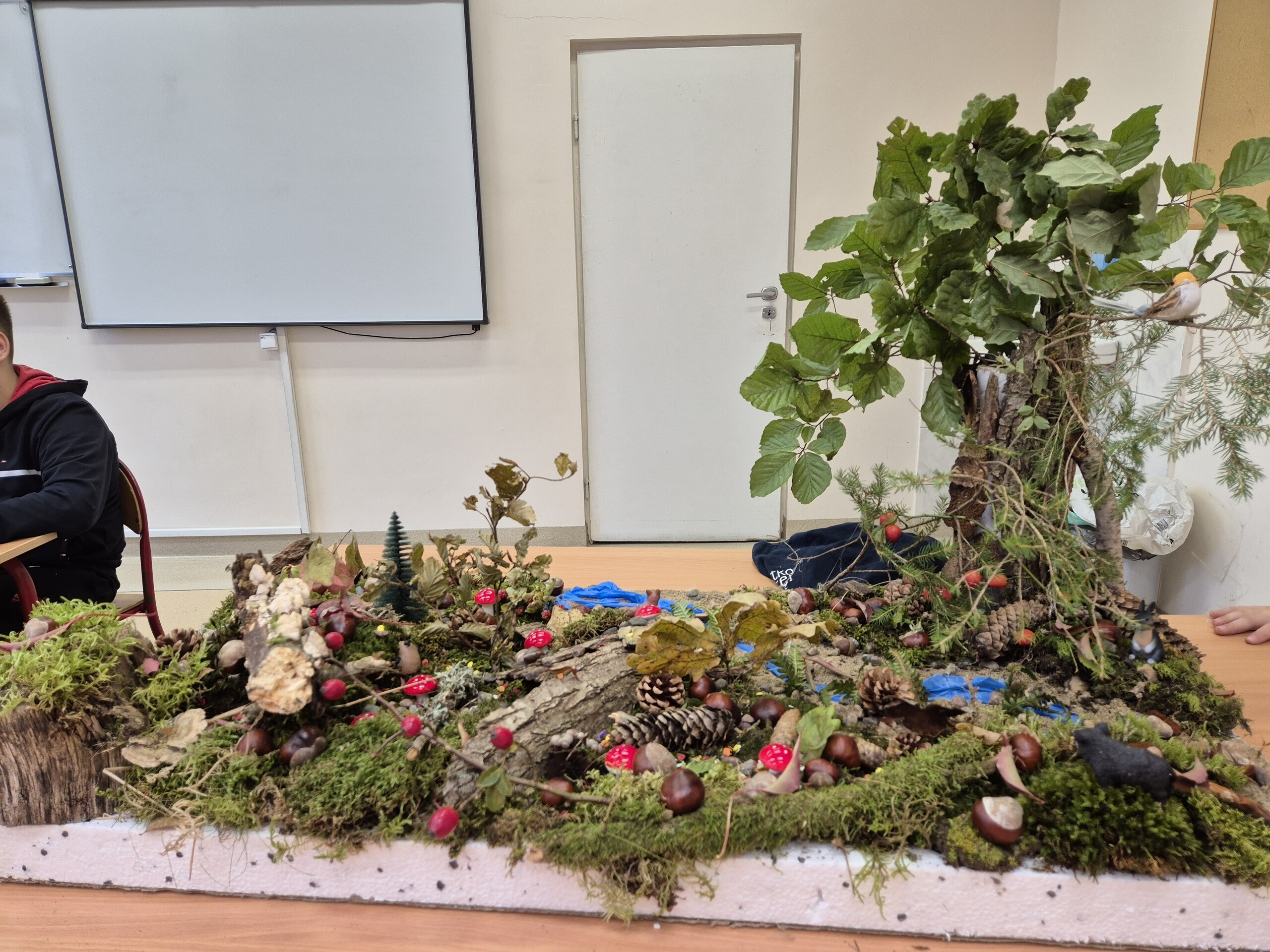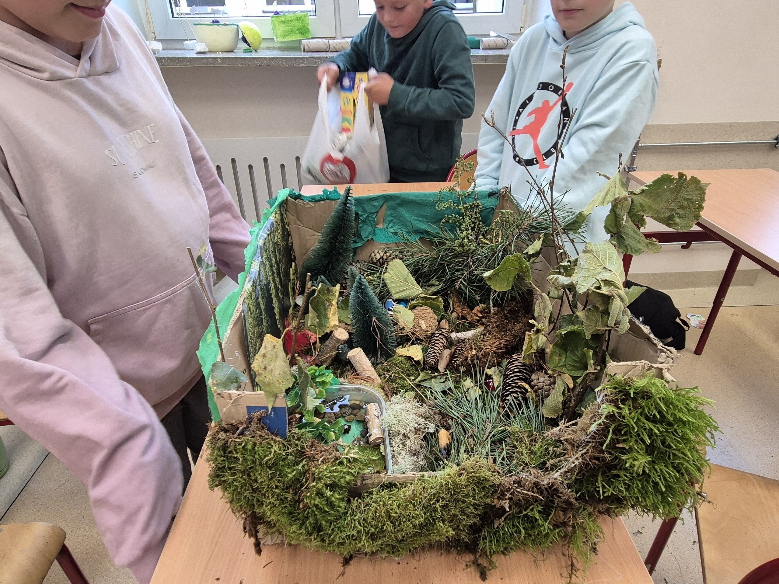Klasa 5a robiła projekt, polegający na wykonaniu makiet przedstawiających warstwy lasu. Uczniowie podzielili się na grupy i wspólnie pracowali nad swoimi dziełami. Każda grupa miała za zadanie oddać w swojej pracy najważniejsze elementy czterech głównych warstw lasu: ściółki, runa leśnego, podszytu i korony drzew. Wszystkie materiały potrzebne do realizacji projektu zorganizowali samodzielnie – od kartonów, plasteliny i farb, po gałązki i liście zebrane podczas spacerów w lesie.