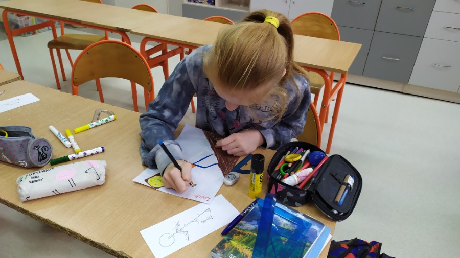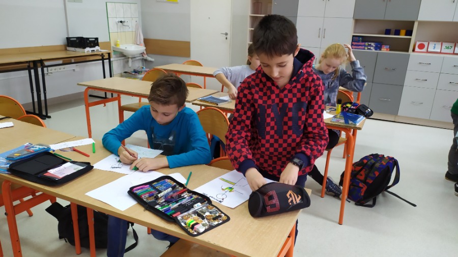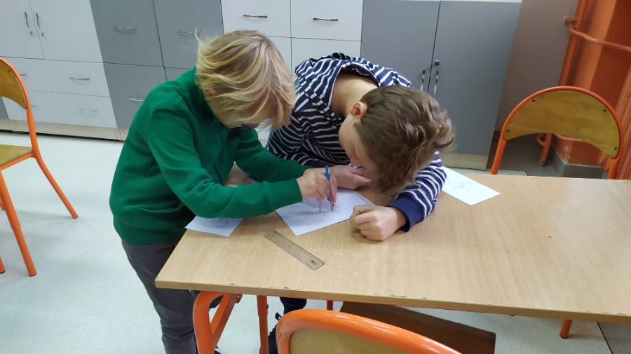 Klasy piąte zapoznają się ostatnio z tematyką kątów i tójkątów. Rysują kąty o podanej mierze, a także konstruują trójkąty przy użyciu cyrkla i ekierki. Nie jest to łatwe, jednak piątoklasiści świetnie sobie radzą i wychodzą spod ich ołówków bardzo ciekawe prace plastyczne ;)