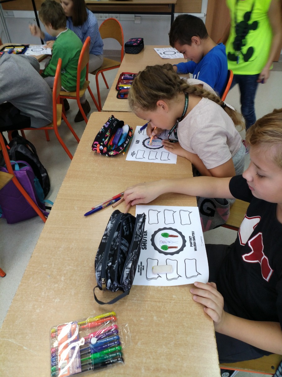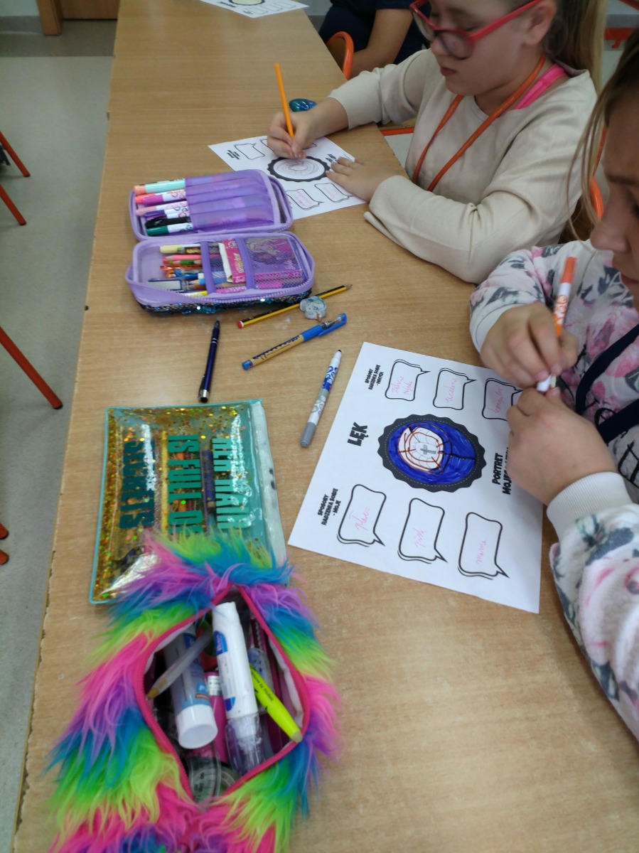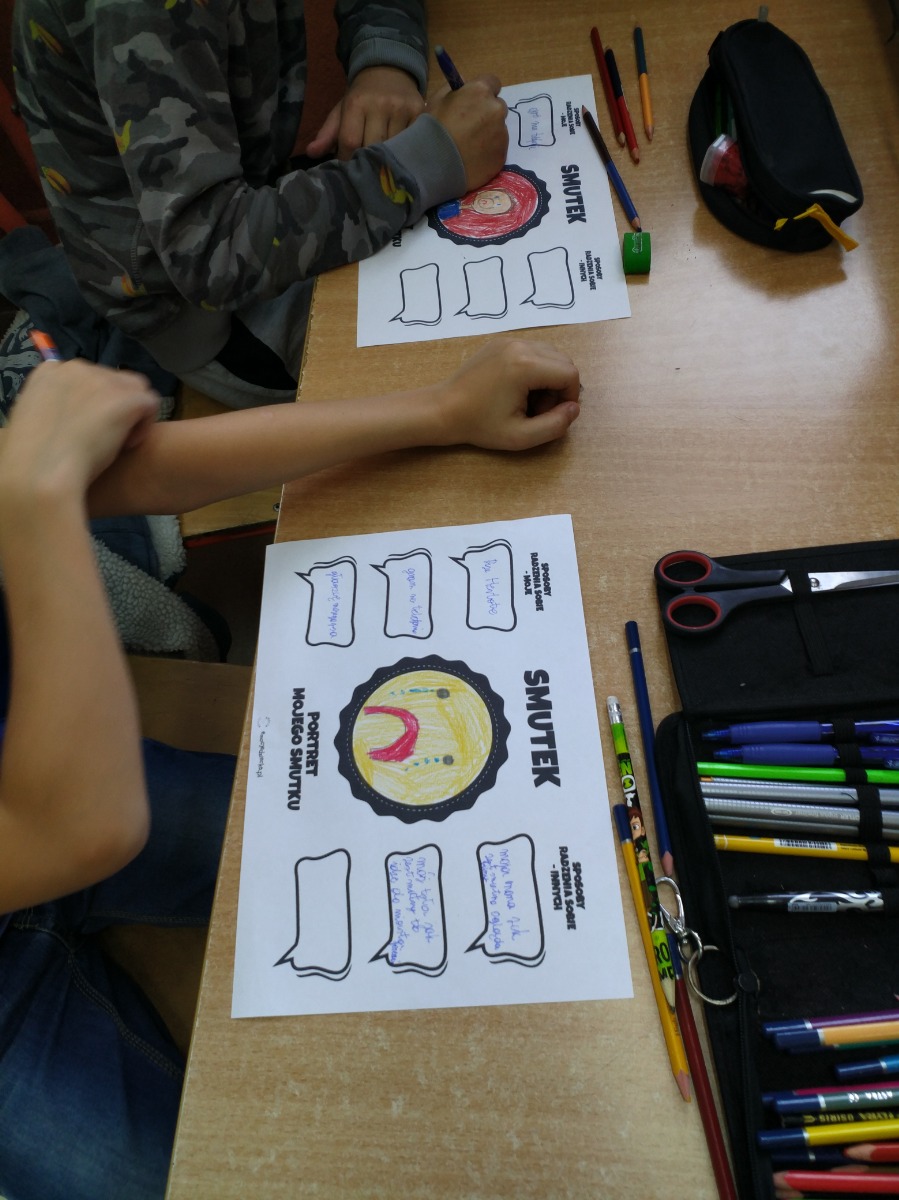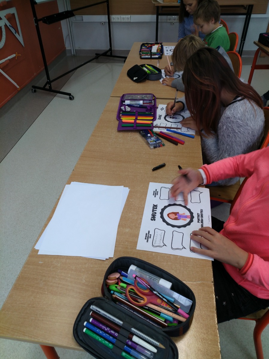 „Portret moich emocji” ; ” Kiedy… Czuję… Potrzebuję…”. Celem warsztatów była refleksja nad własnymi emocjami i sposobami radzenia sobie z nimi. Zajęcia miały za zadanie pomóc uczniom zrozumieć ich reakcje na różne emocje. Ćwiczenia pozwoliły również określić, czy i w jaki sposób inne osoby mogą pomóc i wesprzeć innych w sytuacjach, gdy pojawiają się trudne uczucia.