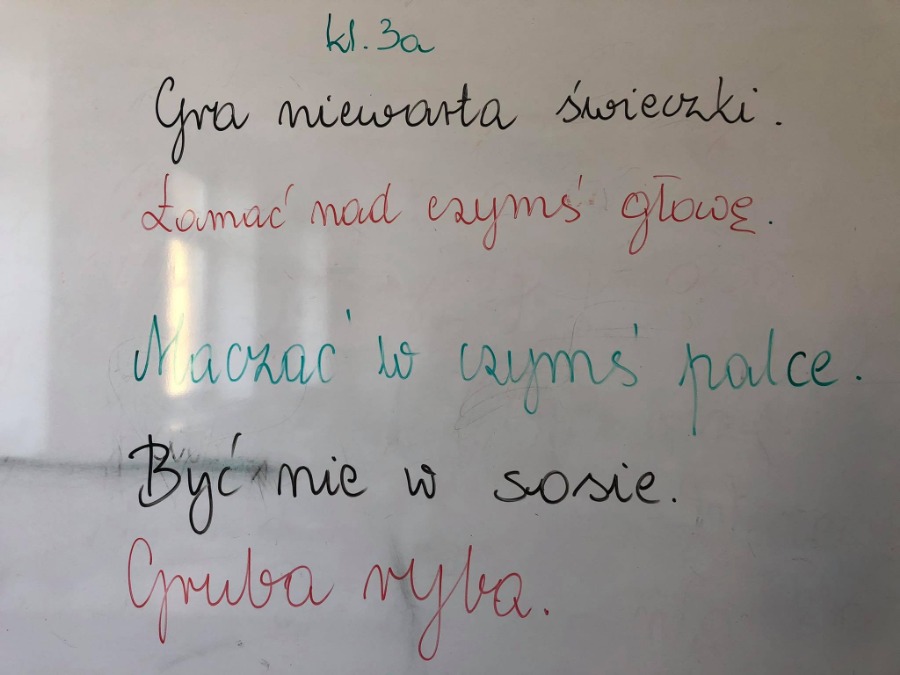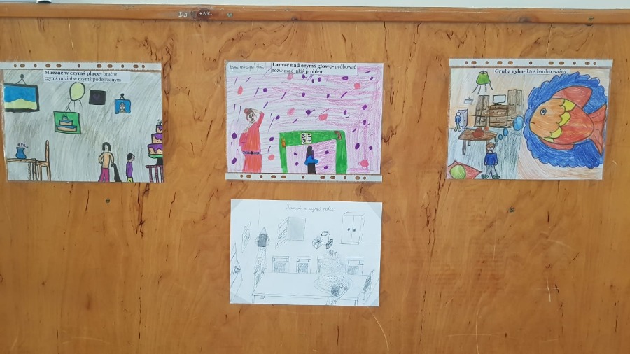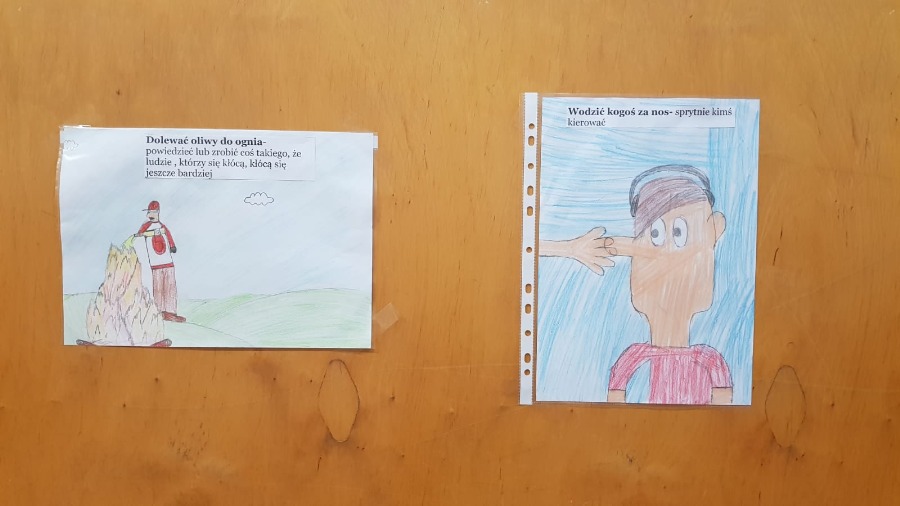 W ramach święta, w czasie zajęć logopedycznych i zajęć z edukacji polonistycznej uczniowie klas I- III poznawali wybrane związki frazeologiczne. Dzieci słuchały krótkich opowiadań z książki Grzegorza Kasdepke pod tytułem „Co to znaczy…”, a następnie, po omówieniu tworzyły prace plastyczne z wybranym związkiem frazeologicznym. Dzięki zajęciom uczniowie mieli okazję dowiedzieć się co znaczy między innymi: kwaśna mina, gruba ryba, łamać nad czymś głowę, mieć dwie lewe ręce, robić do kogoś maślane oczy, maczać w czymś palce, spiorunować kogoś wzrokiem, stawać na rzęsach, strach ma wielkie oczy, wodzić kogoś za nos, zakazany owoc, czy rzucać słowa na wiatr.