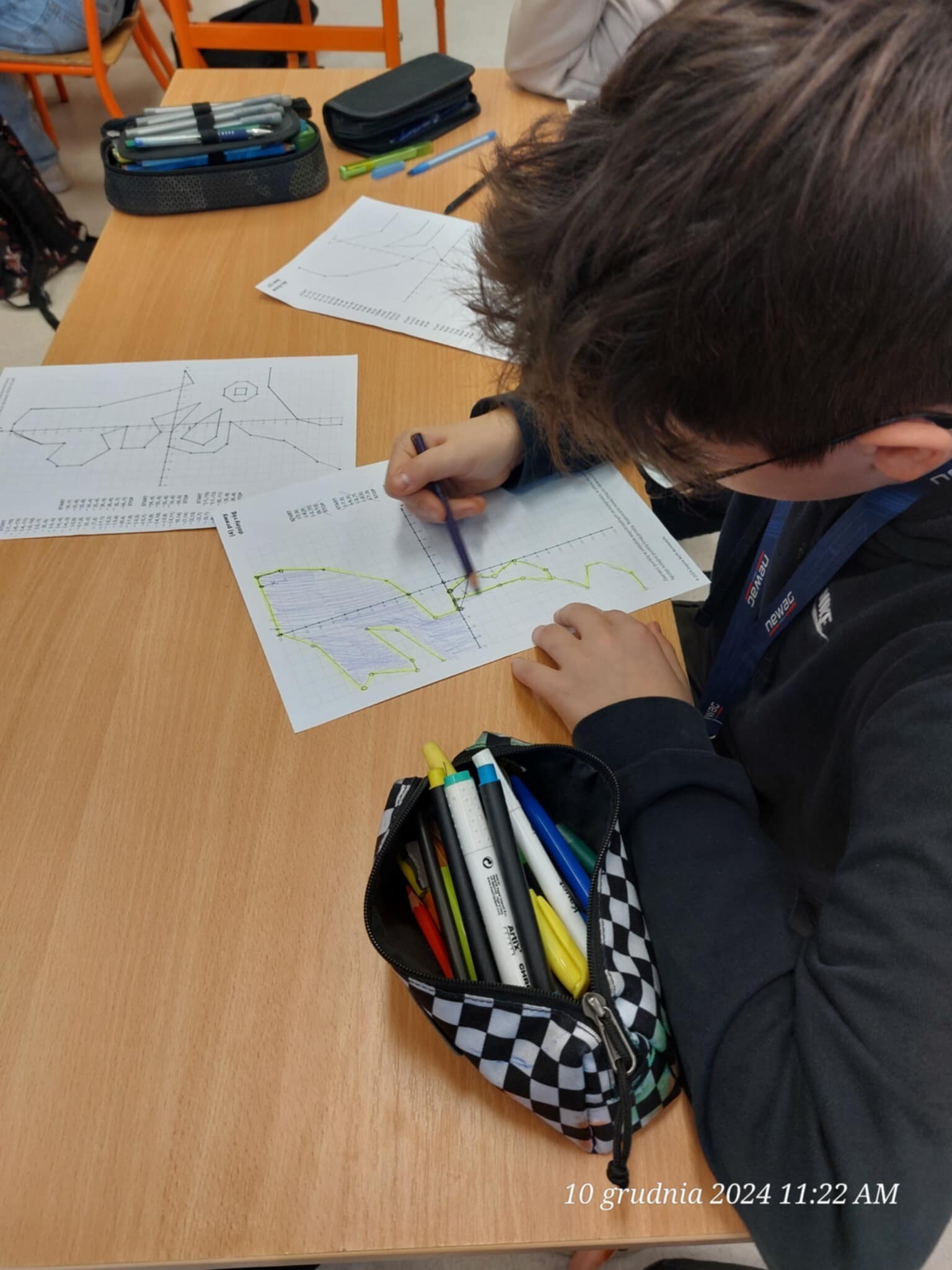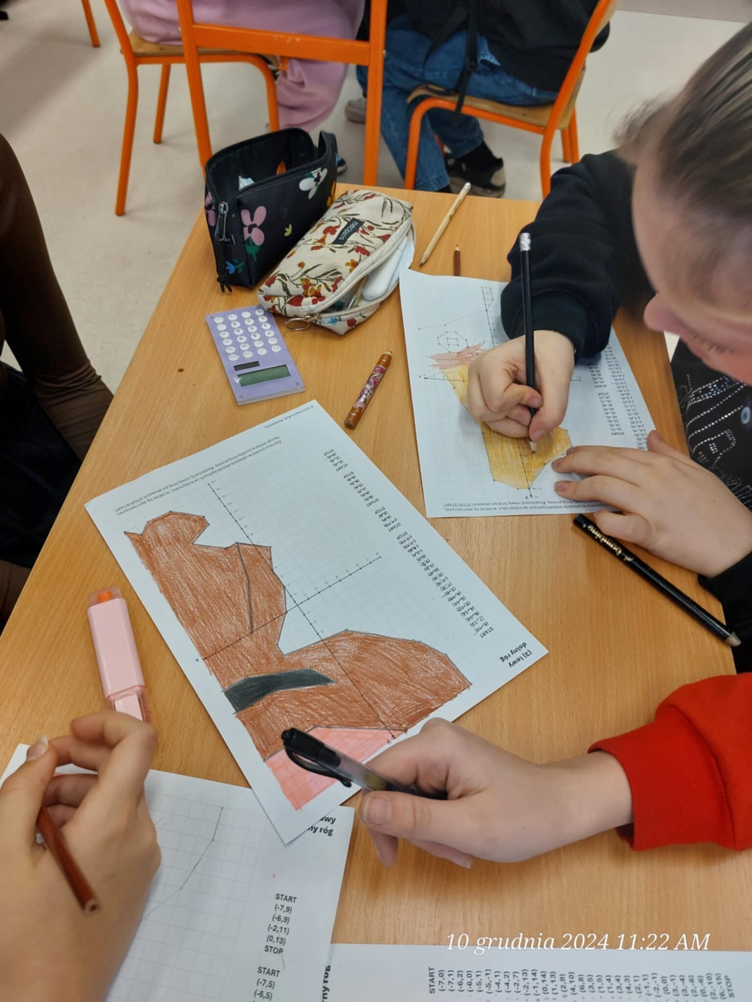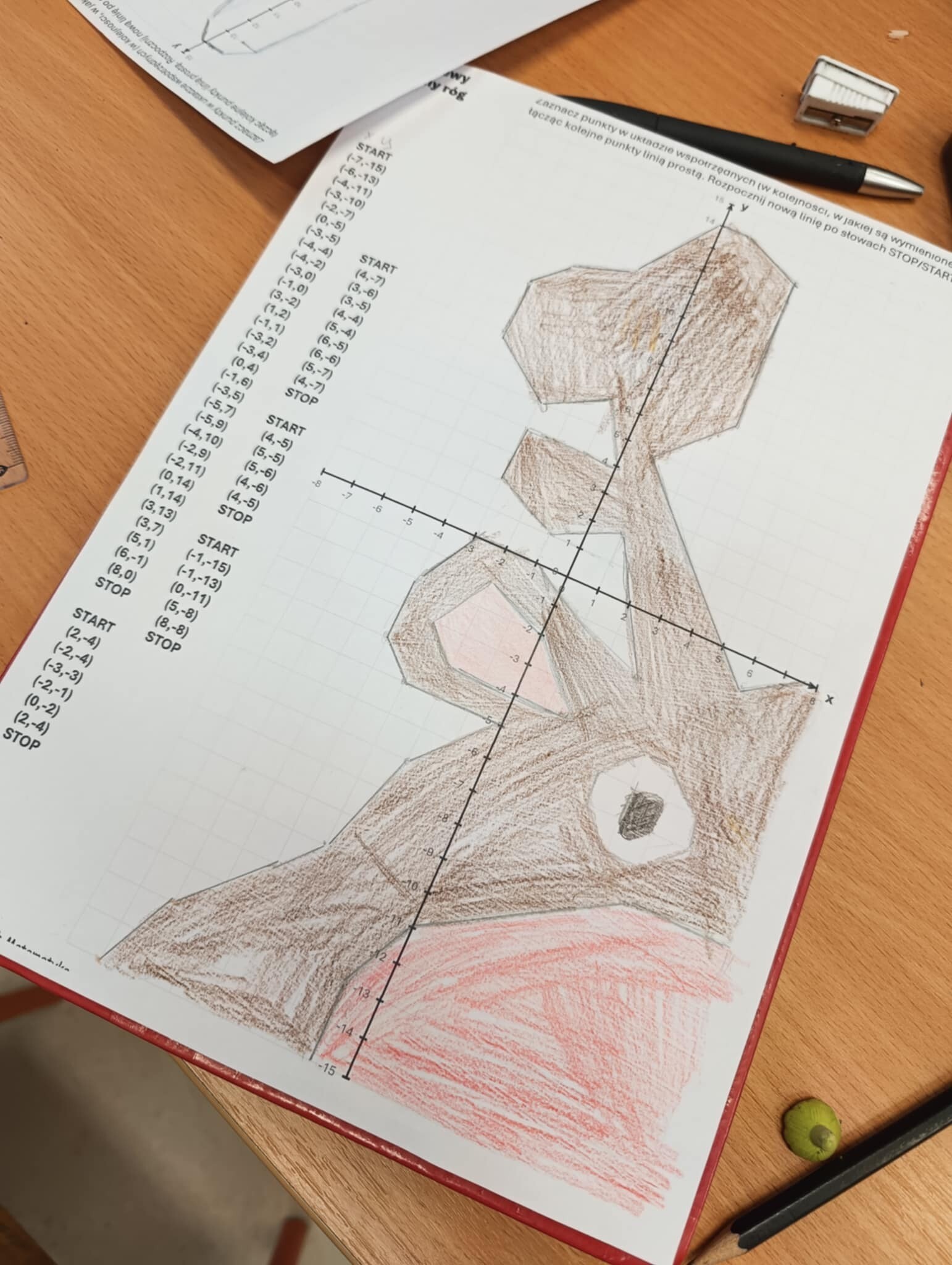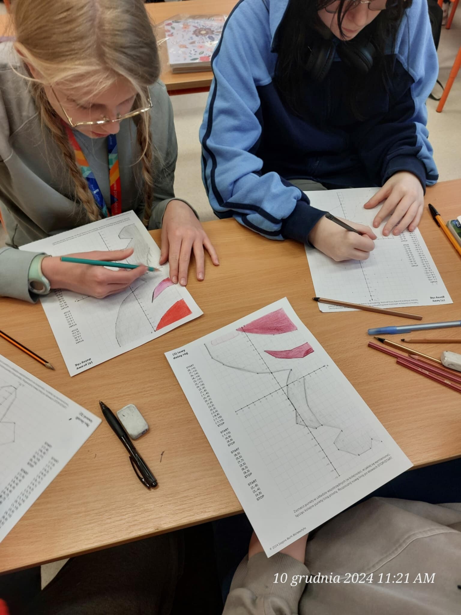 Podczas lekcji matematyki w Mikołajki uczniowie klasy 7a i 8b pracowali w grupach, odkrywając obrazek renifera ukryty w układzie współrzędnym. Każda grupa rozwiązywała zadania, aby odnaleźć odpowiednie punkty na wykresie, a następnie kolorowała odkrytego renifera według własnych pomysłów. Dzięki współpracy, zaangażowaniu i odrobinie wyobraźni, lekcje stała się nie tylko naukowym wyzwaniem, ale także wspaniałą zabawą, która wprowadziła świąteczny nastrój do klasy!