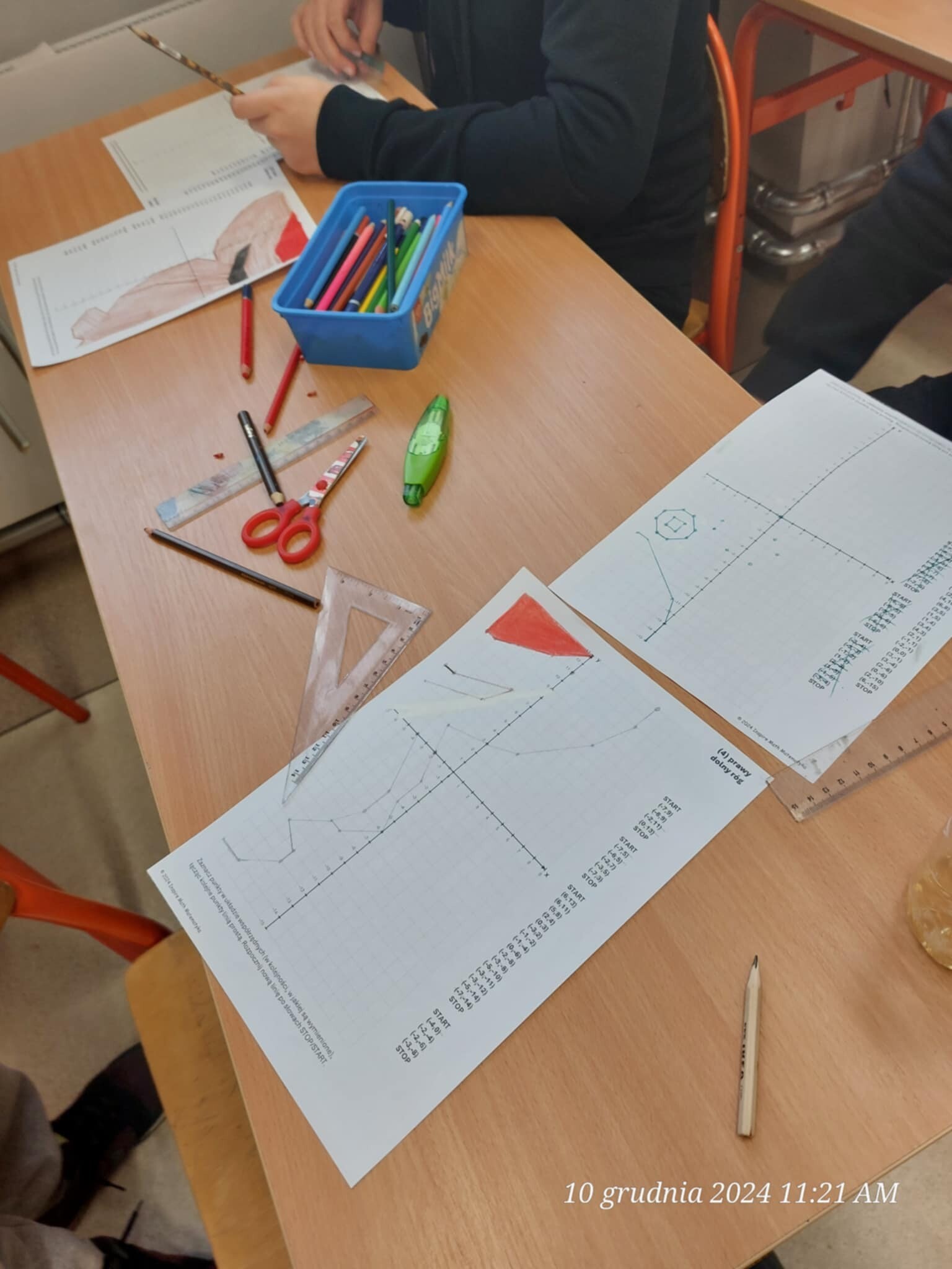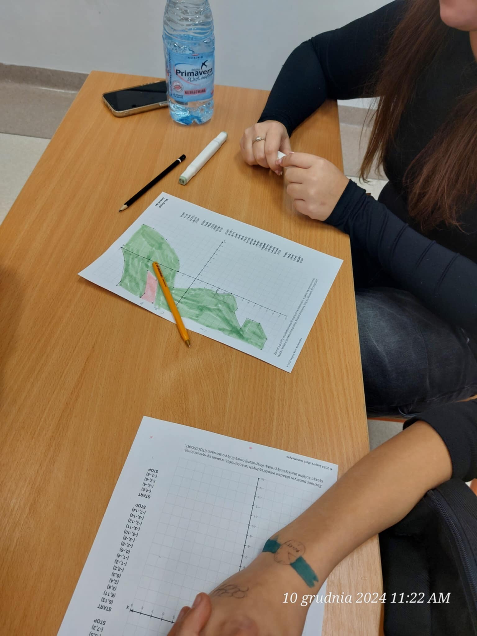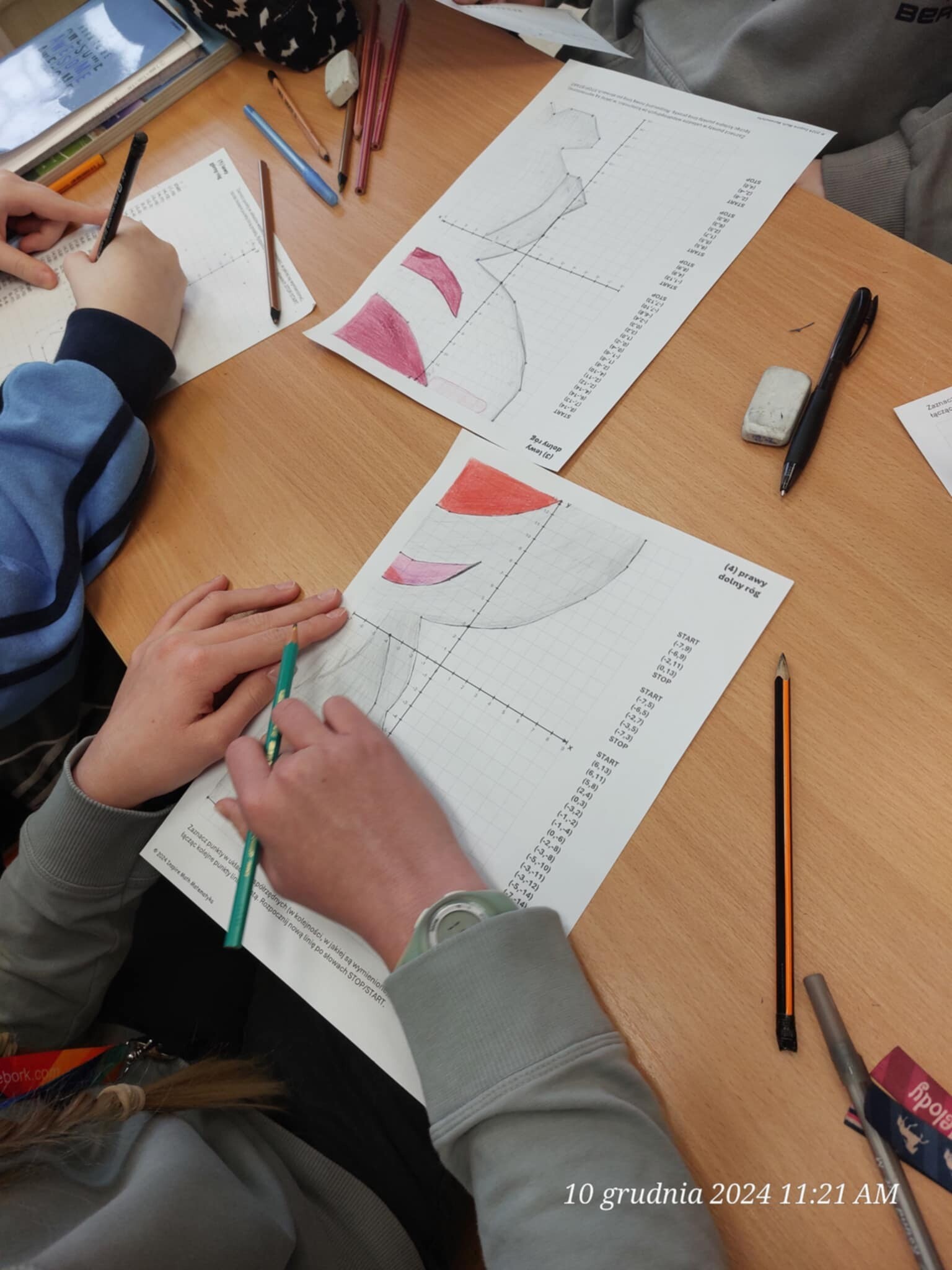 Podczas lekcji matematyki w Mikołajki uczniowie klasy 7a i 8b pracowali w grupach, odkrywając obrazek renifera ukryty w układzie współrzędnym. Każda grupa rozwiązywała zadania, aby odnaleźć odpowiednie punkty na wykresie, a następnie kolorowała odkrytego renifera według własnych pomysłów. Dzięki współpracy, zaangażowaniu i odrobinie wyobraźni, lekcje stała się nie tylko naukowym wyzwaniem, ale także wspaniałą zabawą, która wprowadziła świąteczny nastrój do klasy!