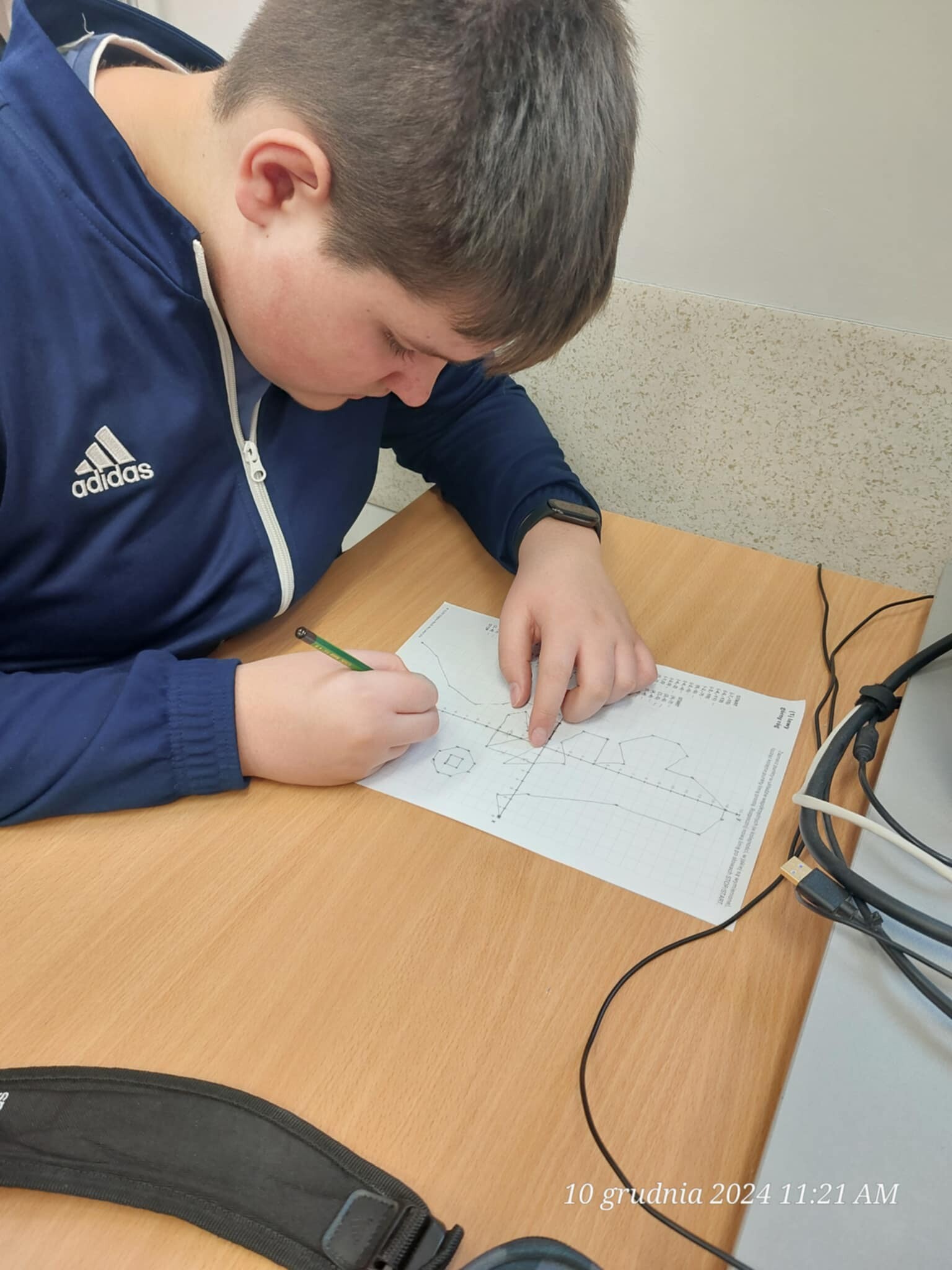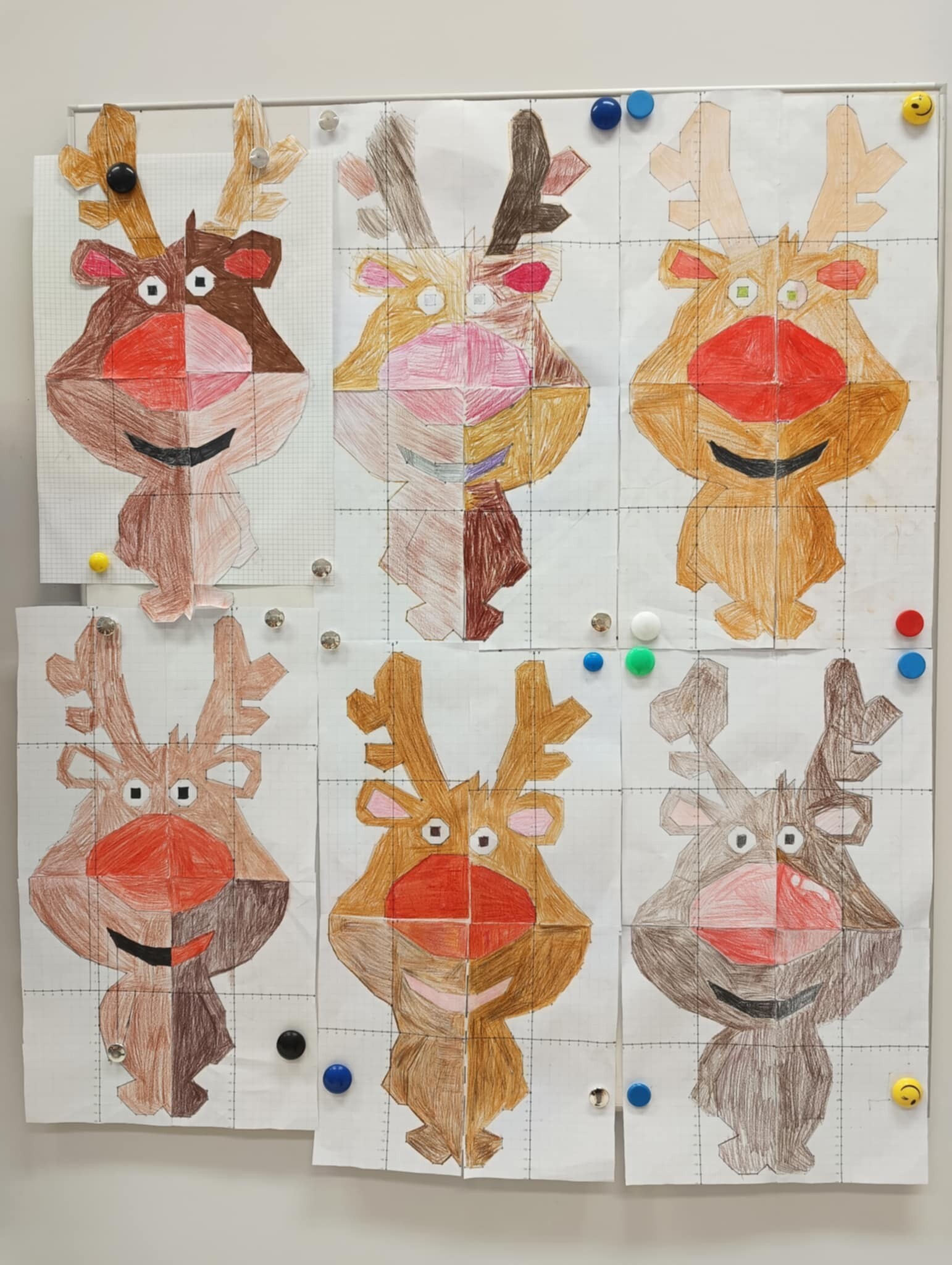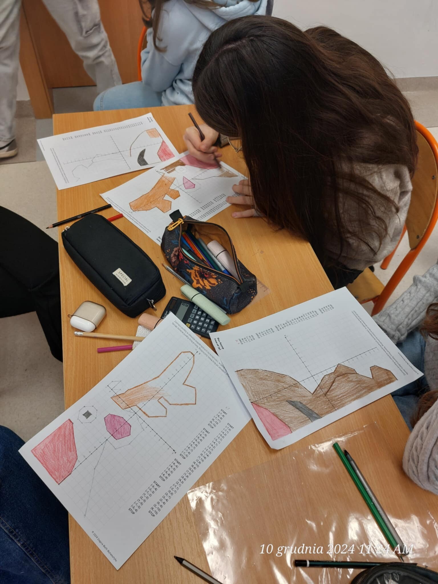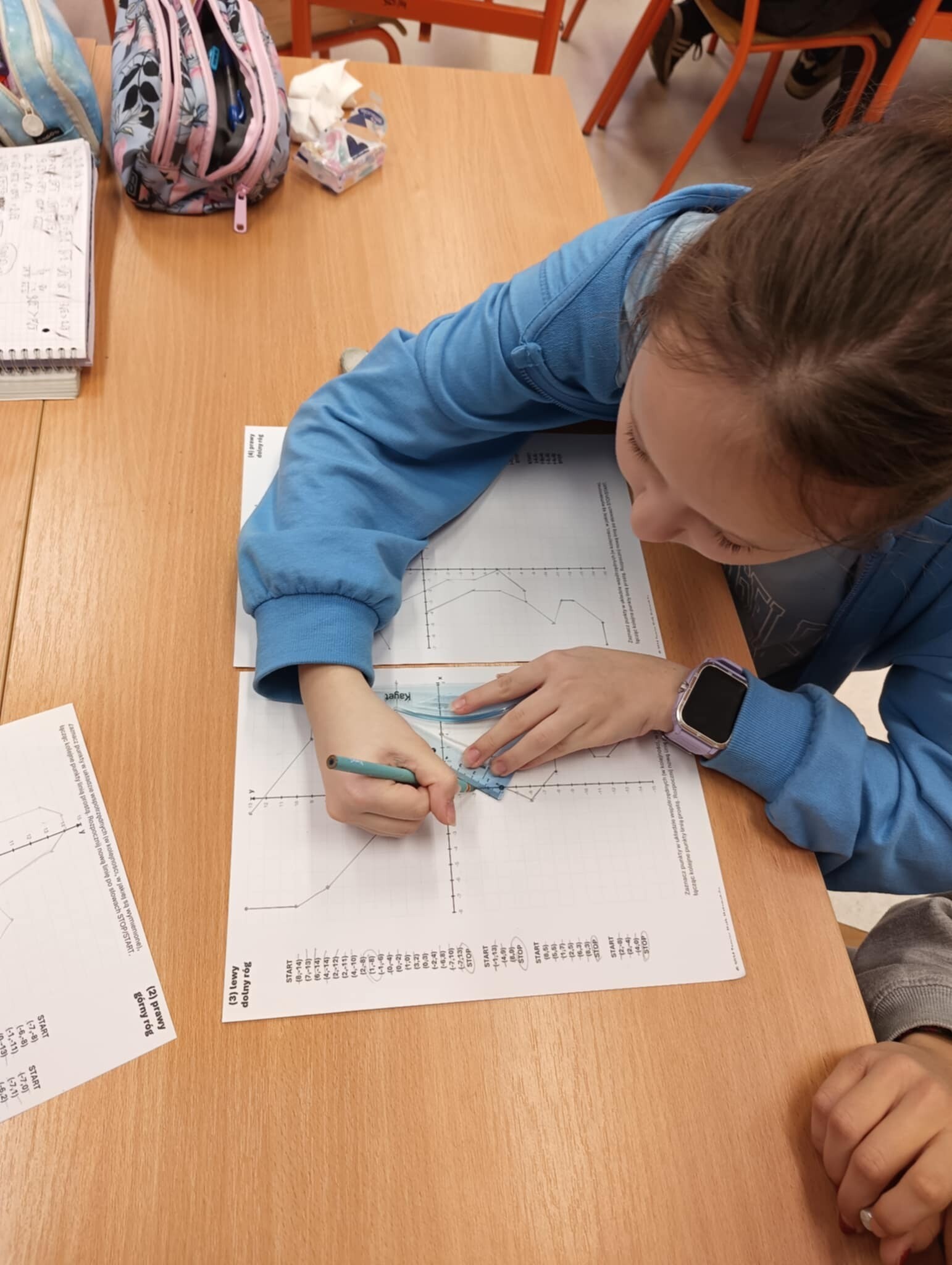Podczas lekcji matematyki w Mikołajki uczniowie klasy 7a i 8b pracowali w grupach, odkrywając obrazek renifera ukryty w układzie współrzędnym. Każda grupa rozwiązywała zadania, aby odnaleźć odpowiednie punkty na wykresie, a następnie kolorowała odkrytego renifera według własnych pomysłów. Dzięki współpracy, zaangażowaniu i odrobinie wyobraźni, lekcje stała się nie tylko naukowym wyzwaniem, ale także wspaniałą zabawą, która wprowadziła świąteczny nastrój do klasy!