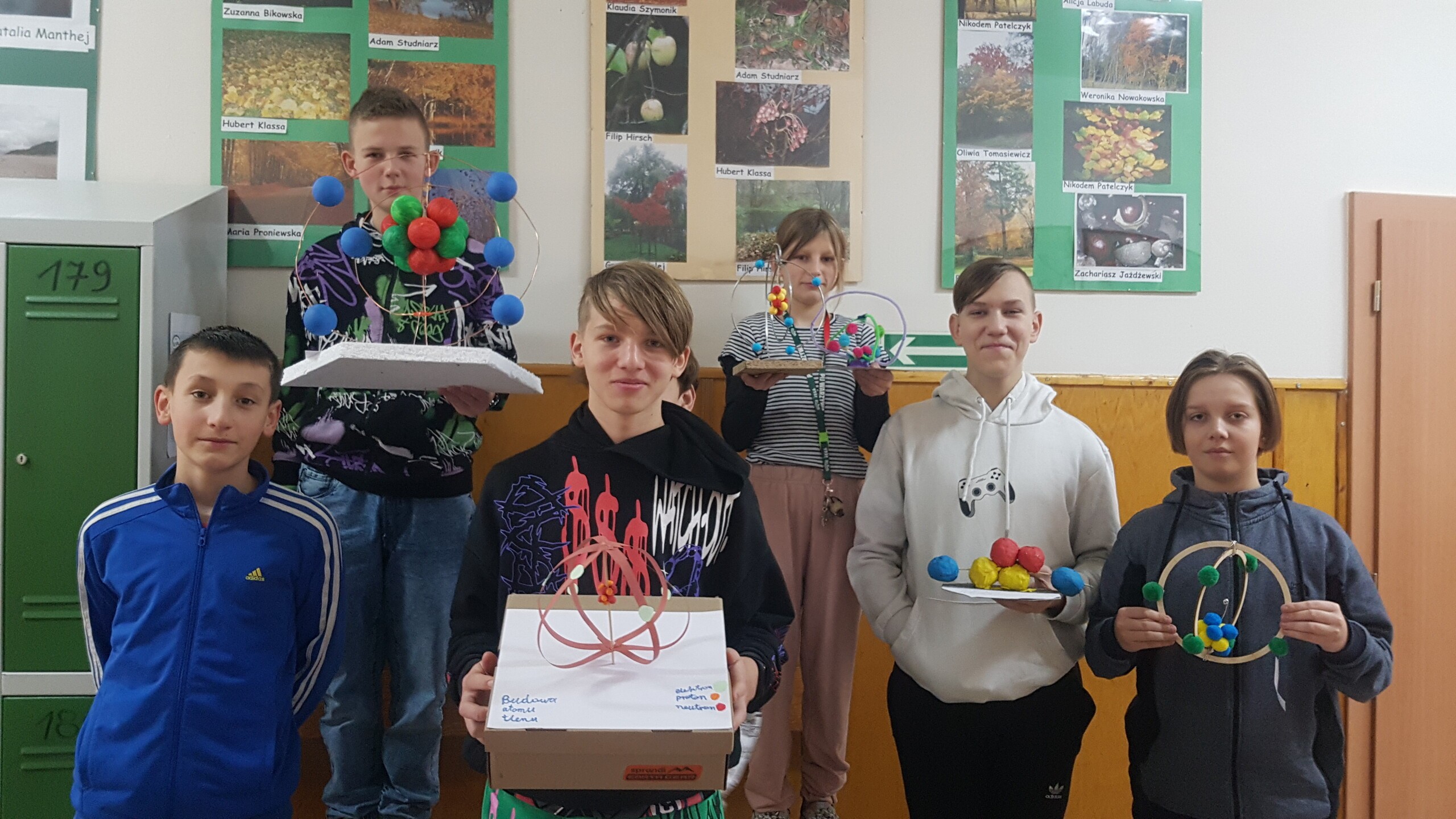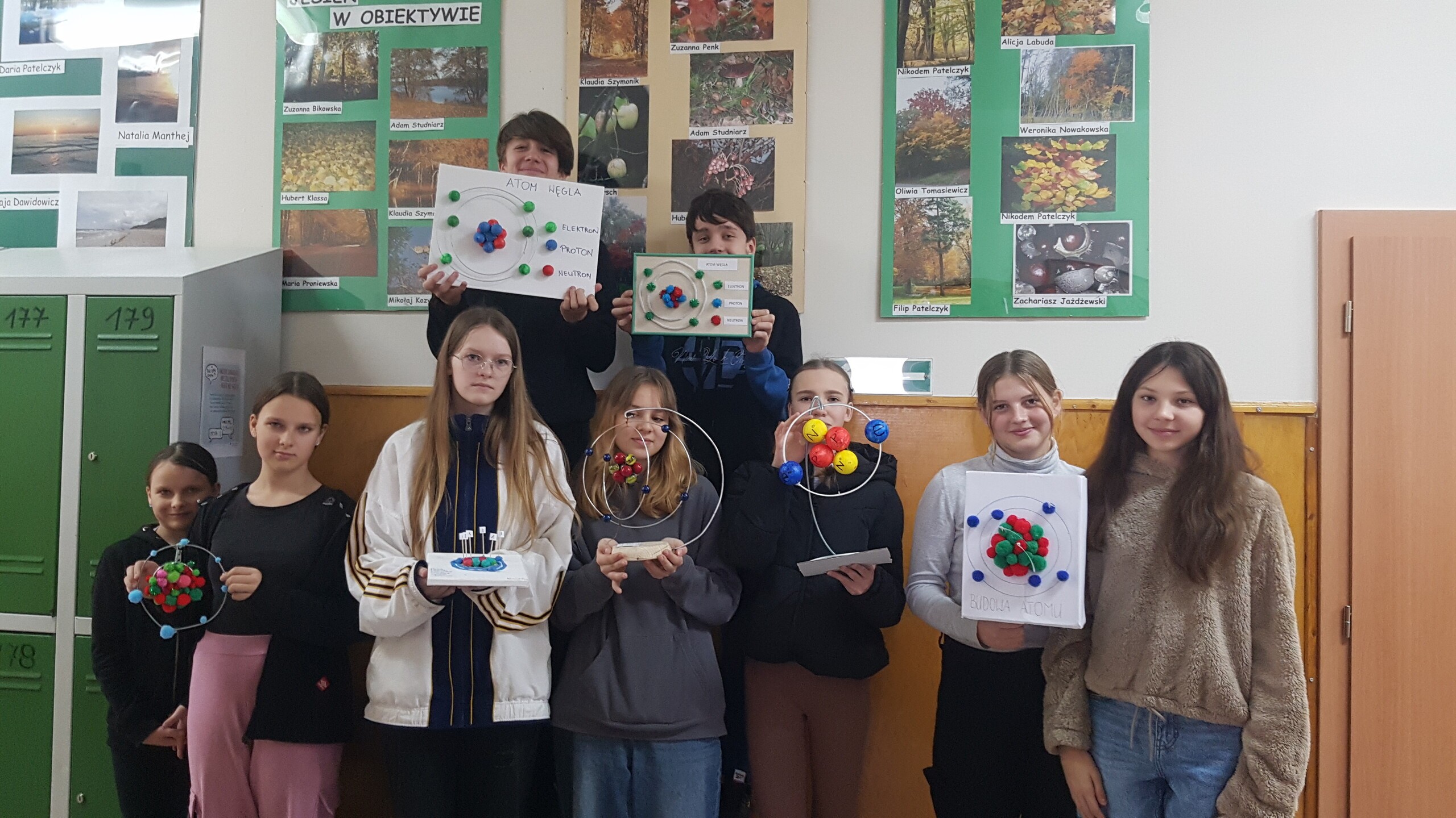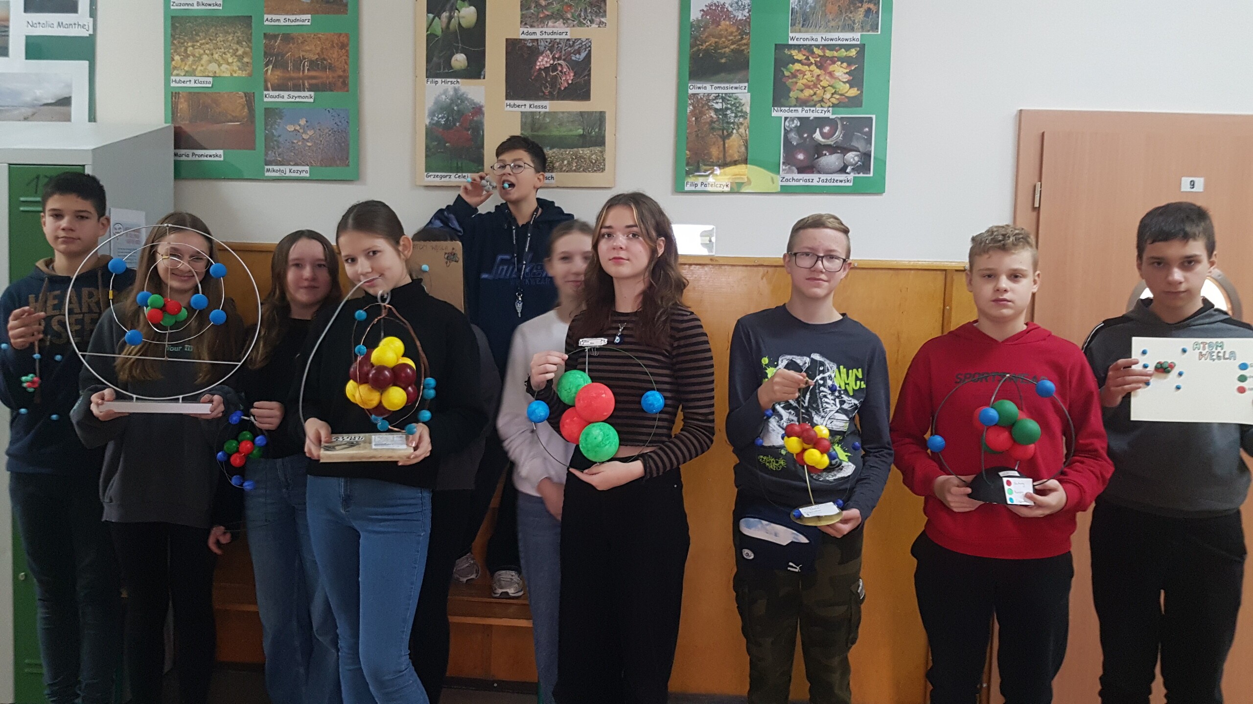 Uczniowie klas 7 zaczynają poznawać budowę materii. Jednym z trudniejszych do zrozumienia zagadnień jest budowa atomu. Aby lepiej zrozumieć jego budowę dzieci w grupach budowały przestrzenne modele budowy atomu. Wszystkie prace zostały wykonane starannie