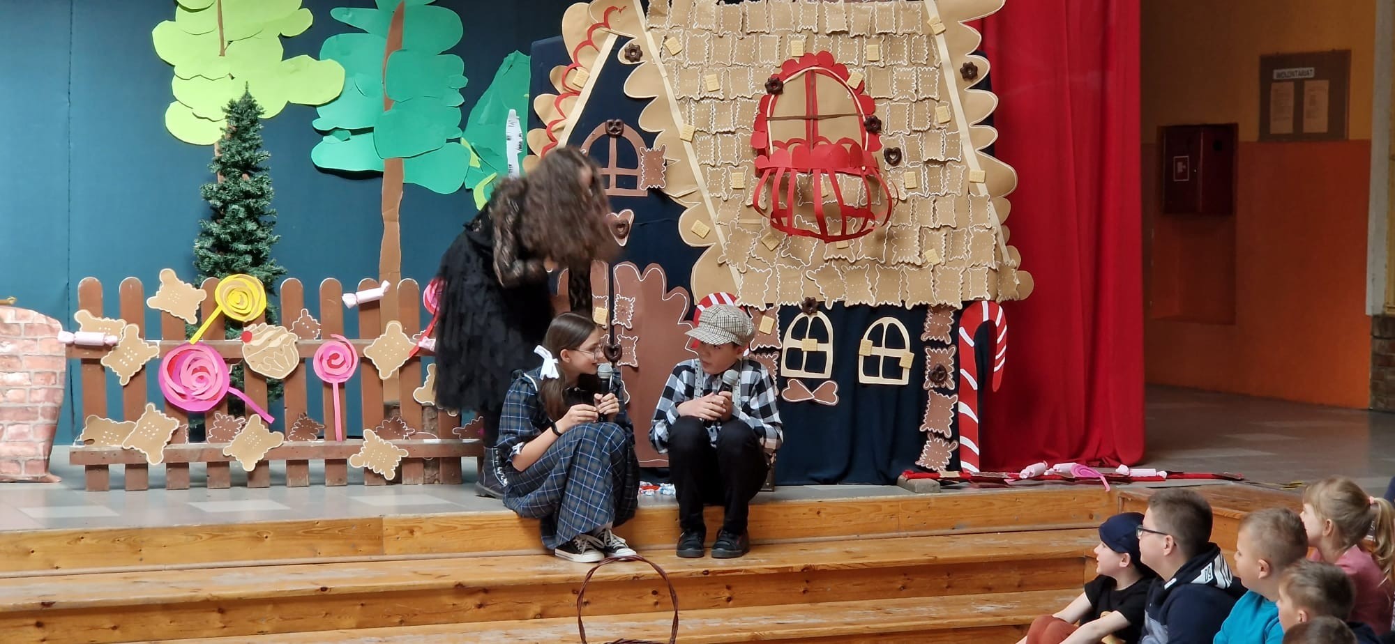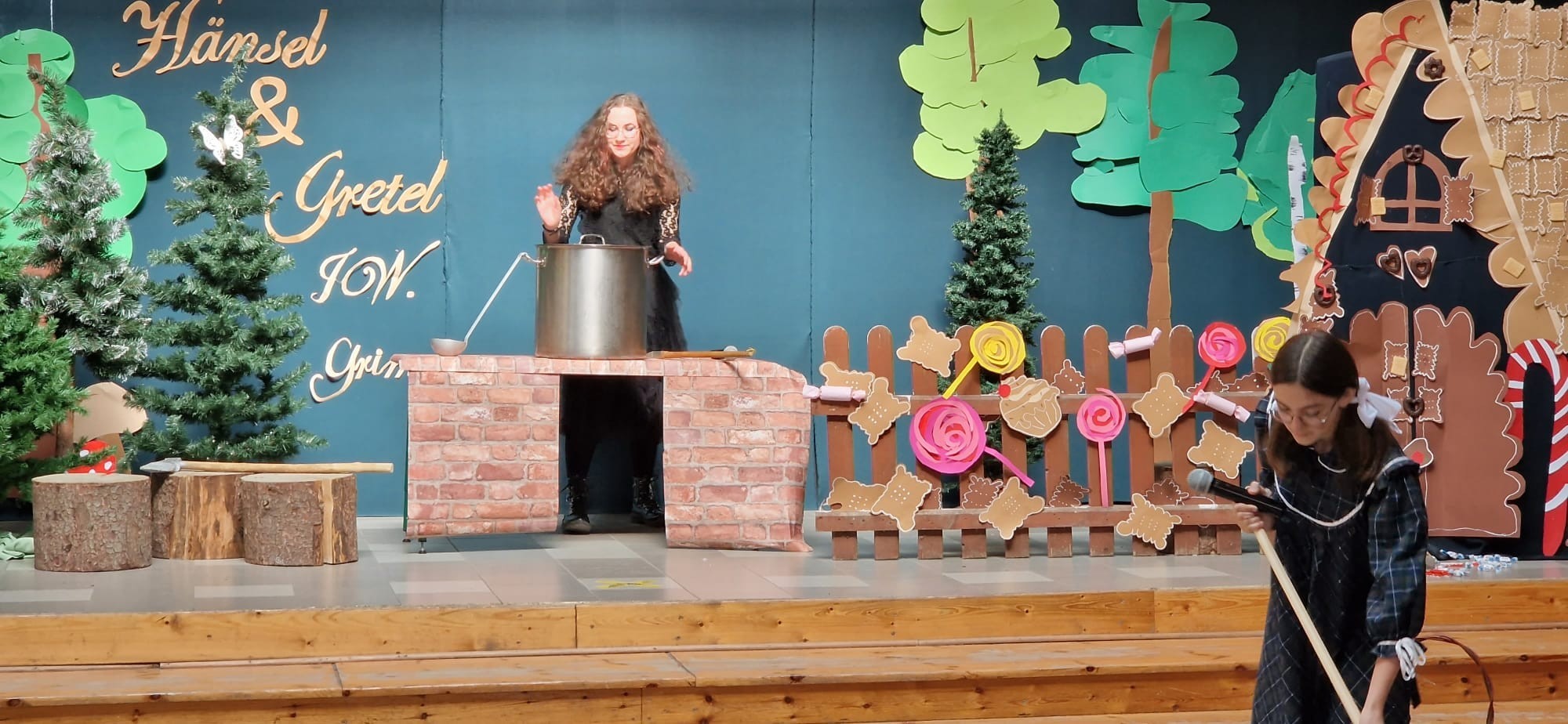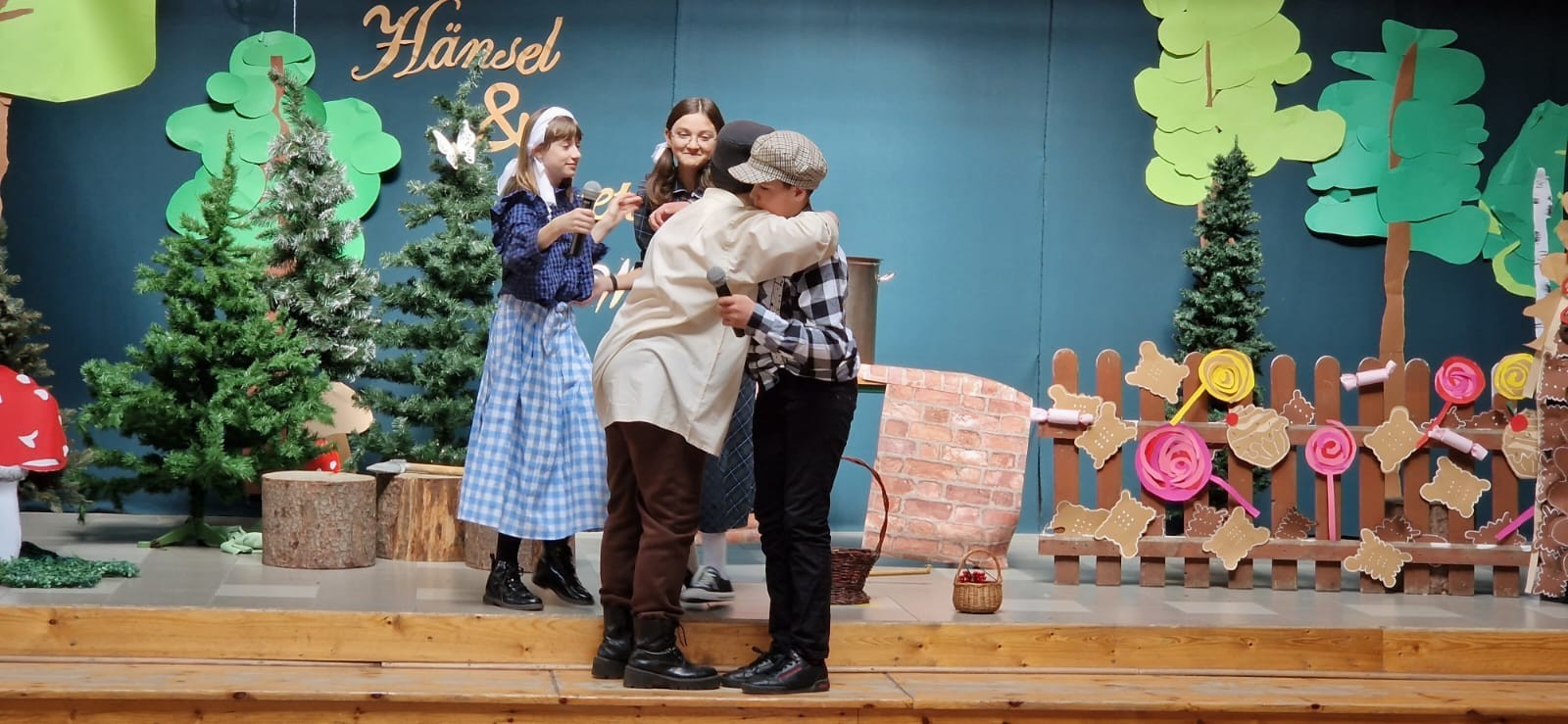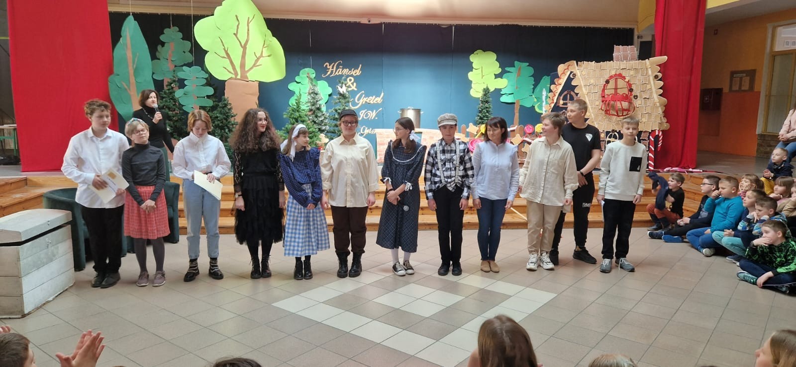 W ramach projektu, uczniowie kl.6a i 8a przygotowali inscenizację bajki „Hänsel und Gretel” Zachwycił nas popis ich umiejętności aktorskich, doskonałe przyswojenie tekstu (oczywiście w j.niemieckim ) na pamięć. Tytułowe role należały do: Hänsel –Antoni Narewski, Gretel-Magdalena Wójcik. W przezabawną, srogą Hexe wcieliła się Dorota Suszko Mutter-Daria Kublik, Vater-Jasmina Chmiel.Narracja bajki w wykonaniu Małgorzaty Kozłowskiej i Franciszka Wojtkiewicza. Sukces naszego przedstawienia to praca nad muzyką-Filipa Baranowskiego i Mikołaja Myszka, dekoracja-Marika Badziąg, Dawid Labuda, Paweł Dawidziuk, Tomasz Migowski i nieoceniona pomoc nad charakteryzacją, Małgorzaty Olszewskiej –prawej ręki reżysera. Nasza praca, długi czas przygotowań-opłacały się. Widownia szkolna nagrodziła nas gromkimi brawami, były nawet owacje na stojąco! Dziękujemy!