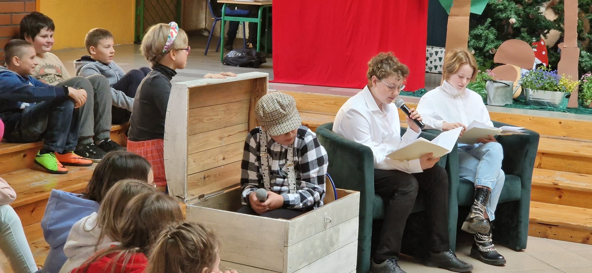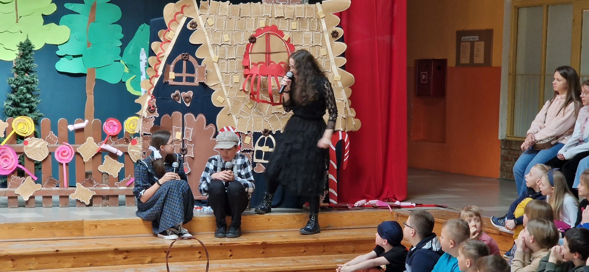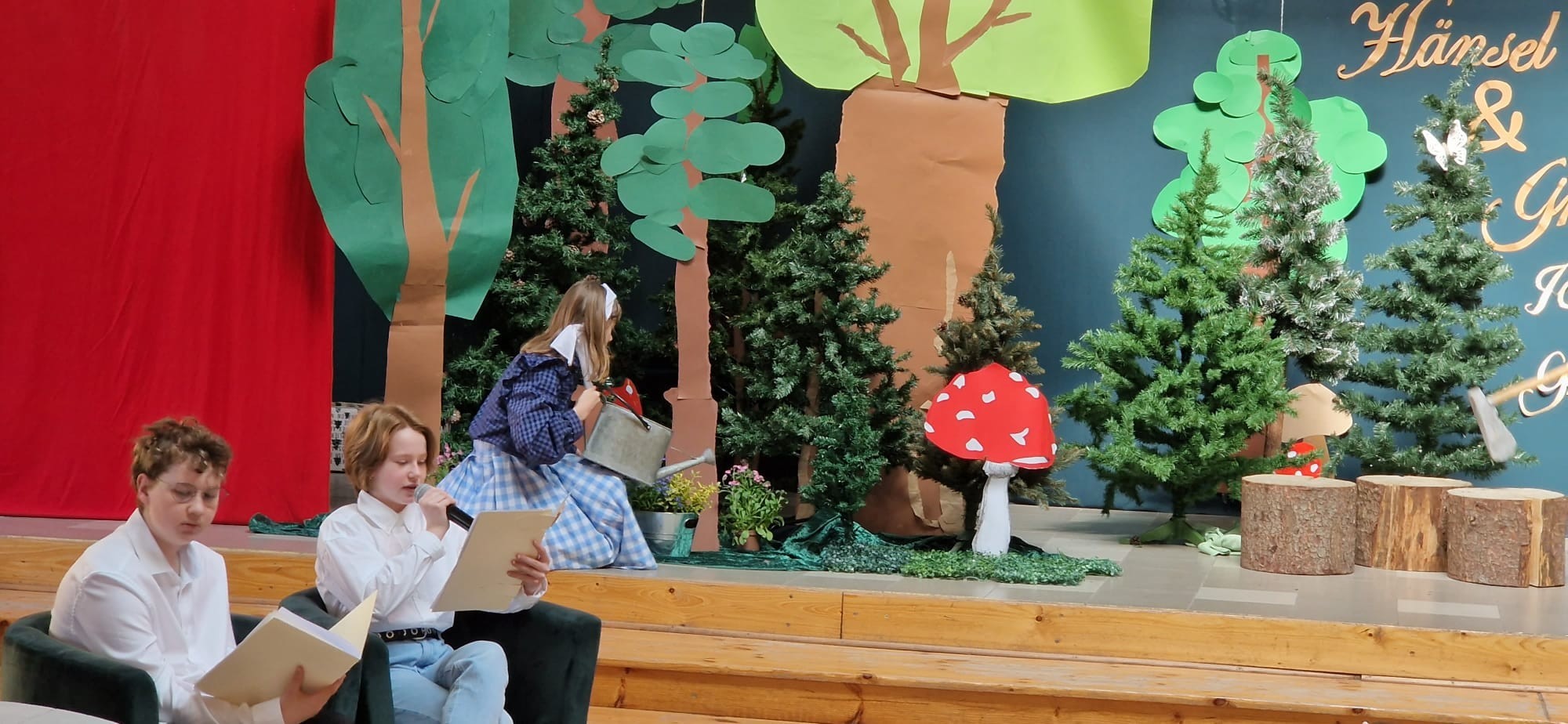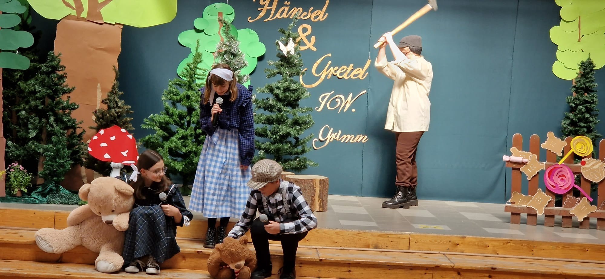 W ramach projektu, uczniowie kl.6a i 8a przygotowali inscenizację bajki „Hänsel und Gretel” Zachwycił nas popis ich umiejętności aktorskich, doskonałe przyswojenie tekstu (oczywiście w j.niemieckim ) na pamięć. Tytułowe role należały do: Hänsel –Antoni Narewski, Gretel-Magdalena Wójcik. W przezabawną, srogą Hexe wcieliła się Dorota Suszko Mutter-Daria Kublik, Vater-Jasmina Chmiel.Narracja bajki w wykonaniu Małgorzaty Kozłowskiej i Franciszka Wojtkiewicza. Sukces naszego przedstawienia to praca nad muzyką-Filipa Baranowskiego i Mikołaja Myszka, dekoracja-Marika Badziąg, Dawid Labuda, Paweł Dawidziuk, Tomasz Migowski i nieoceniona pomoc nad charakteryzacją, Małgorzaty Olszewskiej –prawej ręki reżysera. Nasza praca, długi czas przygotowań-opłacały się. Widownia szkolna nagrodziła nas gromkimi brawami, były nawet owacje na stojąco! Dziękujemy!