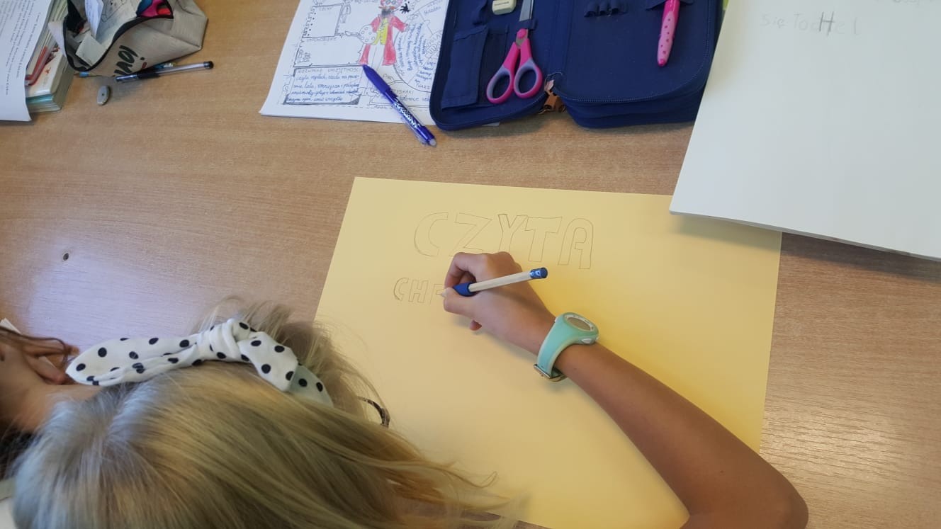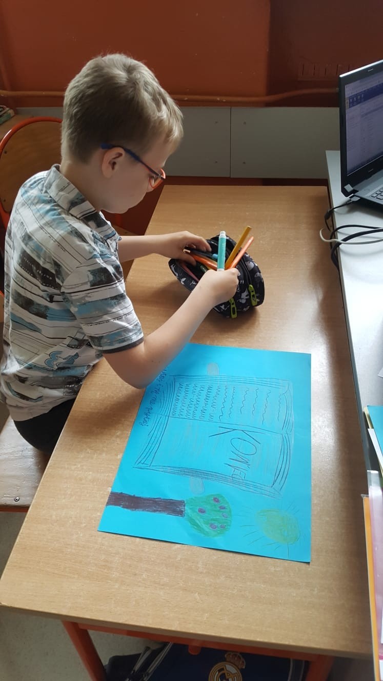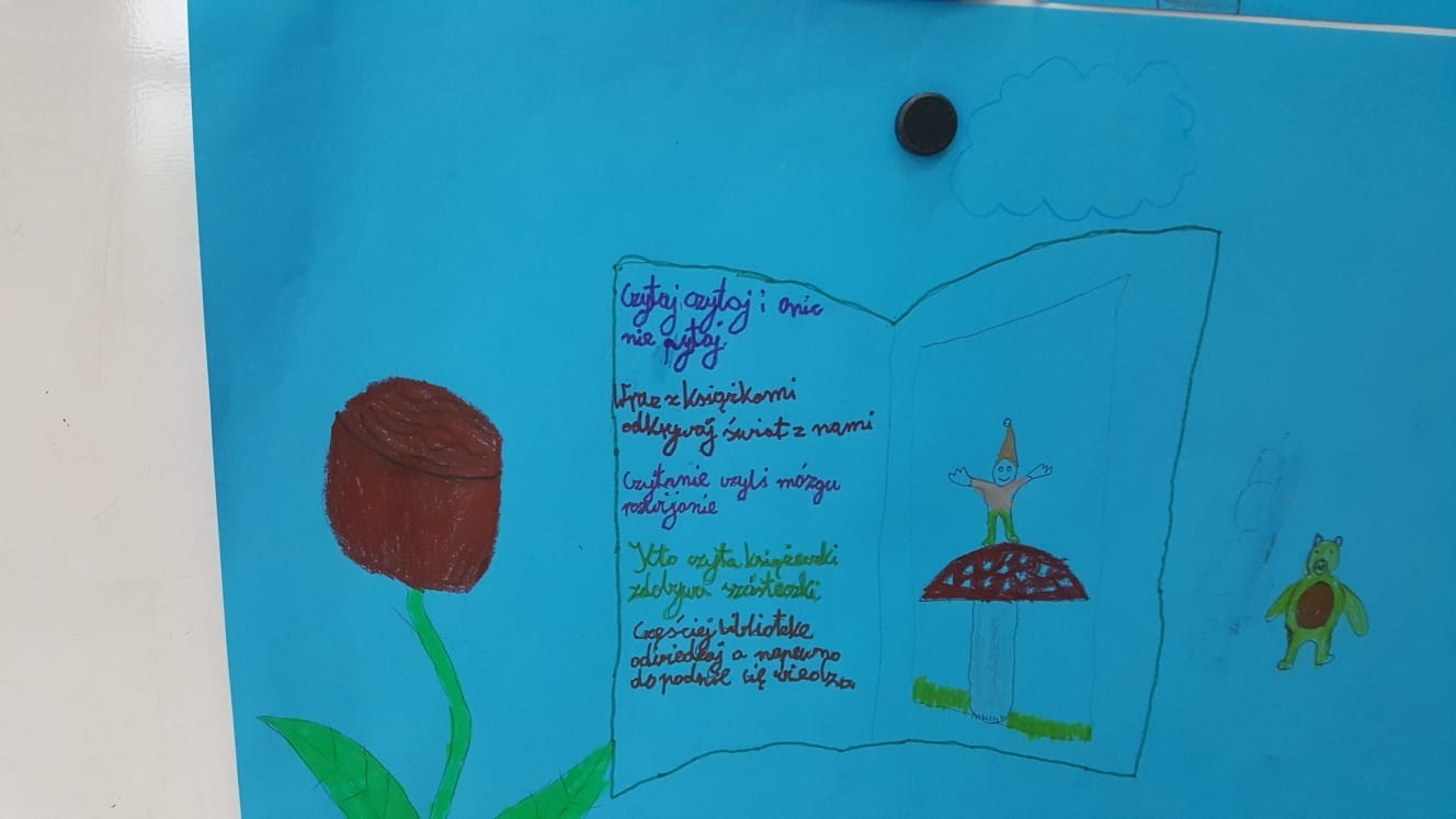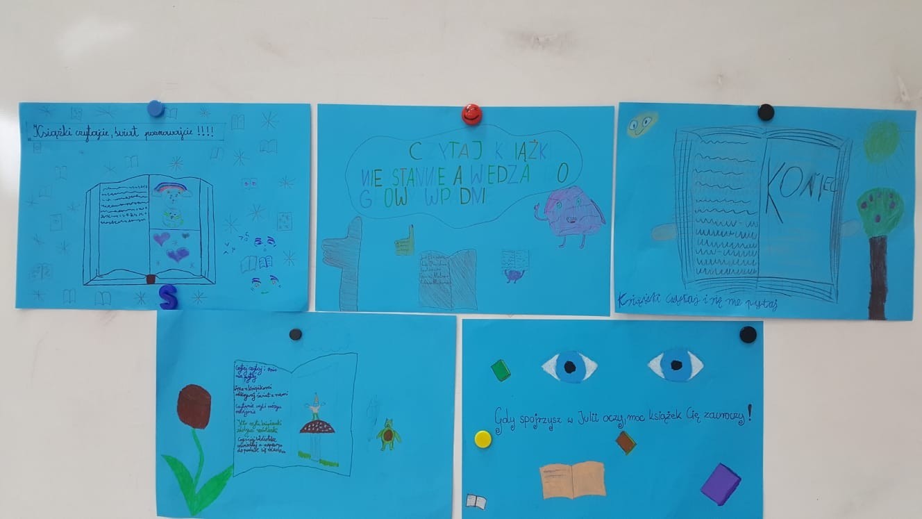 W klasach IV-V uczniowie zapoznali się z tekstami Michała Rusinka, a następnie tworzyli plakaty zachęcające do czytania.