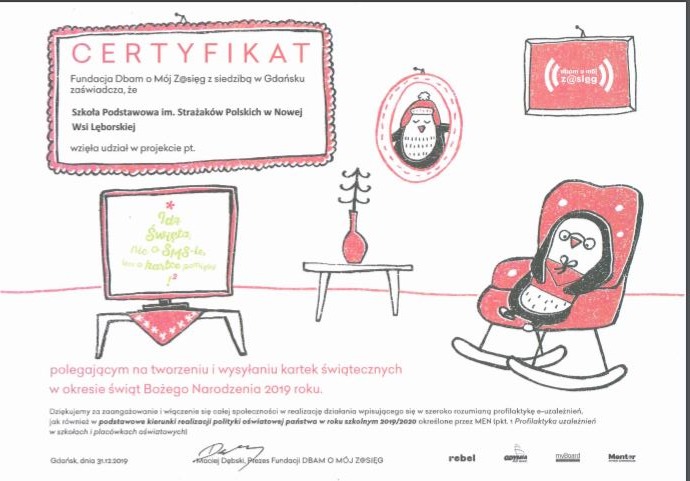 - Otrzymaliśmy certyfikat udziału w projekcie "IDĄ ŚWIĘTA, NIE O SMS-IE, LECZ O KARTCE PAMIĘTAJ".
