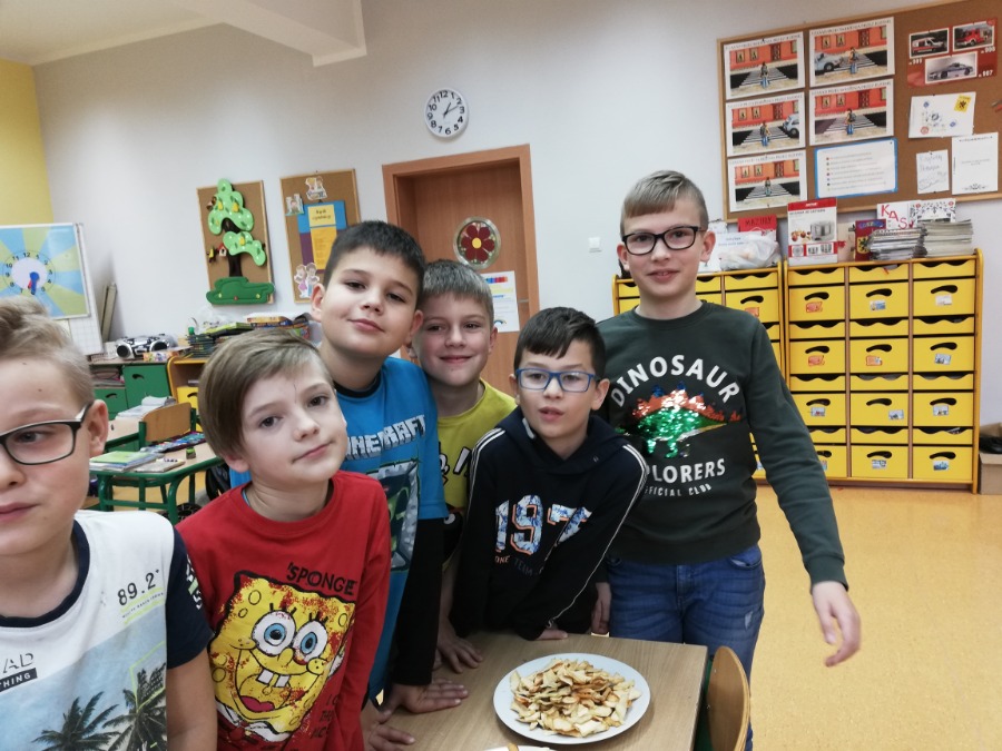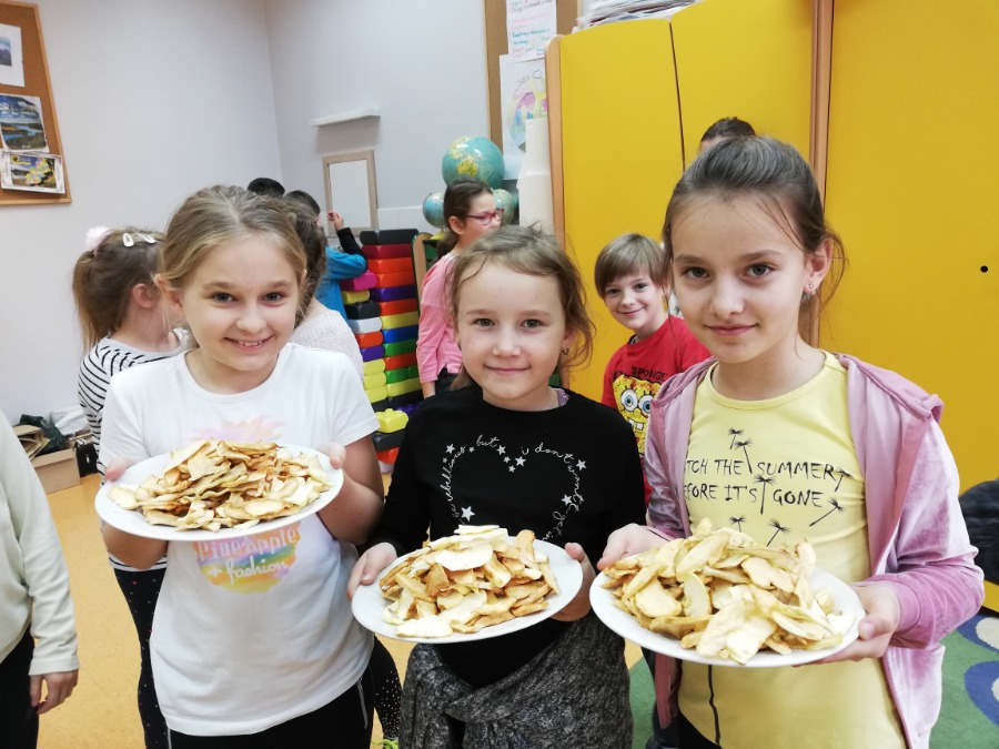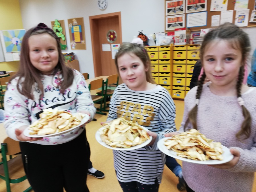 Uczniowie klasy 3b w ramach projektu Szkoła promująca zdrowie suszyli owocowe chipsy. Było pysznie i zdrowo.