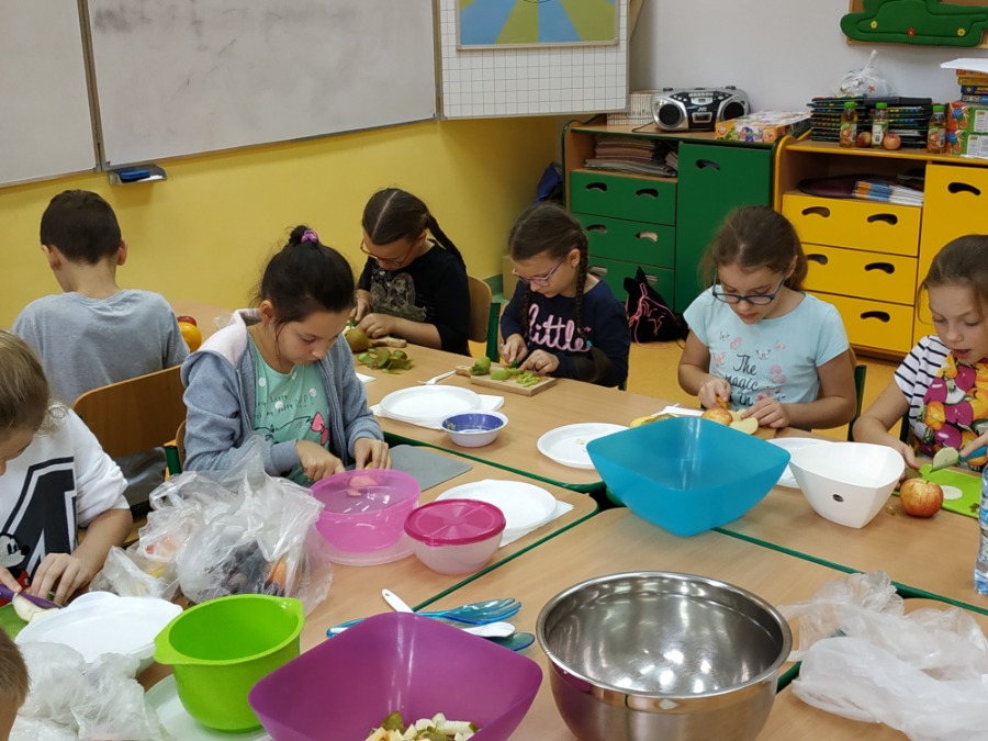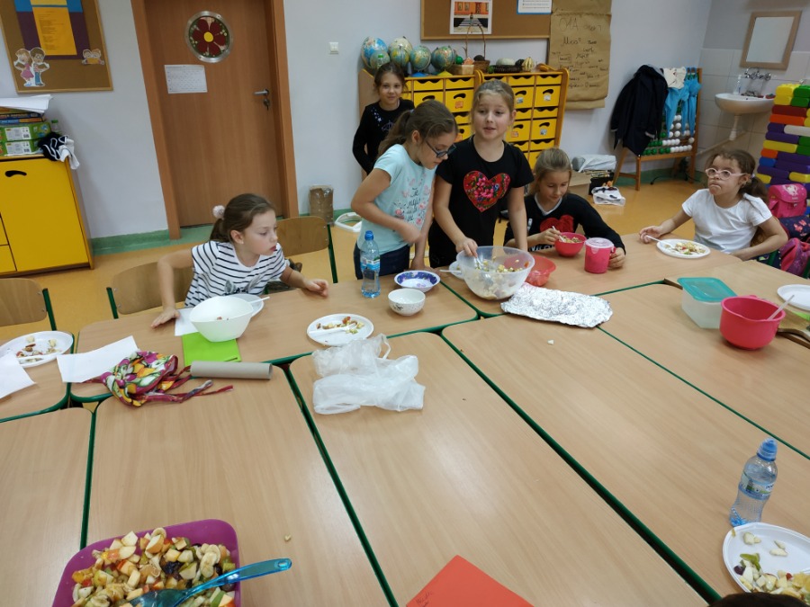 Uczniowie klasy 3a przygotowywali wspólnie sałatkę owocową. Każdy przyniósł ze sobą owoce, które lubi najbardziej. Po umyciu rąk i owoców przystąpiliśmy do pracy. Na stołach królowały jabłuszka, gruszki, banany, winogrona, kiwi, pomarańcze, mandarynki, a nawet arbuz czy też grapefruit. Po pokrojeniu owoców wymieszaliśmy je w dużych miskach. I w końcu nastąpił ten wyczekiwany moment…. zajadanie przepysznych sałatek ze smakiem. I tak tym miłym, zdrowym i owocowym akcentem zakończyliśmy tydzień wytężonej pracy w szkole.