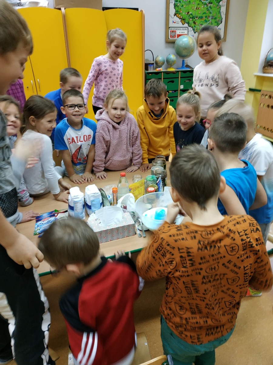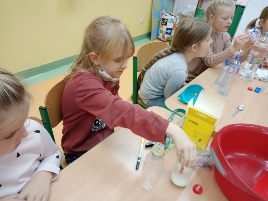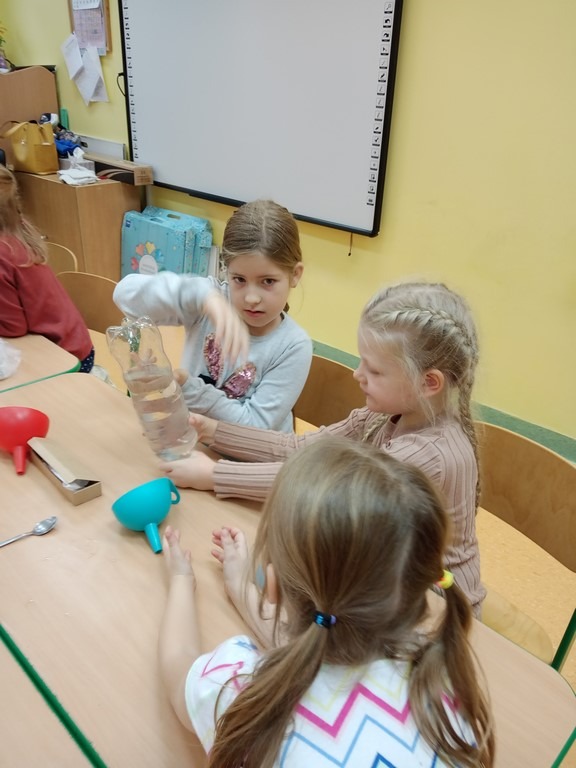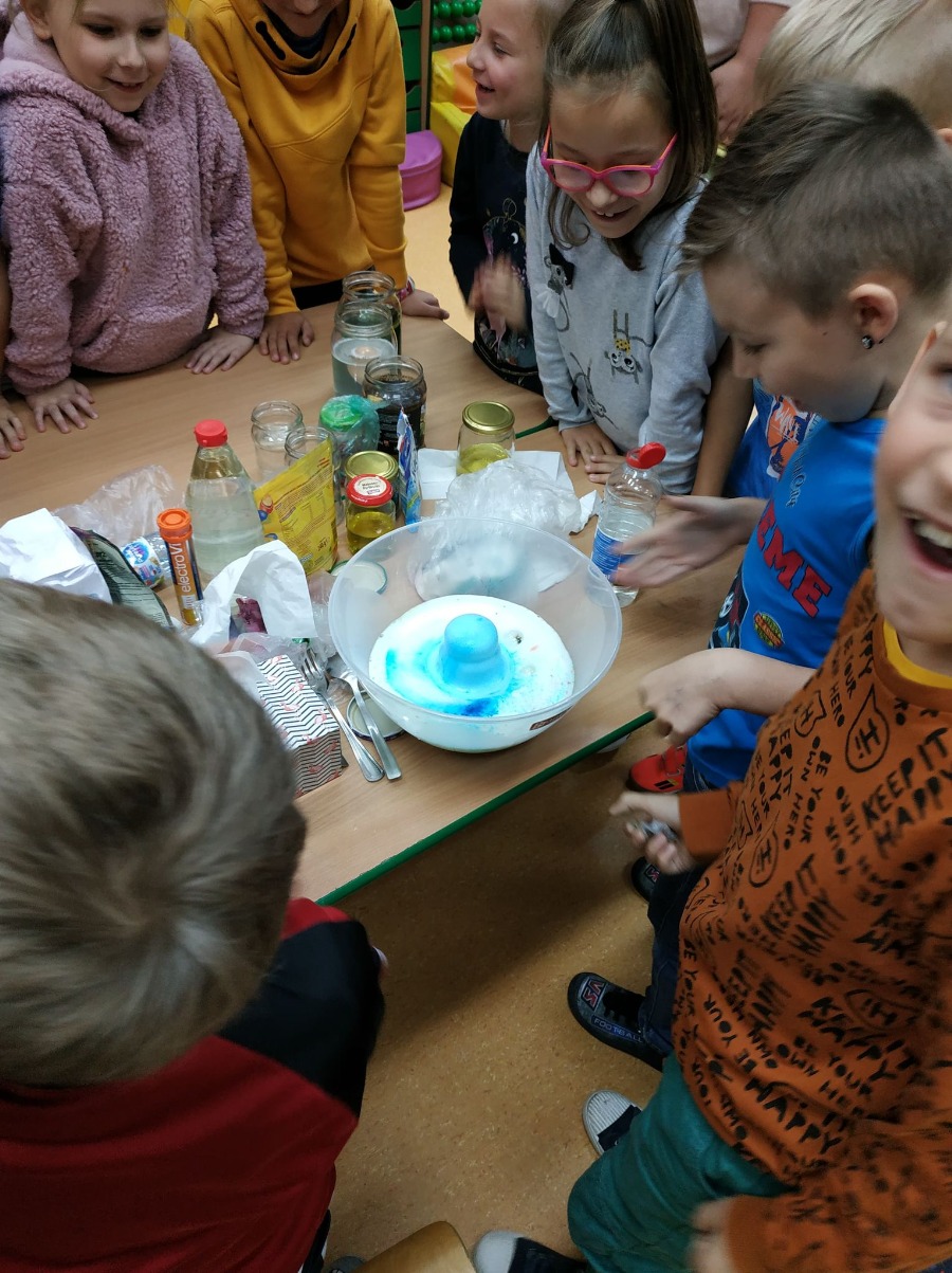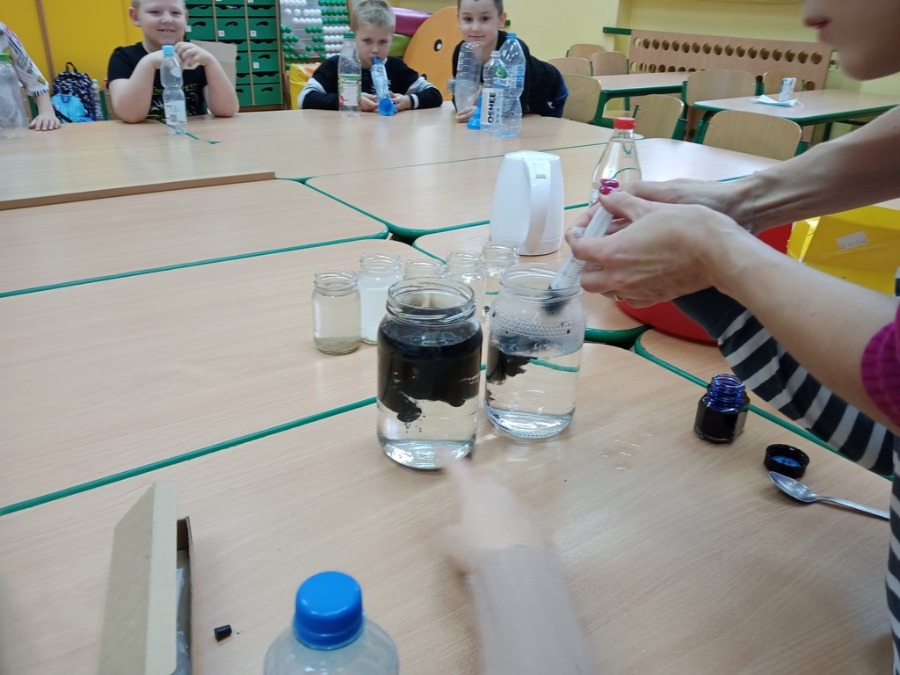 Dzisiaj dzieci z klas pierwszych zostali ,,Badaczami wody. Poznaliśmy właściwości wody oraz do czego jest potrzebna. Odpowiedzieliśmy sobie na pytanie ,,Dlaczego woda jest cennym skarbem? . Przy okazji eksperymentowaliśmy z wodą, obserwując jak inne składniki przyczyniają się do ciekawych zmian w połączeniu z wodą. Wykonaliśmy tęczę z cukierków, burzę w słoiku, olej, ocet, kawa i woda- co jest lżejsze, a co cięższe. Nie mogło zabraknąć wybuchającego wulkanu. Był też eksperyment ze znikająca monetą i znikającym atramentem. Sprawdzaliśmy, czy wraz ze zmianą położenia butelki zmienia się ilość wlanej do niej wody. Obserwowaliśmy zmiany towarzyszące przelewaniu wody – ile się zmieści wody w butelce. Formułowaliśmy również wnioski wynikające z doświadczenia – czy produkty takie, jak piasek, sól, cukier, mąka, ziarenka pieprzu rozpuszczą się w wodzie. Na koniec każde dziecko mogło spróbować swoich sił w uformowaniu kuli z wody i mąki ziemniaczanej. Dzieci uważnie przyglądały się wszystkim doświadczeniom. Uważamy te lekcje za przydatne i bardzo ciekawe.