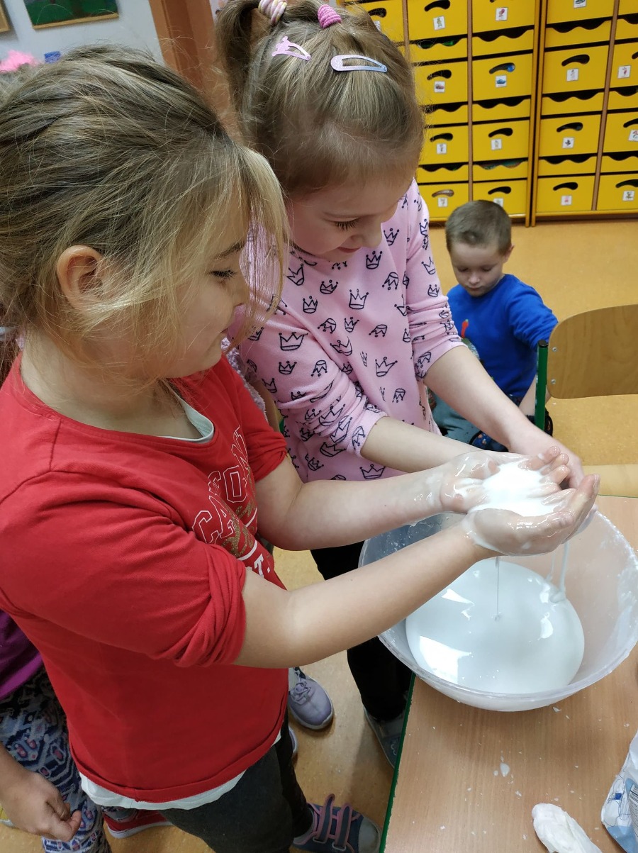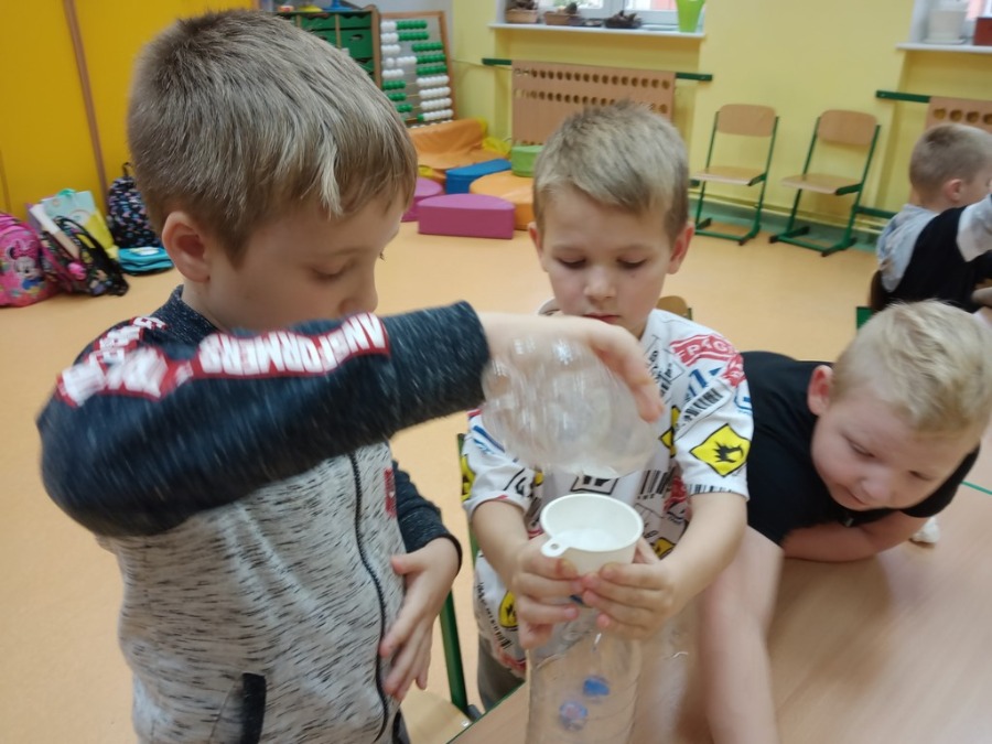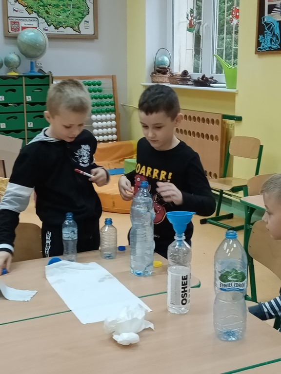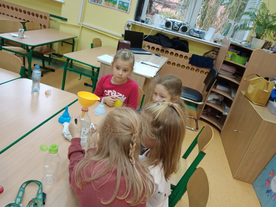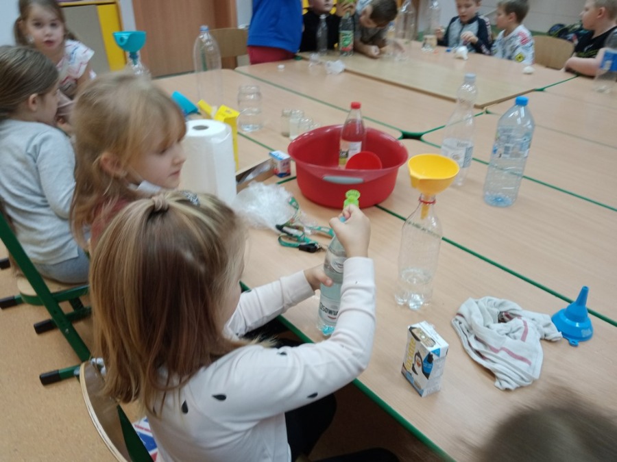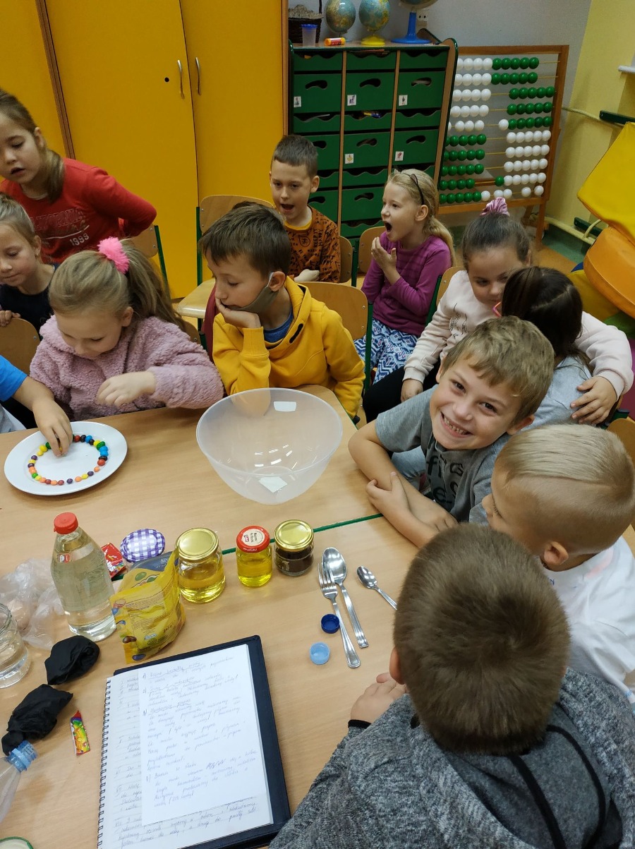 Dzisiaj dzieci z klas pierwszych zostali ,,Badaczami wody. Poznaliśmy właściwości wody oraz do czego jest potrzebna. Odpowiedzieliśmy sobie na pytanie ,,Dlaczego woda jest cennym skarbem? . Przy okazji eksperymentowaliśmy z wodą, obserwując jak inne składniki przyczyniają się do ciekawych zmian w połączeniu z wodą. Wykonaliśmy tęczę z cukierków, burzę w słoiku, olej, ocet, kawa i woda- co jest lżejsze, a co cięższe. Nie mogło zabraknąć wybuchającego wulkanu. Był też eksperyment ze znikająca monetą i znikającym atramentem. Sprawdzaliśmy, czy wraz ze zmianą położenia butelki zmienia się ilość wlanej do niej wody. Obserwowaliśmy zmiany towarzyszące przelewaniu wody – ile się zmieści wody w butelce. Formułowaliśmy również wnioski wynikające z doświadczenia – czy produkty takie, jak piasek, sól, cukier, mąka, ziarenka pieprzu rozpuszczą się w wodzie. Na koniec każde dziecko mogło spróbować swoich sił w uformowaniu kuli z wody i mąki ziemniaczanej. Dzieci uważnie przyglądały się wszystkim doświadczeniom. Uważamy te lekcje za przydatne i bardzo ciekawe.